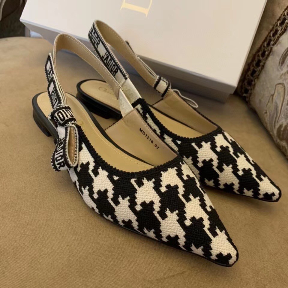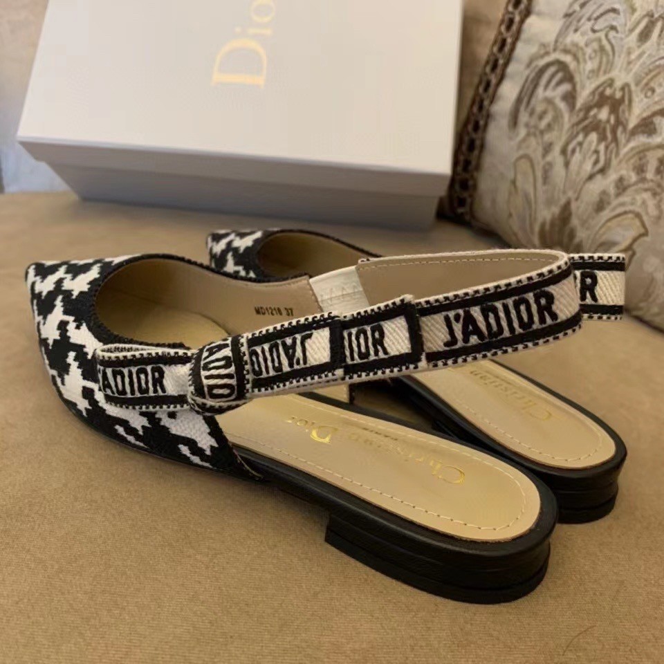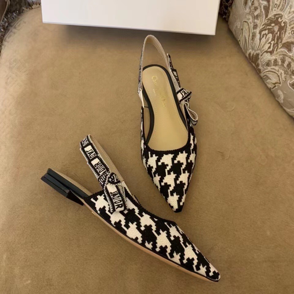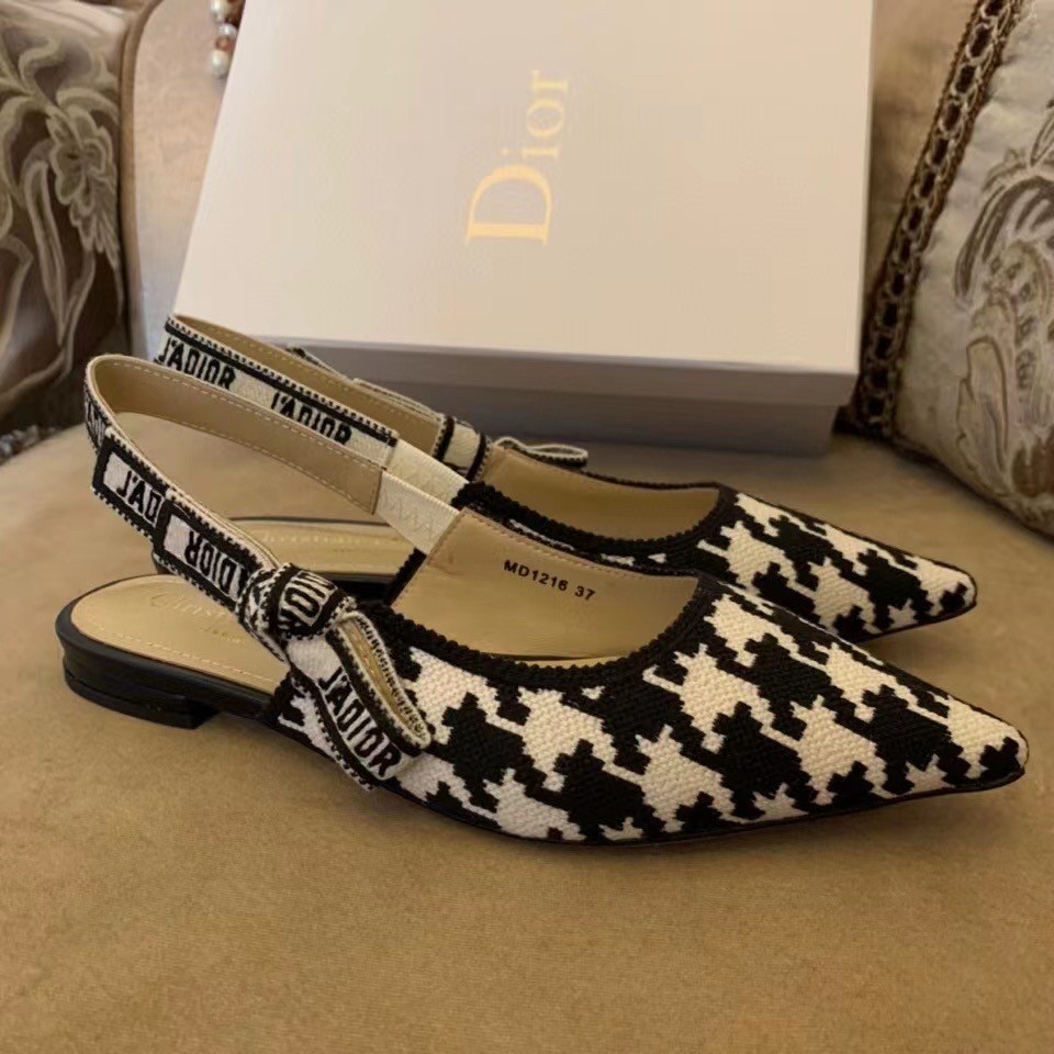 The J'Adior slingback ballerina flat is a prime example of Dior's savoir-faire. Elegantly playing on the House codes, this embroidered cotton style features a macro version of the House's iconic black and white Houndstooth motif. The two-tone 'J'ADIOR' signature on the embroidered cotton ribbon and flat bow complete this refined and elegant style.