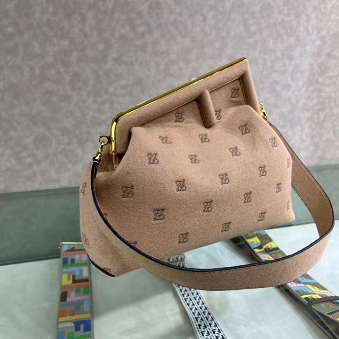 Medium Fendi First bag made of beige flannel, embroidered with Karligraphy motif. Oversized metal F clasp bound in tone on tone flannel. Features a leather-lined internal compartment and gold-finish metalware. Can be carried by hand as a clutch or worn on the shoulder thanks to the detachable flannel shoulder strap.