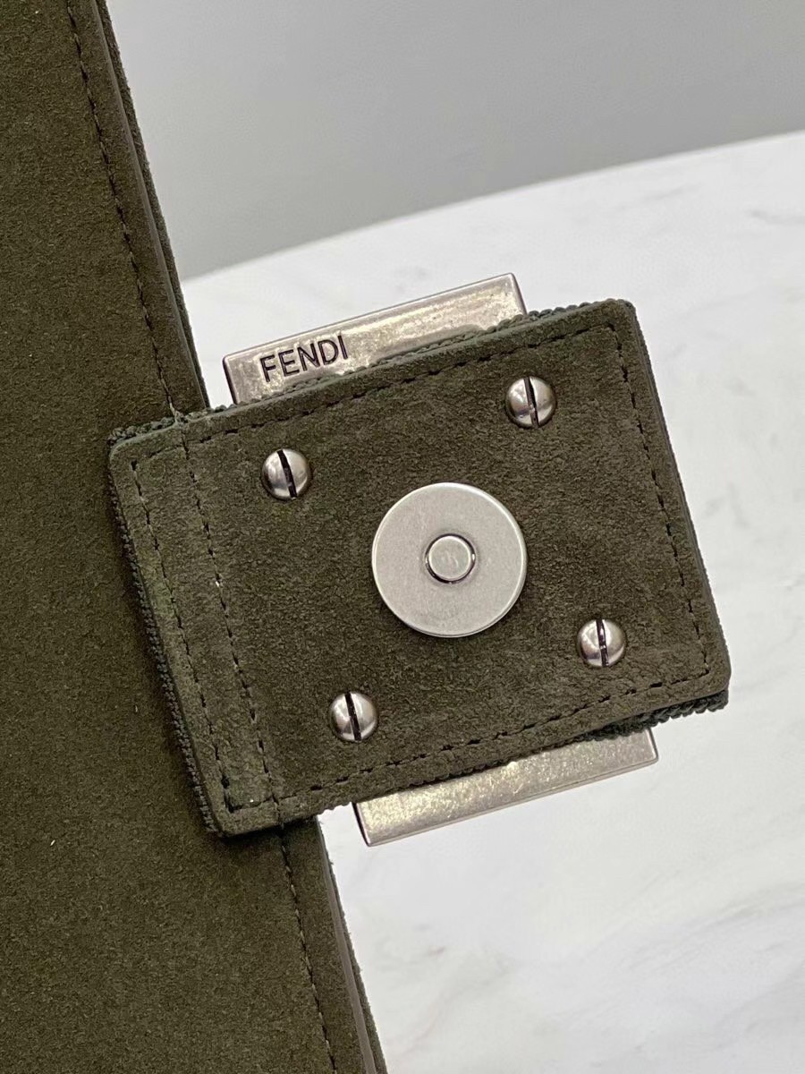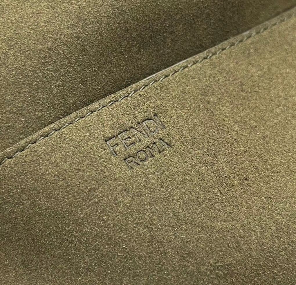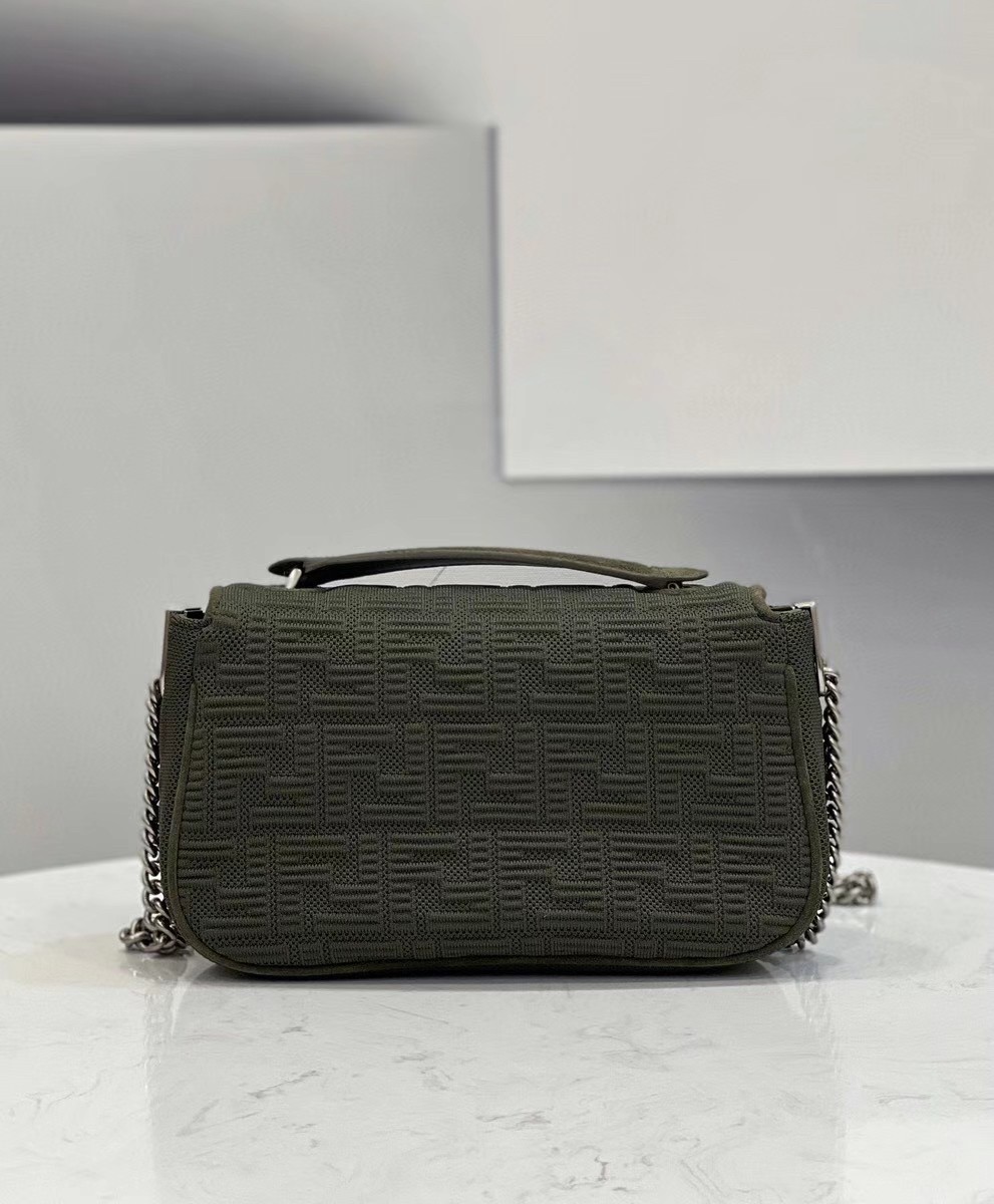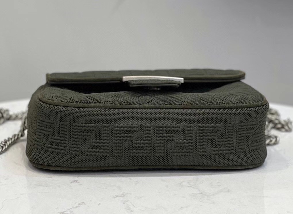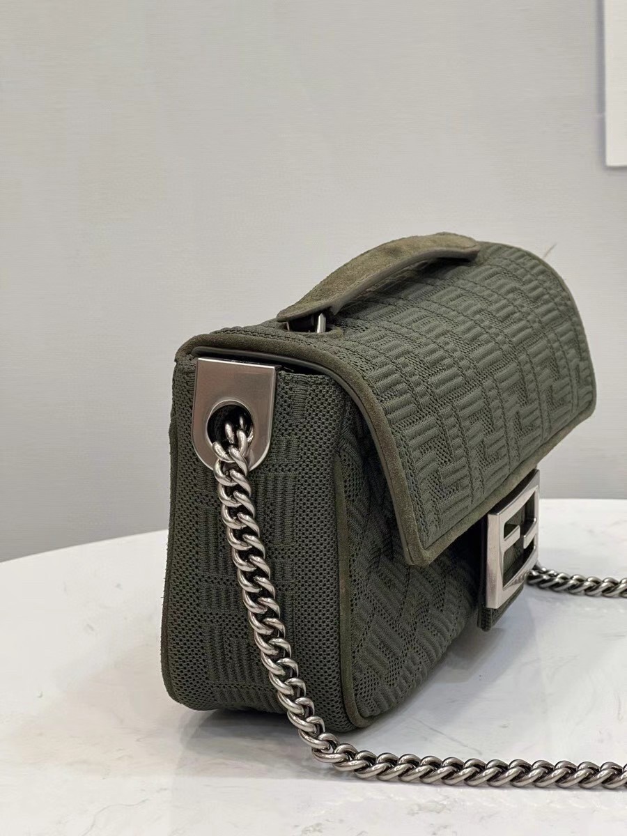 Iconic medium Baguette bag with chain shoulder strap, made of technical mesh with a 3D-texture FF motif. Decorated with an FF clasp. Featuring a front flap, magnetic clasp, lined internal compartment with flat pocket and vintage palladium-finish metalware. Can be carried by hand or over the shoulder thanks to the sliding-chain shoulder strap.