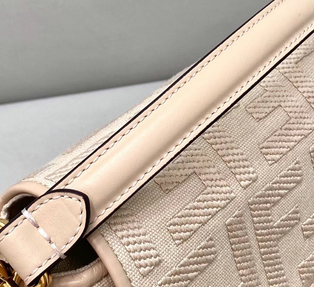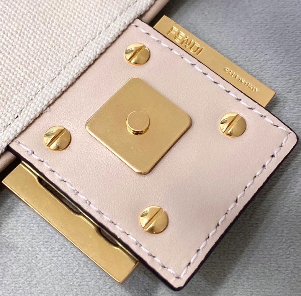 Iconic medium Baguette bag made of canvas with an embossed FF motif created with tone on tone embroidery, trimmed in leather and adorned with an FF clasp. Featuring a front flap, magnetic clasp, internal compartment with zipper pocket and vintage gold-finish metalware. The bag can be carried by hand, or worn either on the shoulder or cross-body thanks to the leather handle and Pequin canvas shoulder strap, both detachable.