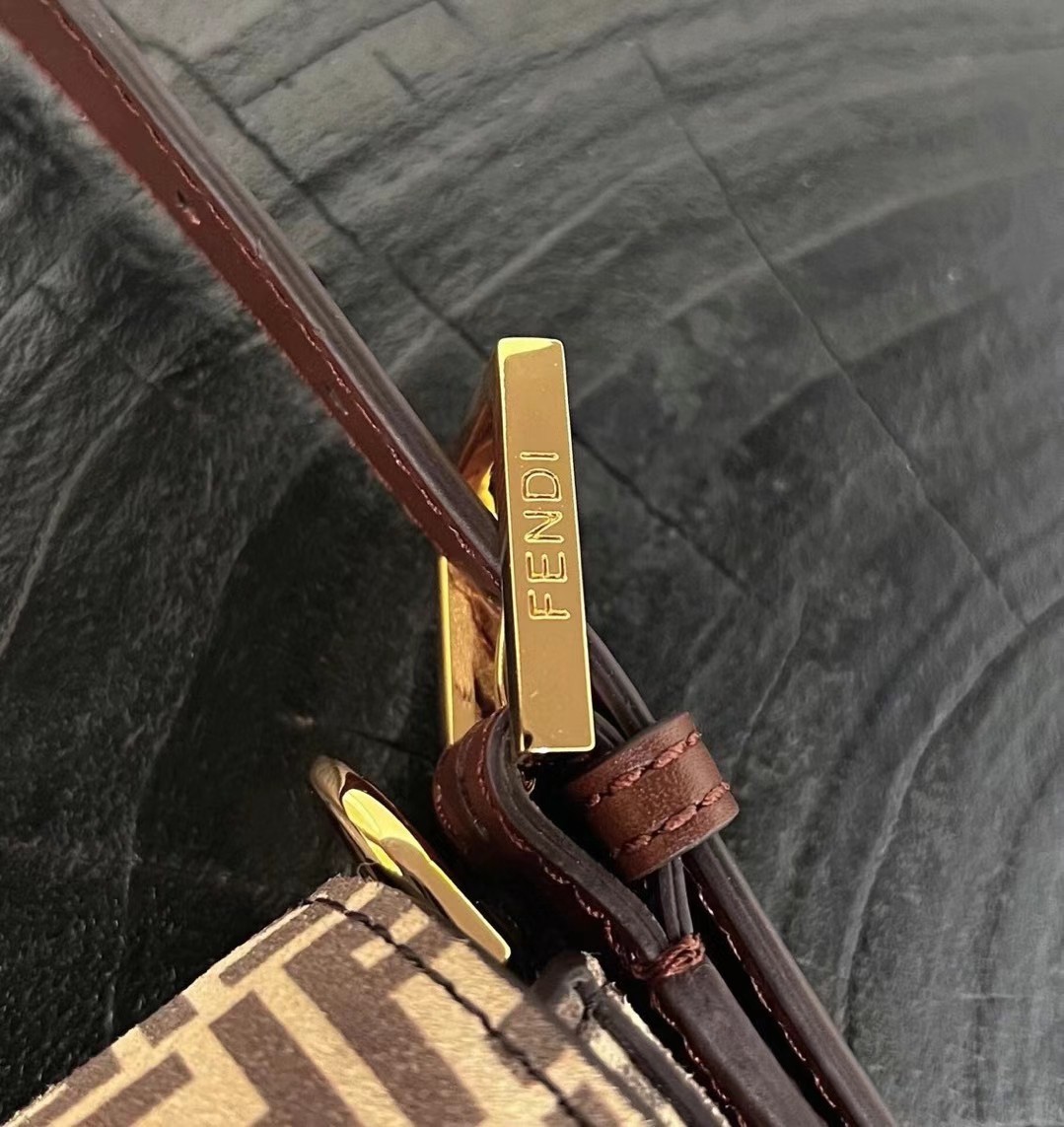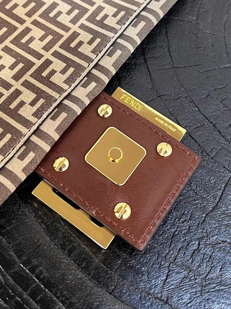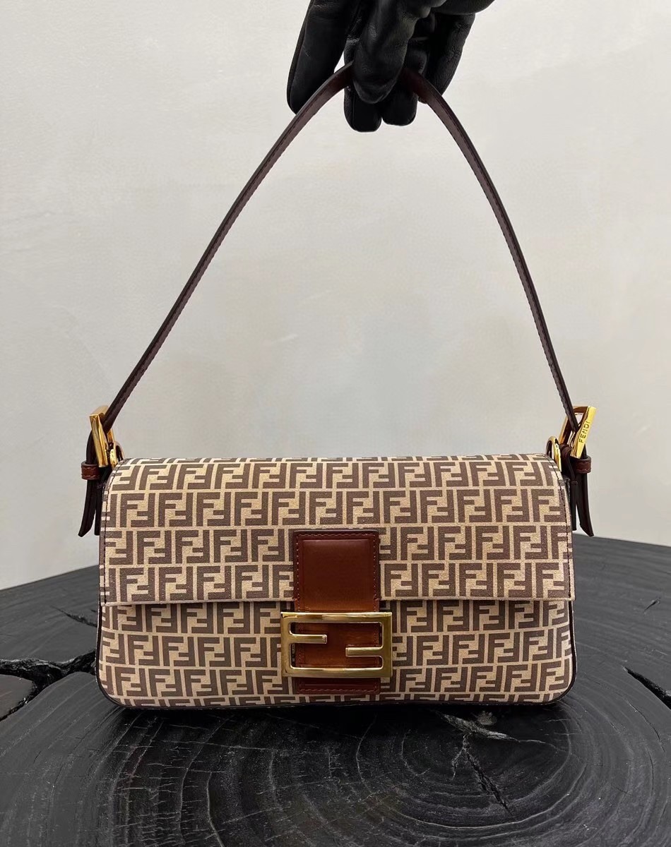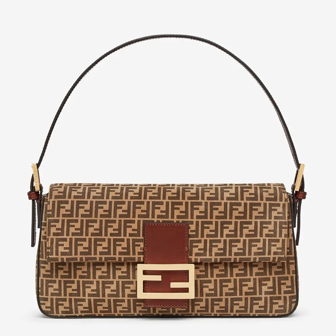 Medium Baguette 1997 bag made of split leather with beige FF print, embellished with an FF clasp. This style is a re-release of the first Fendi Baguette bag created in 1997, from which it takes its name and iconic ‘under the arm’ design. Features a front flap, brown leather details and magnetic clasp. Lined internal compartment with zip pocket and gold-finish metalware. It can be carried on the shoulder or in the hand, or as a pochette thanks to the folding, detachable handle.
