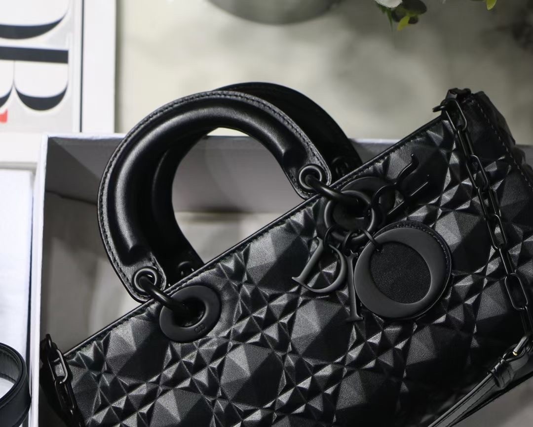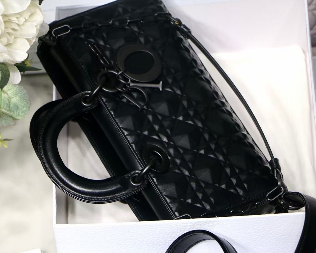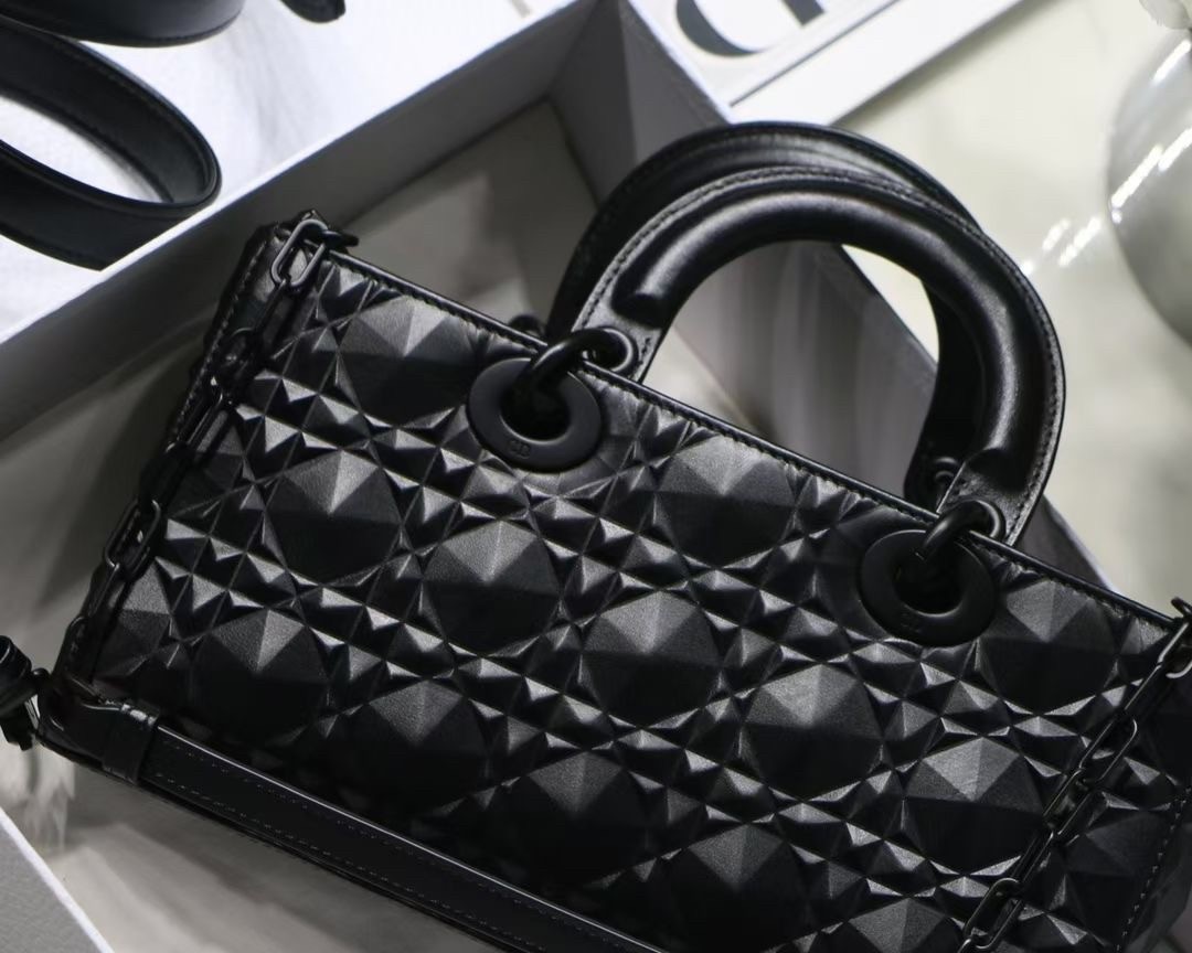 The Lady D-Joy bag captures the House's vision of elegance and beauty by showcasing the iconic streamlined aesthetic of the Lady Dior line. Crafted in Cannage calfskin featuring a Diamond motif, the refined and timeless style is enhanced by tonal matte metal 'D.I.O.R.' charms elegantly embellishing its silhouette. Featuring one removable chain shoulder strap and another adjustable and removable leather shoulder strap, the Lady D-Joy bag can be carried by hand, worn over the shoulder or crossbody as a daily companion.