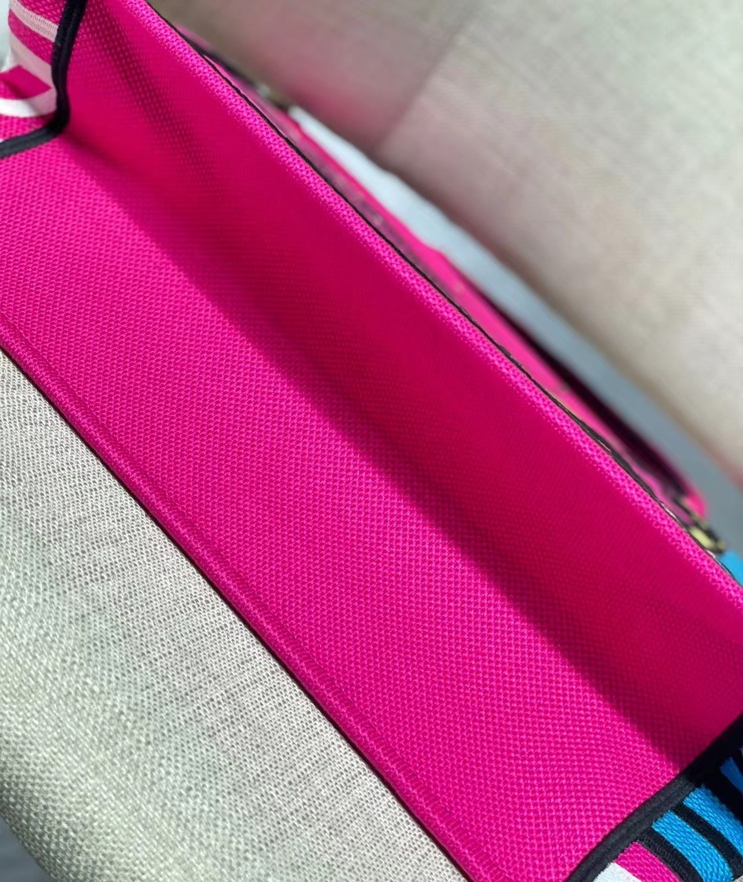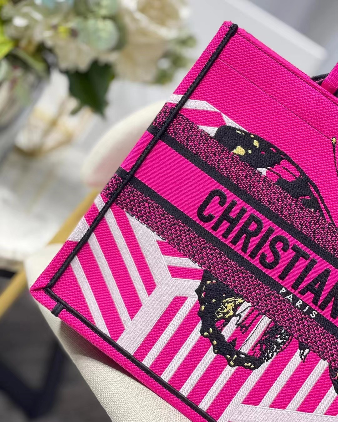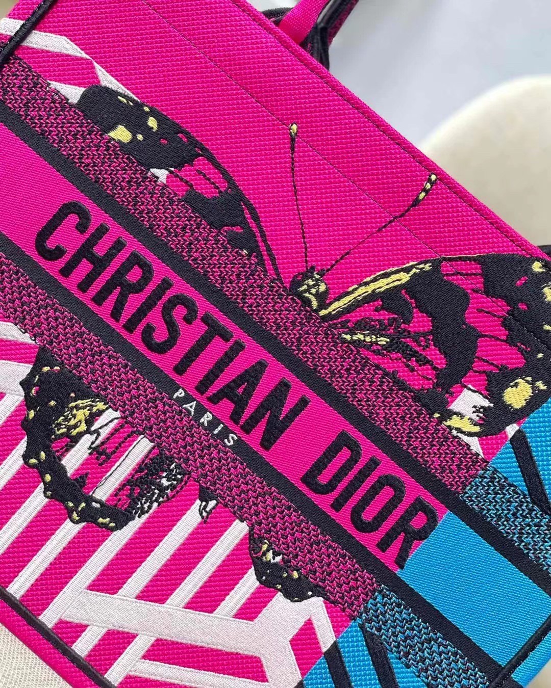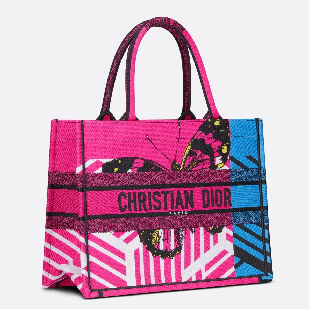 Introduced by Maria Grazia Chiuri, Creative Director of Christian Dior, the Dior Book Tote has become a staple of the Dior aesthetic. Designed to hold the daily essentials, the style is fully embroidered with a bright blue and pink D-Jungle Pop motif that embodies the collection's colorful pop inspiration. Adorned with the 'CHRISTIAN DIOR PARIS' signature on the front, the medium tote exemplifies the House's signature savoir-faire and may be carried by hand or worn over the shoulder.