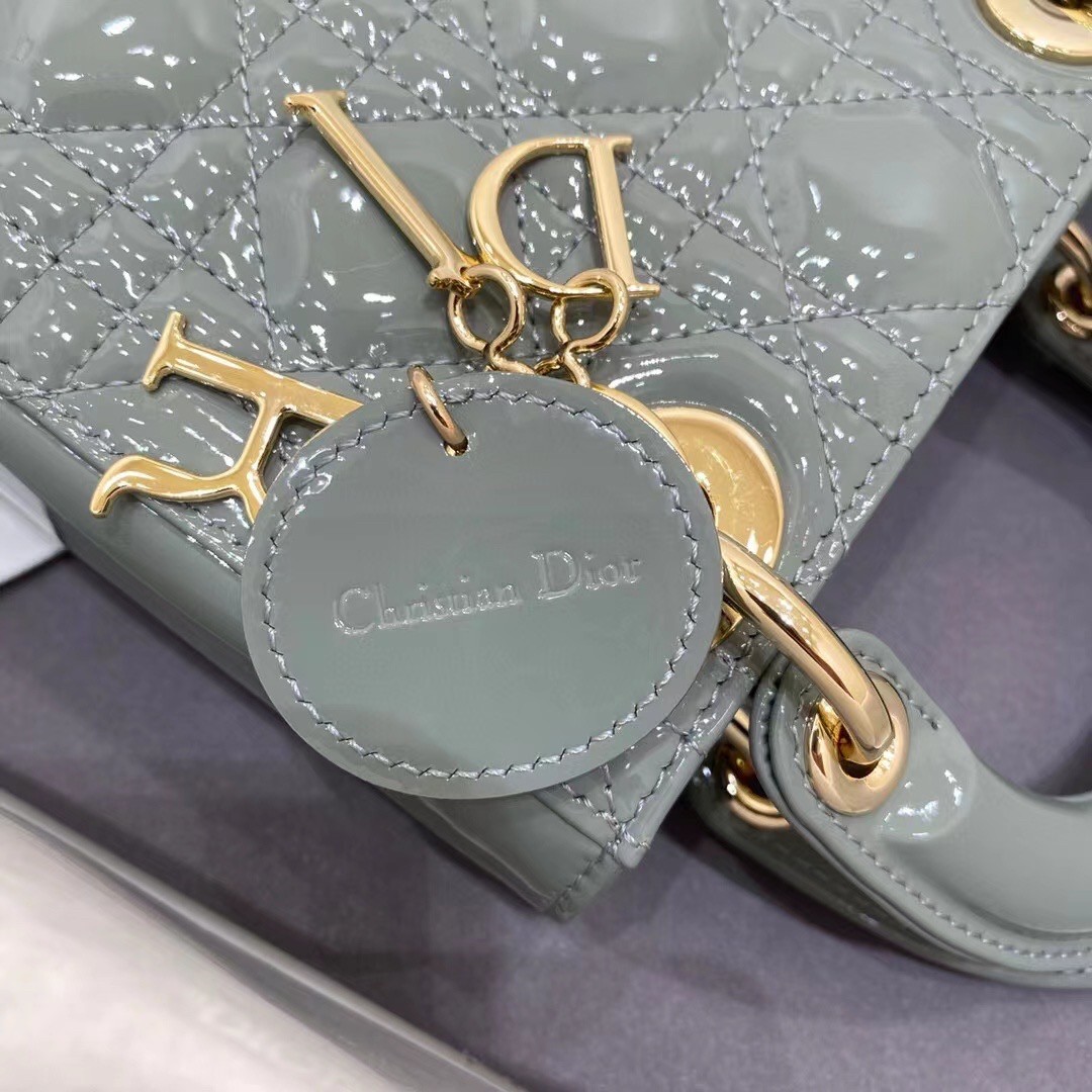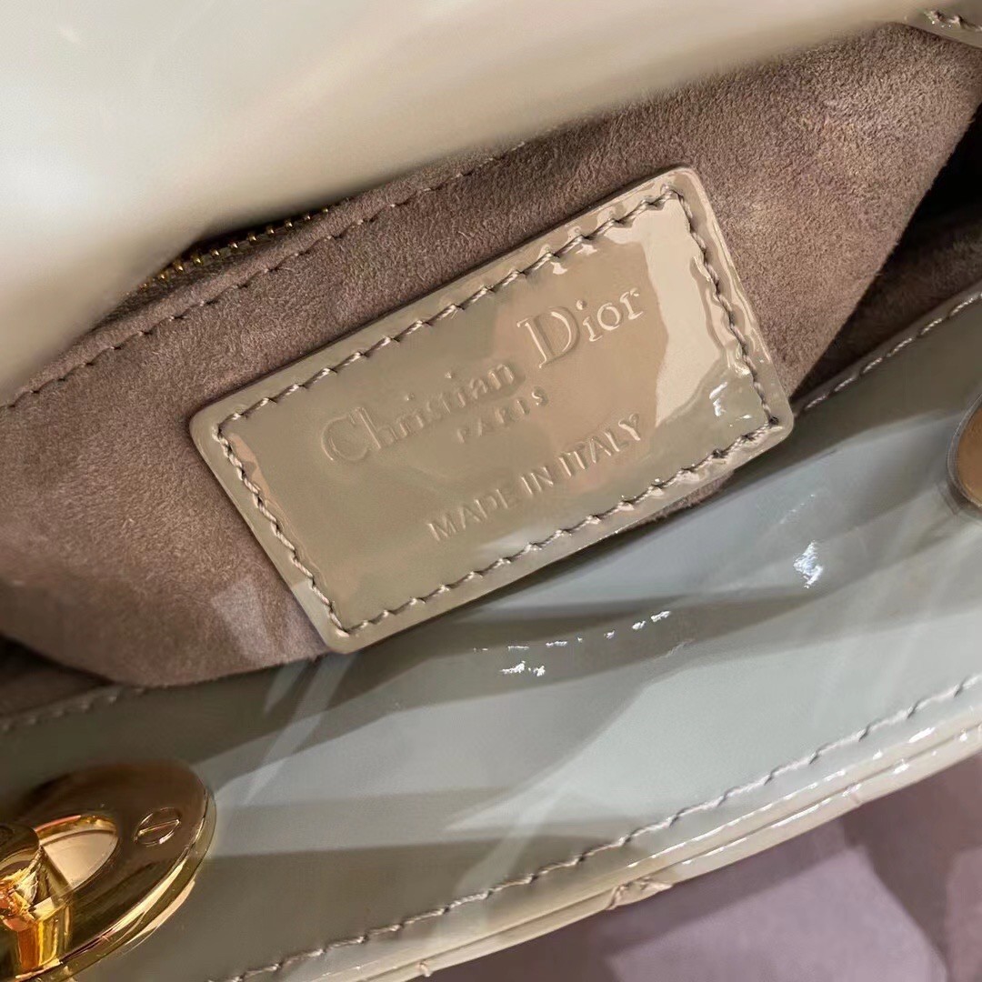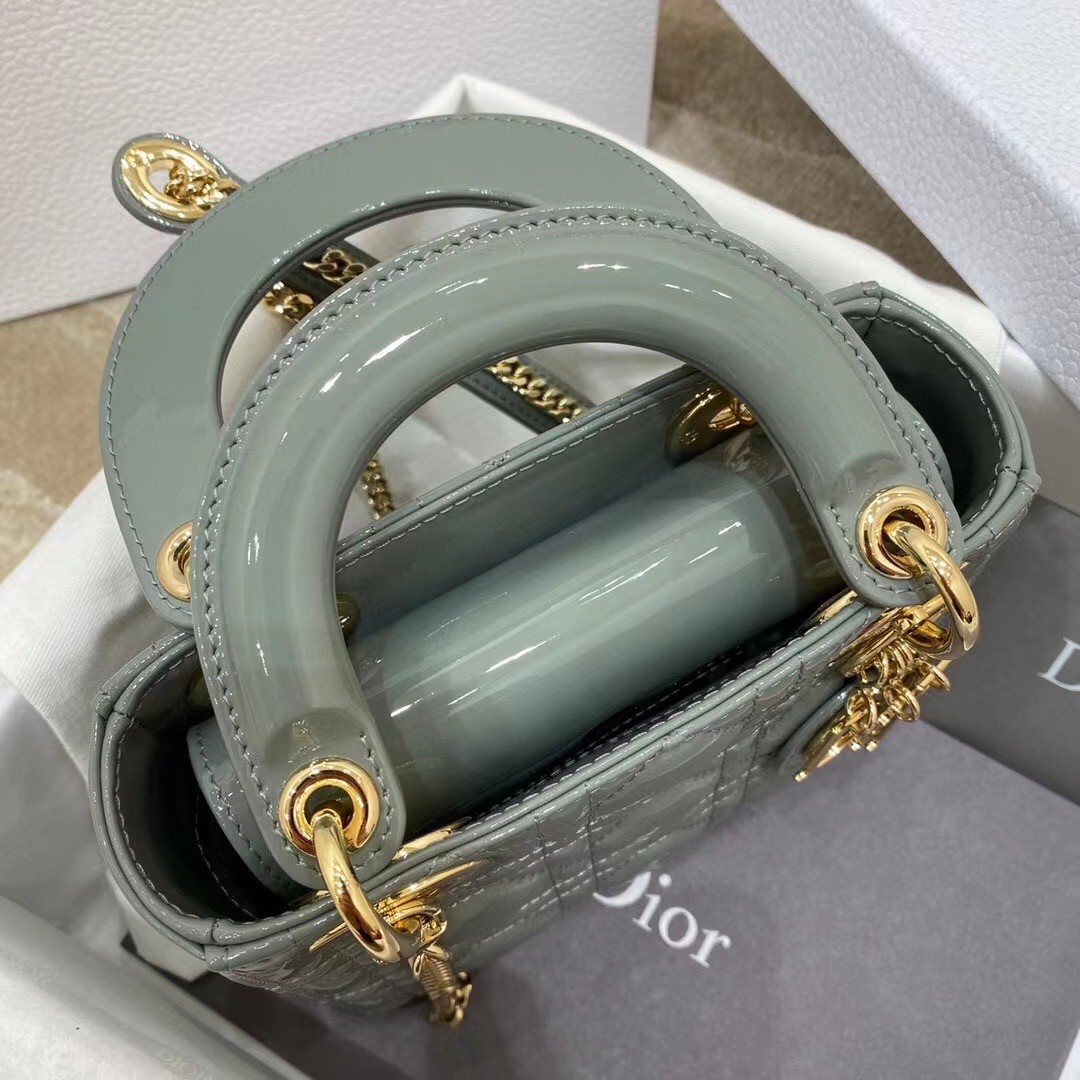 The Lady Dior bag embodies the House's vision of elegance and beauty. Sleek and refined, the style is timeless. It is crafted in patent calfskin with Cannage stitching, creating the instantly recognizable quilted texture, while the pale gold-finish metal 'D.I.O.R.' charms further embellish its silhouette. Featuring a removable chain shoulder strap, the miniature Lady Dior bag can be carried by hand or crossbody as an ideal evening wear companion.