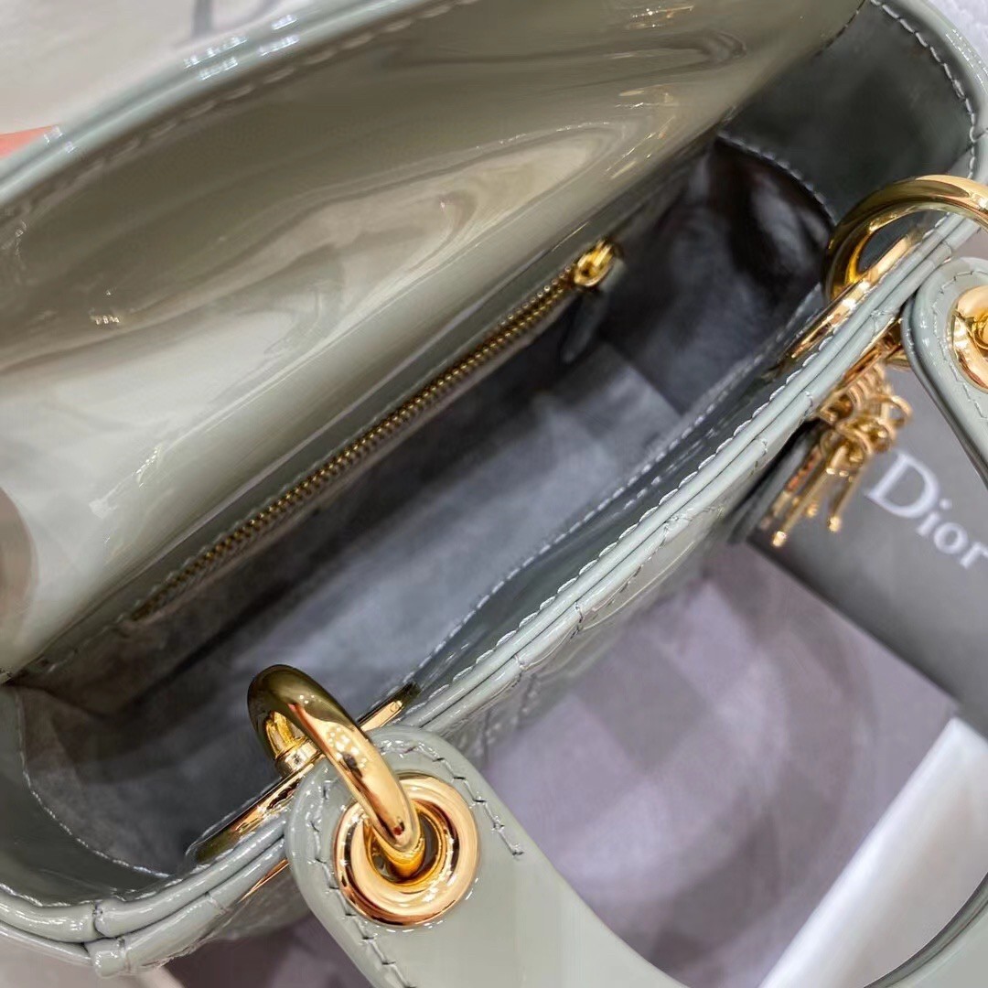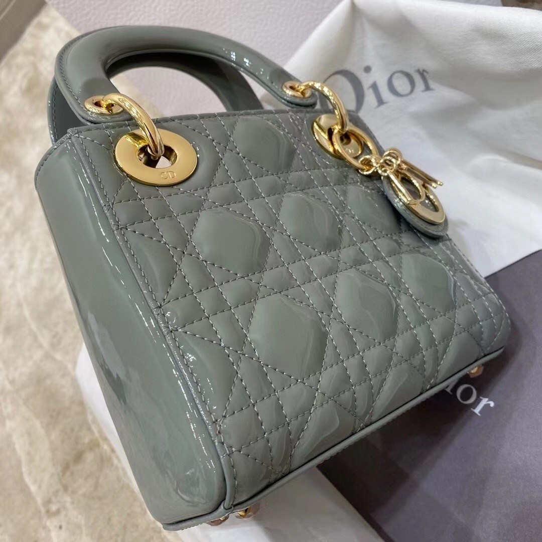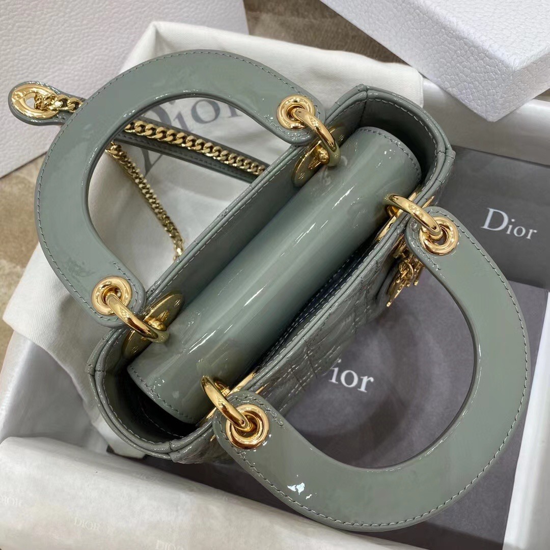 The Lady Dior bag embodies the House's vision of elegance and beauty. Sleek and refined, the style is timeless. It is crafted in patent calfskin with Cannage stitching, creating the instantly recognizable quilted texture, while the pale gold-finish metal 'D.I.O.R.' charms further embellish its silhouette. Featuring a removable chain shoulder strap, the miniature Lady Dior bag can be carried by hand or crossbody as an ideal evening wear companion.