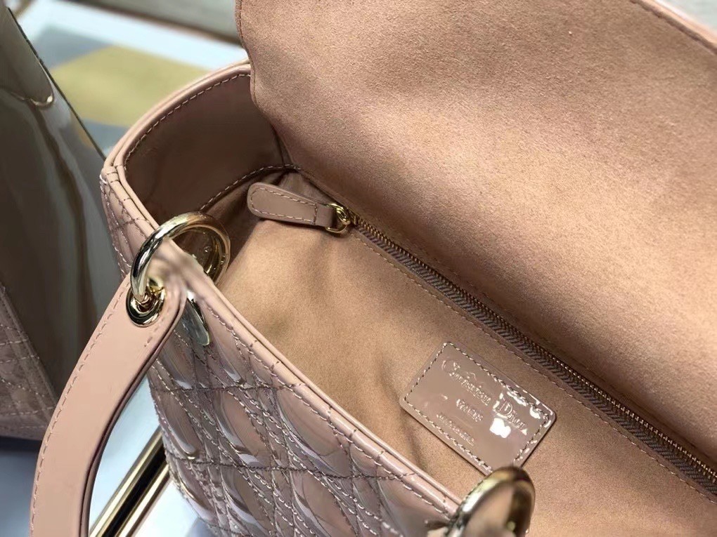 The Lady Dior bag embodies the House's vision of elegance and beauty. Sleek and refined, the style is timeless. Crafted in glossy patent calfskin with Cannage stitching, its quilted texture is immediately recognizable. Pale gold-finish metal 'D.I.O.R.' charms complete and illuminate its silhouette. Featuring a thin, removable leather shoulder strap, the medium Lady Dior bag can be carried by hand or worn crossbody.