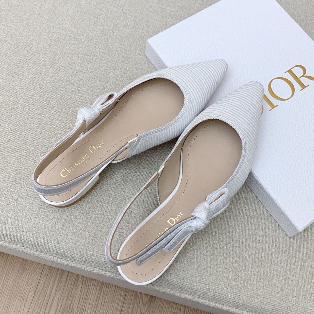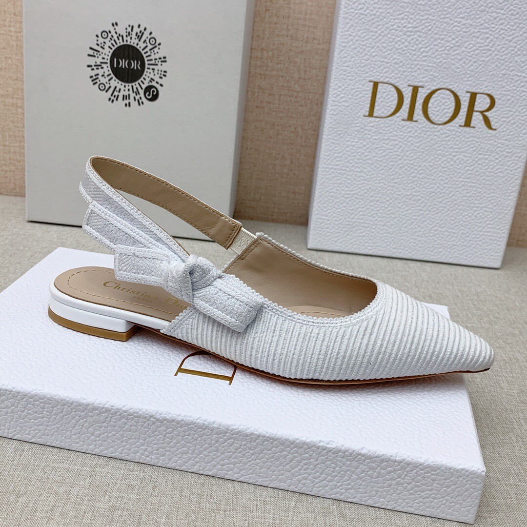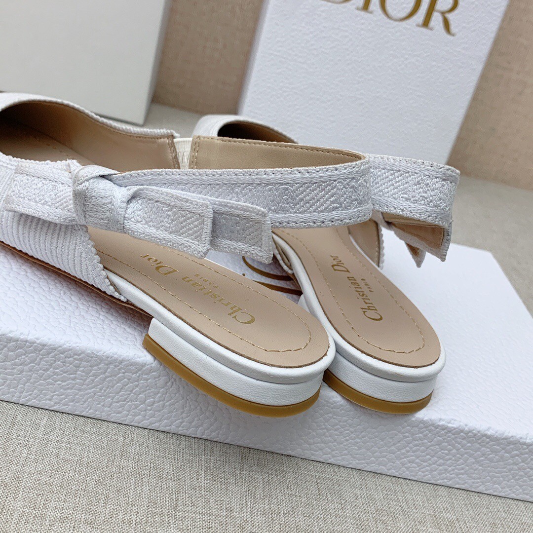 The J'Adior Slingback Ballerina Flat is a prime example of Dior's savoir-faire. Crafted in Christian Dior's Italian ateliers, the silhouette is distinguished by white embroidered cotton, resonating with the collection's pop inspiration. The two-tone embroidered 'J'ADIOR' ribbon is embellished with a flat bow, and a 6.5 cm (2.5) comma heel offers the final elegant touch.