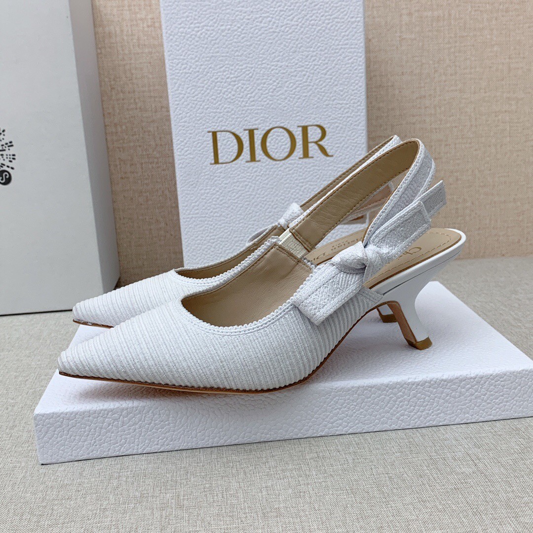 The J'Adior slingback pump is a prime example of Dior's savoir-faire. Crafted in Christian Dior's Italian ateliers, the silhouette is distinguished by white embroidered cotton, resonating with the collection's pop inspiration. The two-tone embroidered 'J'ADIOR' ribbon is embellished with a flat bow, and a 6.5 cm (2.5) comma heel offers the final elegant touch.