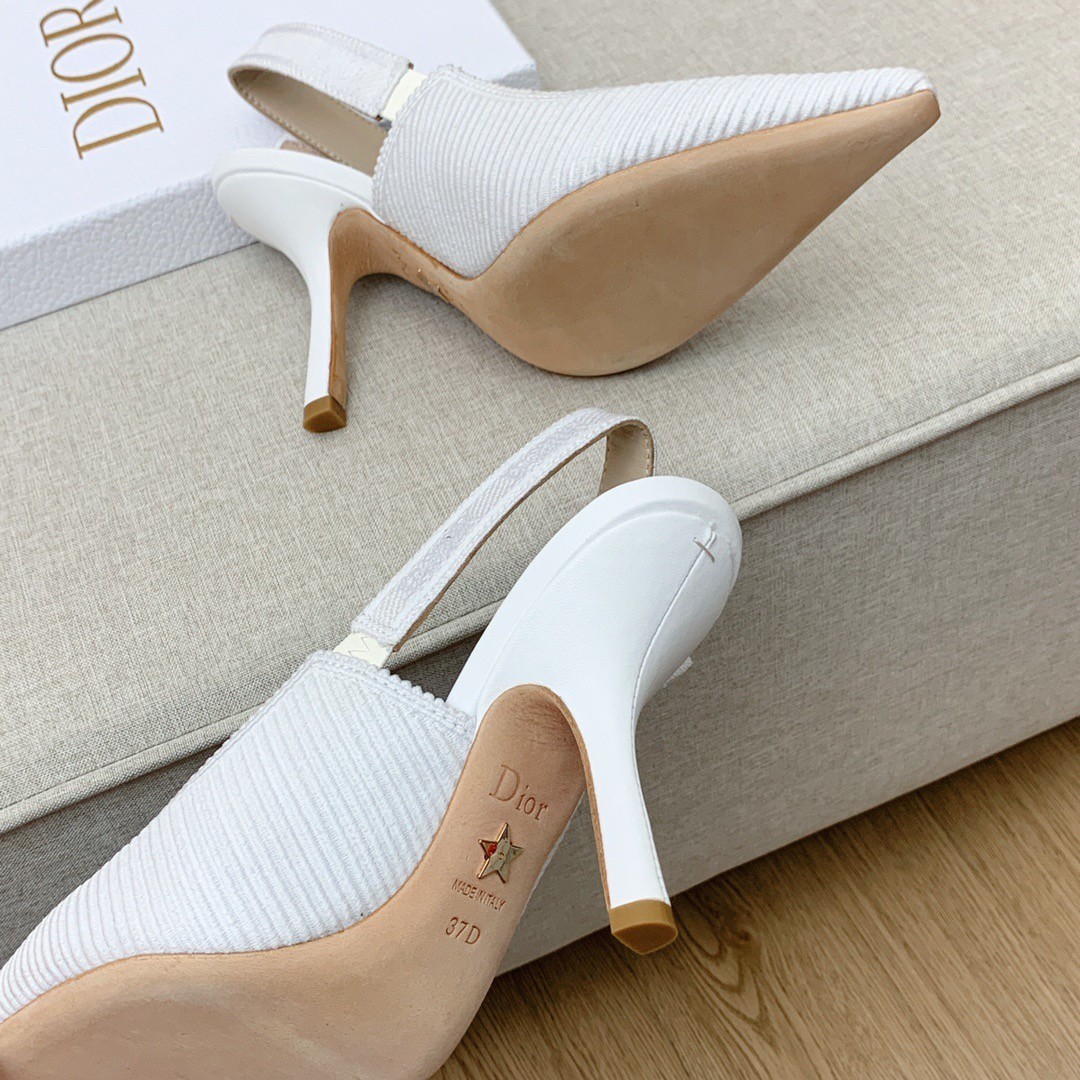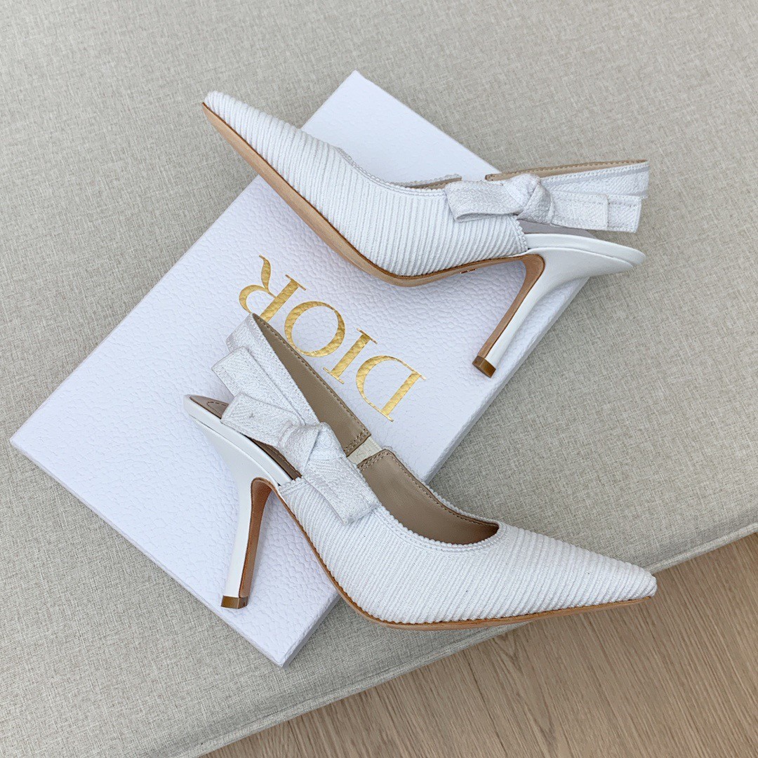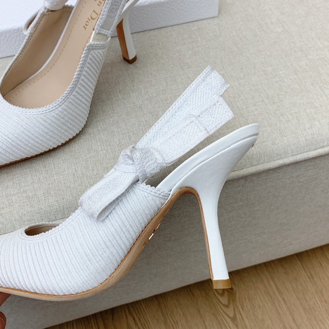 The J'Adior slingback pump is a prime example of Dior's savoir-faire. Crafted in Christian Dior's Italian ateliers, the pointed-toe silhouette is distinguished by white embroidered cotton. The two-tone embroidered 'J'ADIOR' ribbon is embellished with a flat bow, and a 10 cm (4) comma heel offers the final elegant touch.