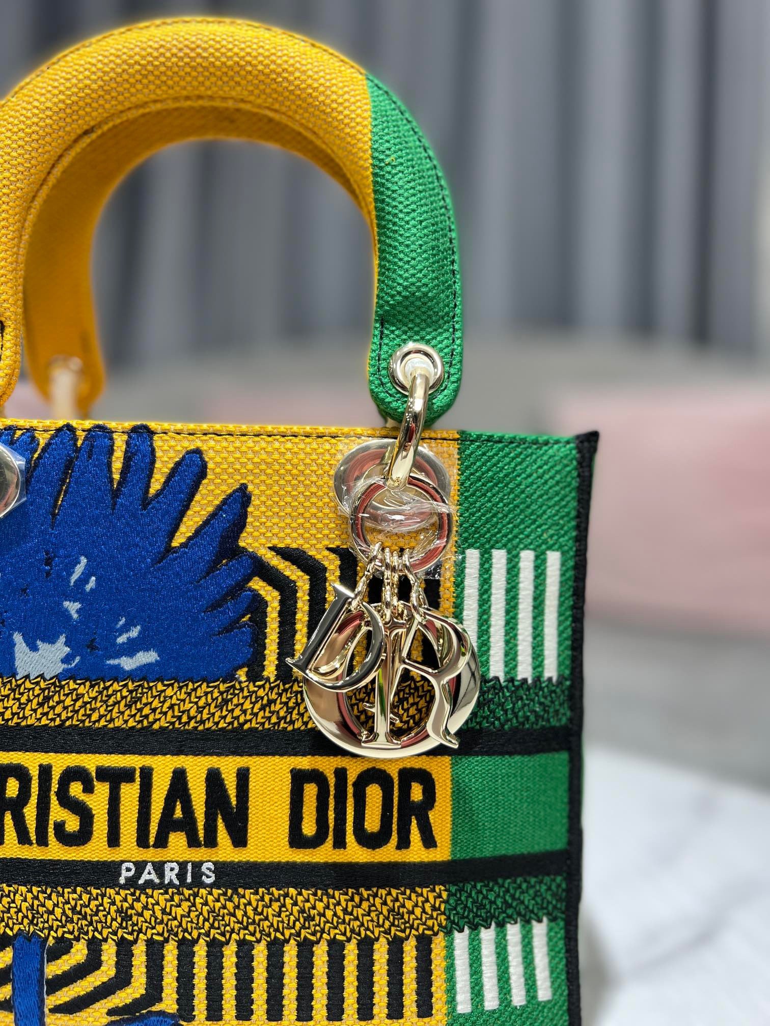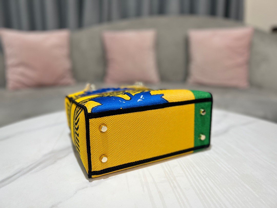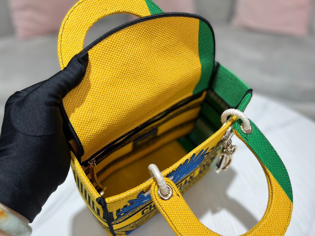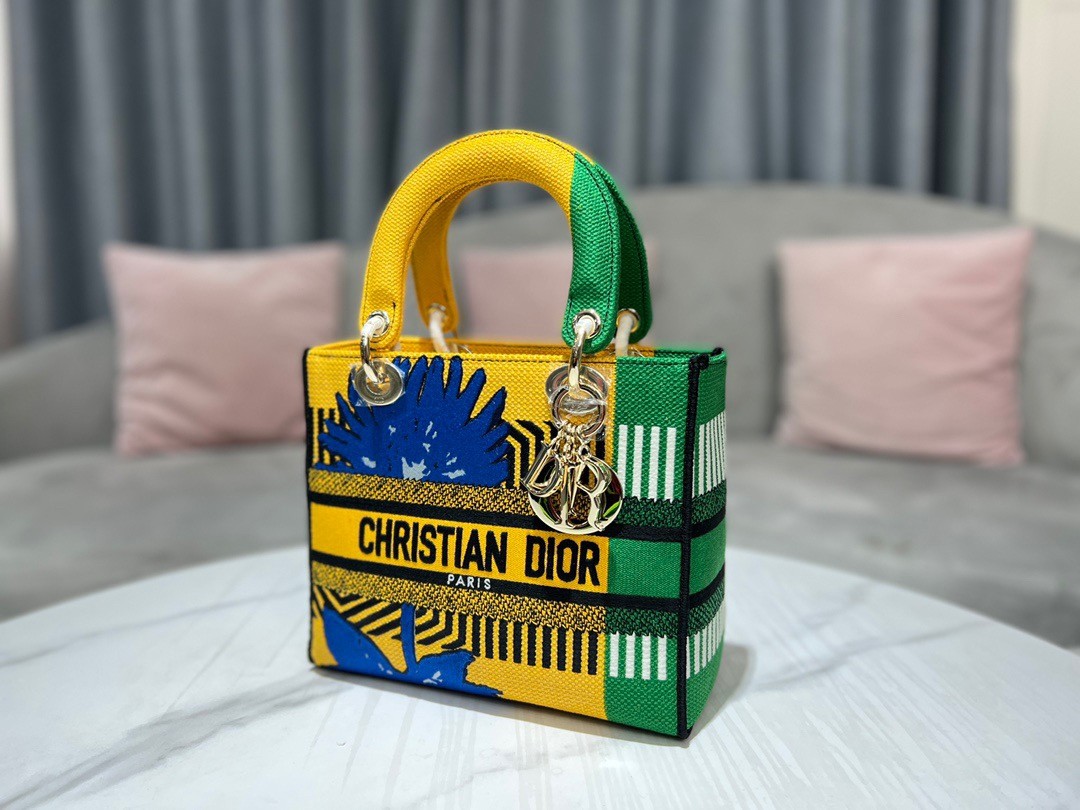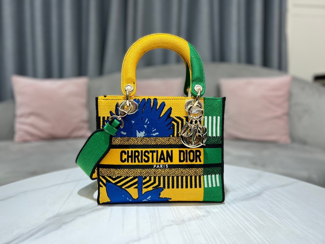 The Lady D-Lite bag combines classic elegance with House modernity. The style is fully embroidered with the bright yellow and green D-Flower Pop motif that embodies the collection's colorful universe. A 'CHRISTIAN DIOR PARIS' signature adorns the front, while thick 'D.I.O.R.' charms in pale gold-finish metal further enhance and highlight the silhouette. Featuring a wide, reversible and removable embroidered shoulder strap, the medium Lady D-Lite bag can be carried by hand or worn crossbody.