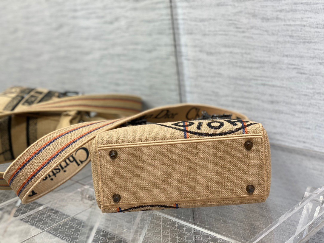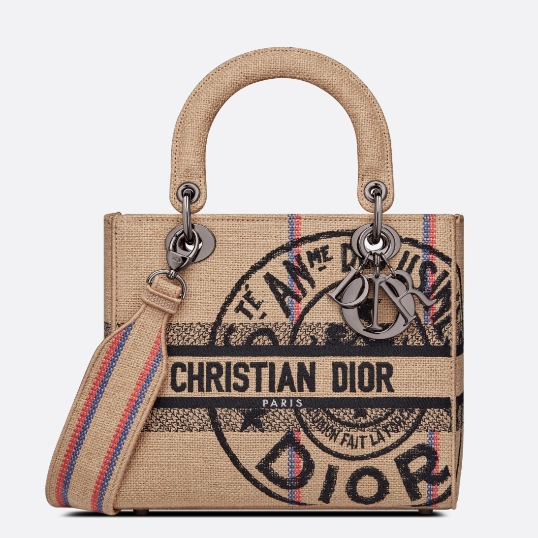The Lady D-Lite bag embodies the classic elegance and modernity of the House. Crafted in beige embroidered jute canvas, it features the 'L'Union Fait la Force' motto, inspired by the atelier's jute bags and reaffirming the participative dimension dear to Maria Grazia Chiuri. A 'CHRISTIAN DIOR PARIS' signature adorns the front, while ruthenium-finish metal 'D.I.O.R.' charms enhance the silhouette. Boasting a removable and adjustable wide embroidered shoulder strap, the medium bag can be carried by hand or worn crossbody.