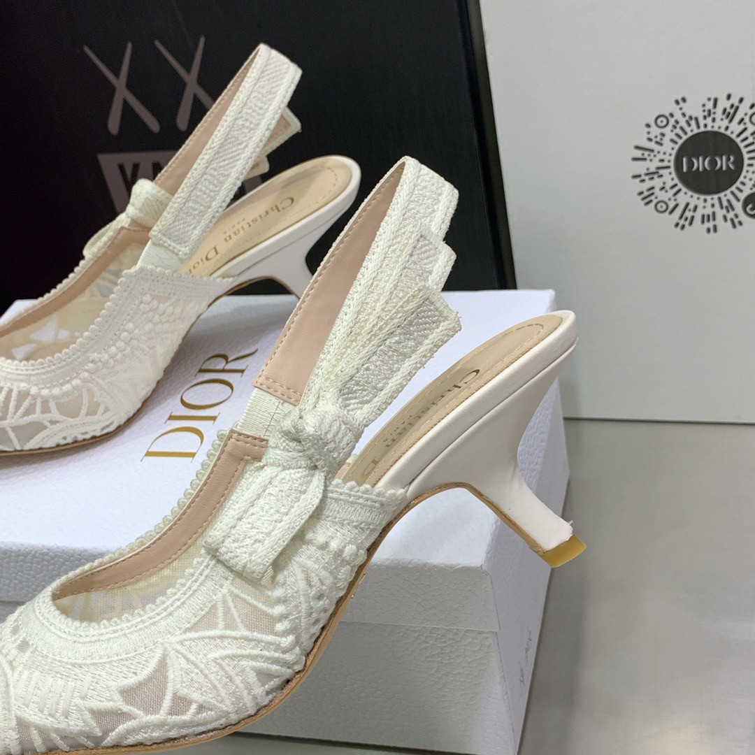 The J'Adior slingback pump is a prime example of Dior savoir-faire. The embroidered cotton design is enhanced by a white macramé motif in an elegant play on transparency. The 'J'ADIOR' embroidered ribbon, bow and 6.5 cm (2.5) comma heel complete the refined and elegant creation.