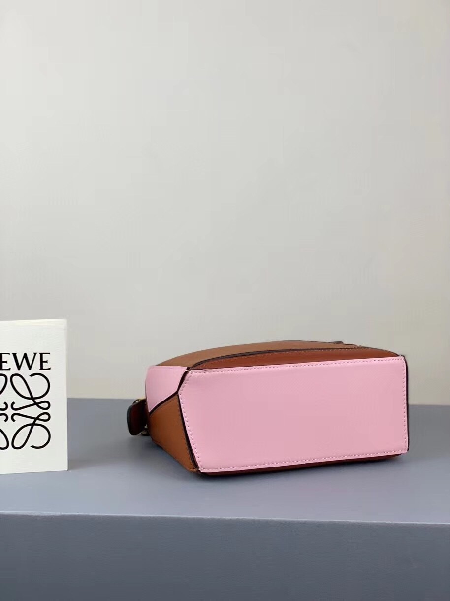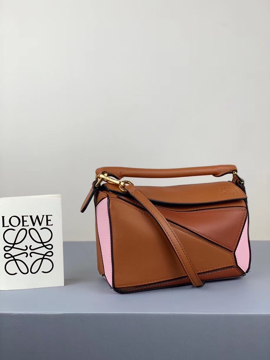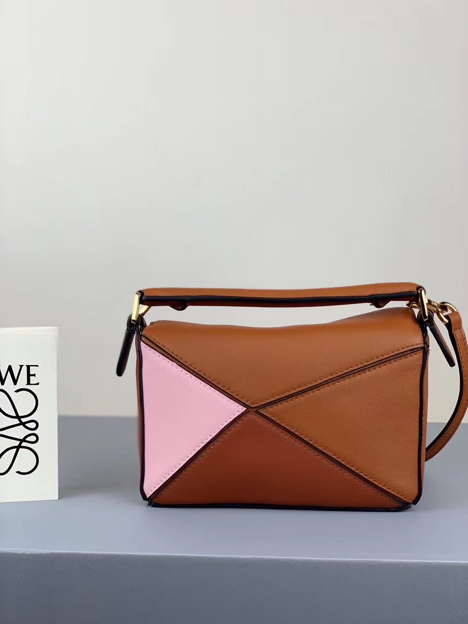 The color-block finish of Loewe's Puzzle bag helps accentuates its unique construction so beautifully - sharp panels of brown, camel and pink leather form the cuboid shape. Shrunk down to mini size, this one is perfect for holding your keys, cardholder, phone, and even a small camera. Match your jewelry to the gold hardware.