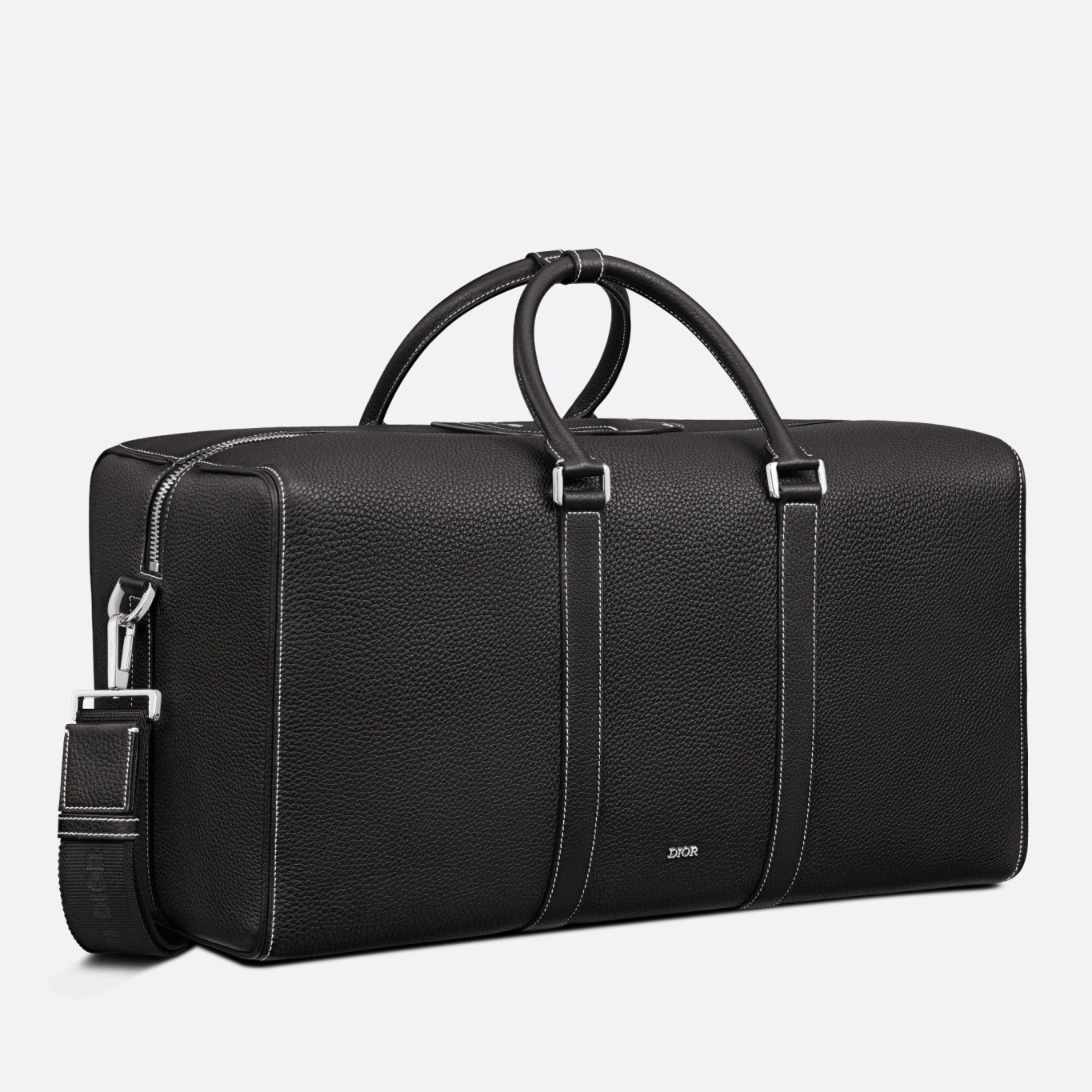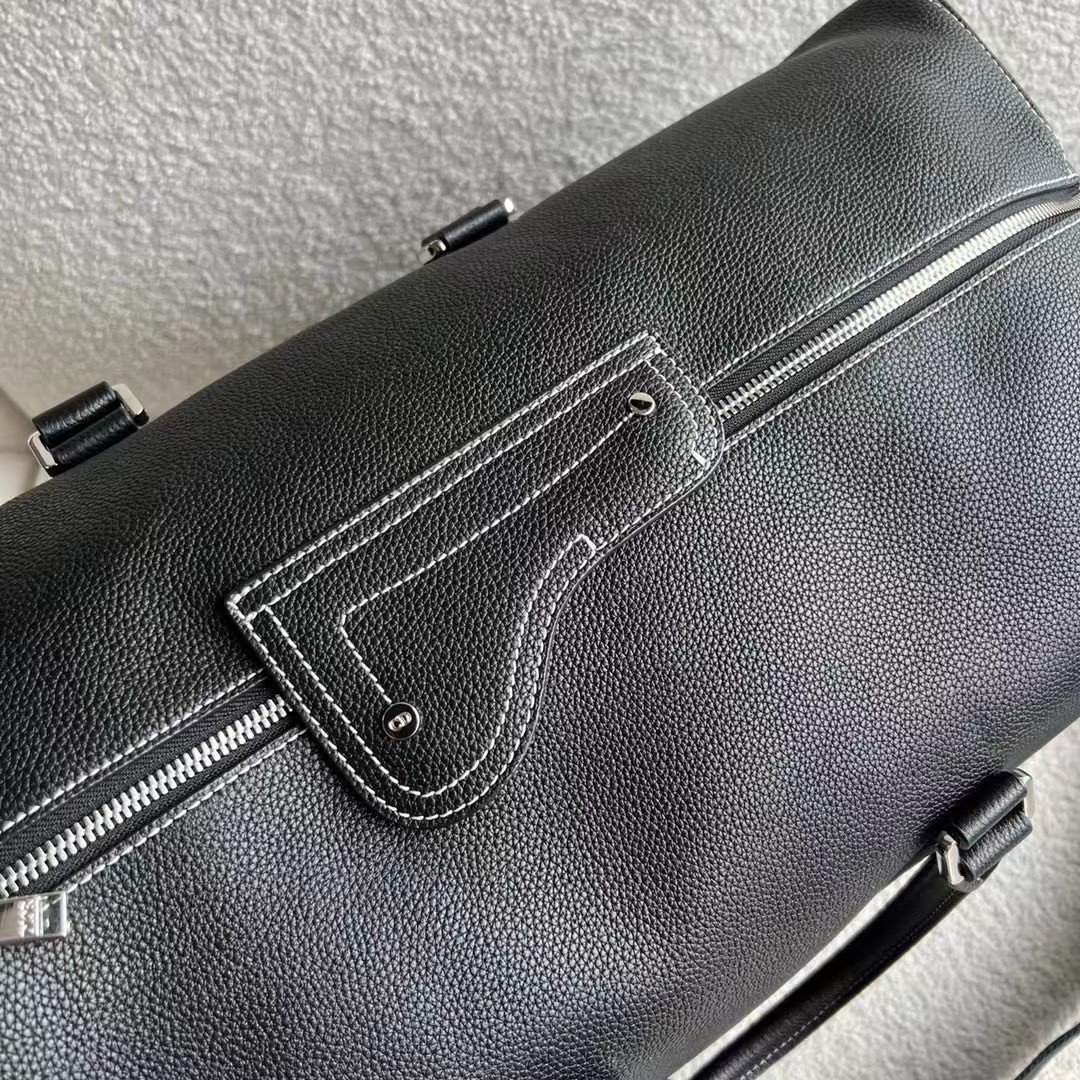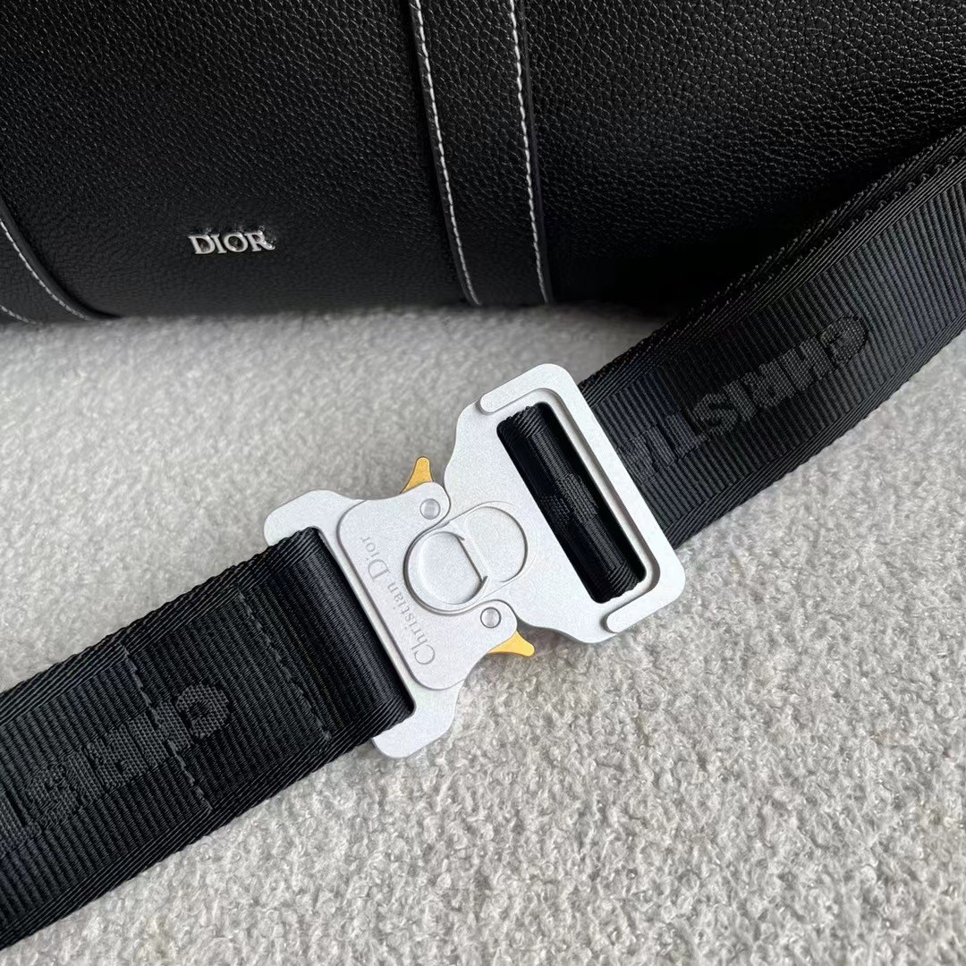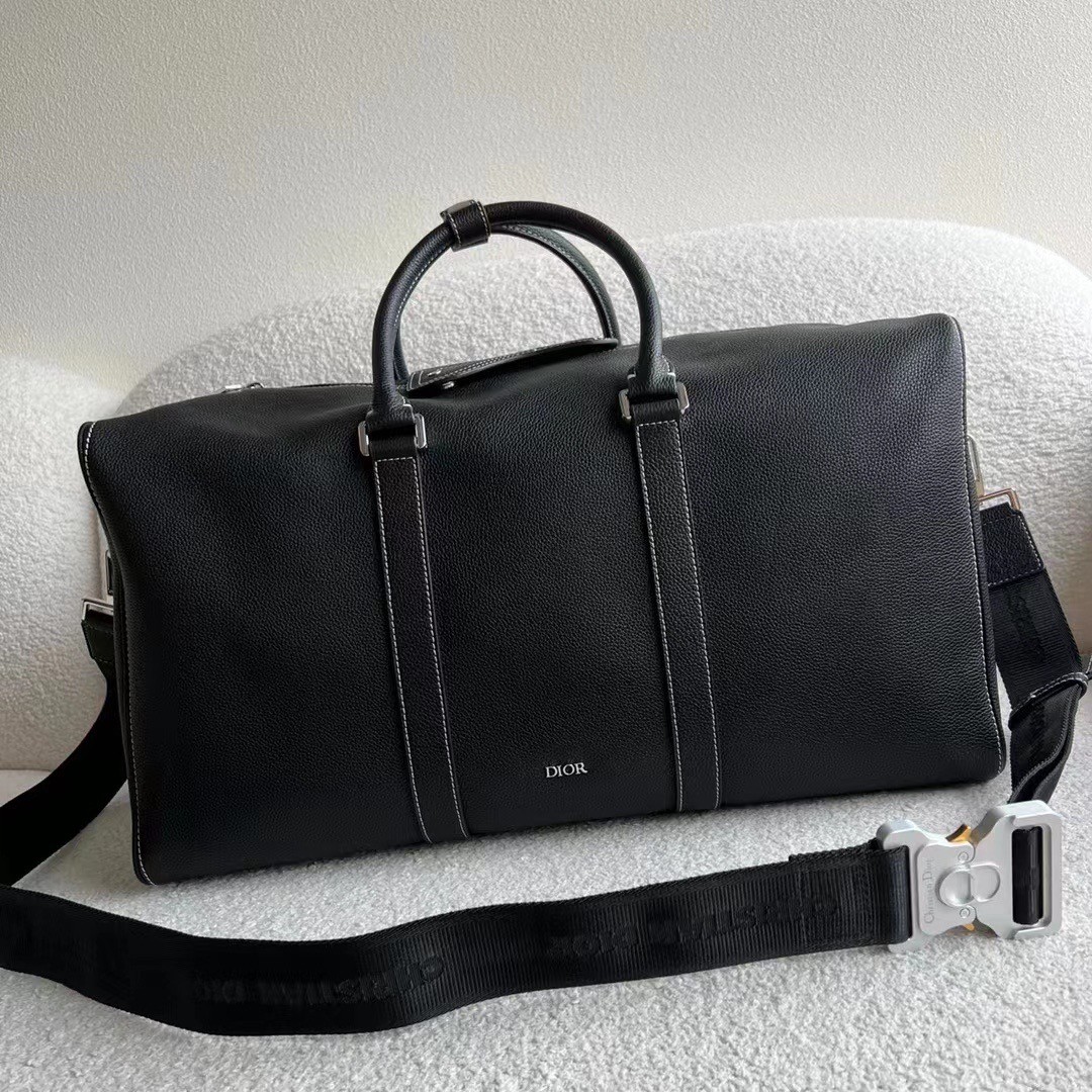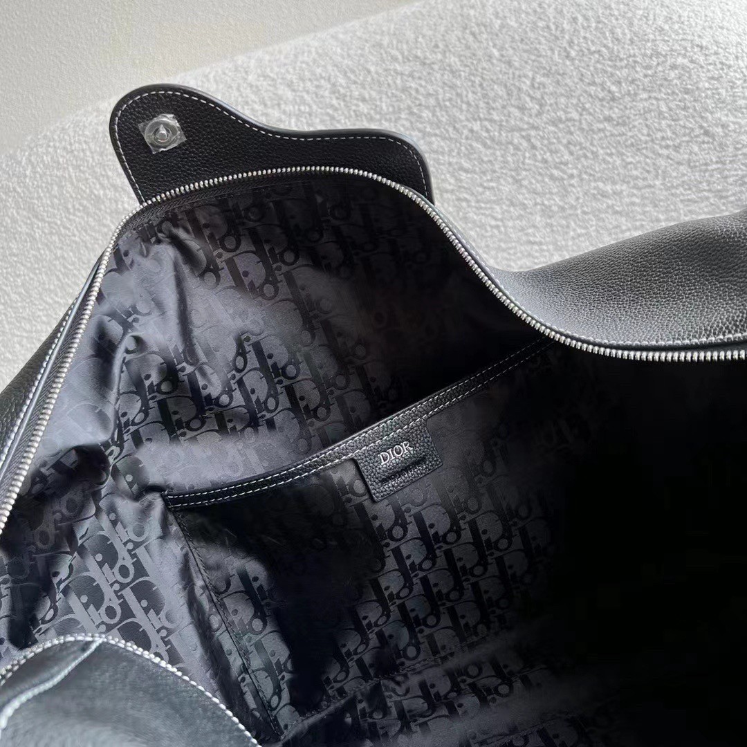 New this season, the Dior Lingot 50 Duffel bag is distinguished by a functional and elegant design. The black grained calfskin with contrasting topstitching is enhanced by the 'DIOR' signature on the front. A zipped compartment with a Saddle flap will carry daily essentials. The folding top handles and adjustable, removable shoulder strap with an aluminum buckle allows the bag to be carried by hand, worn over the shoulder or crossbody.