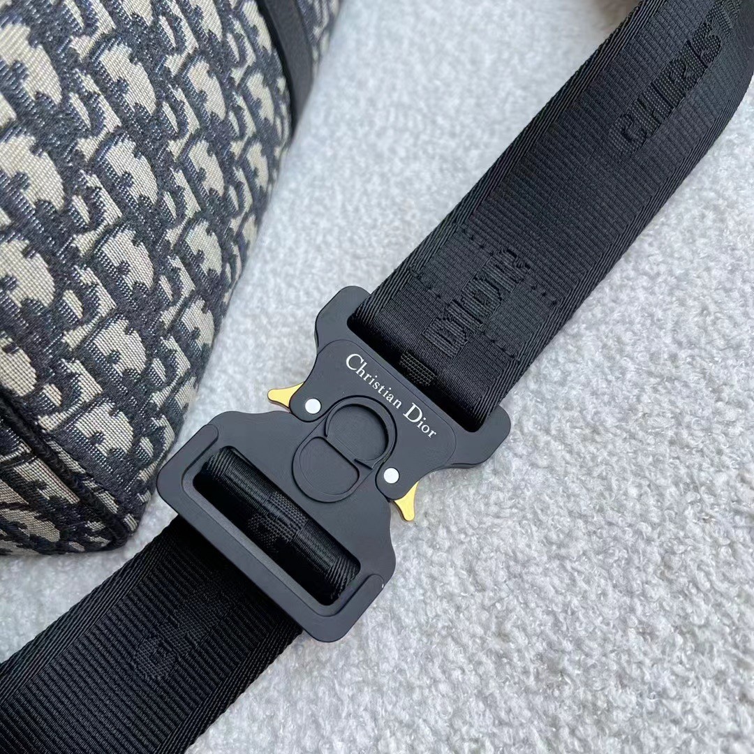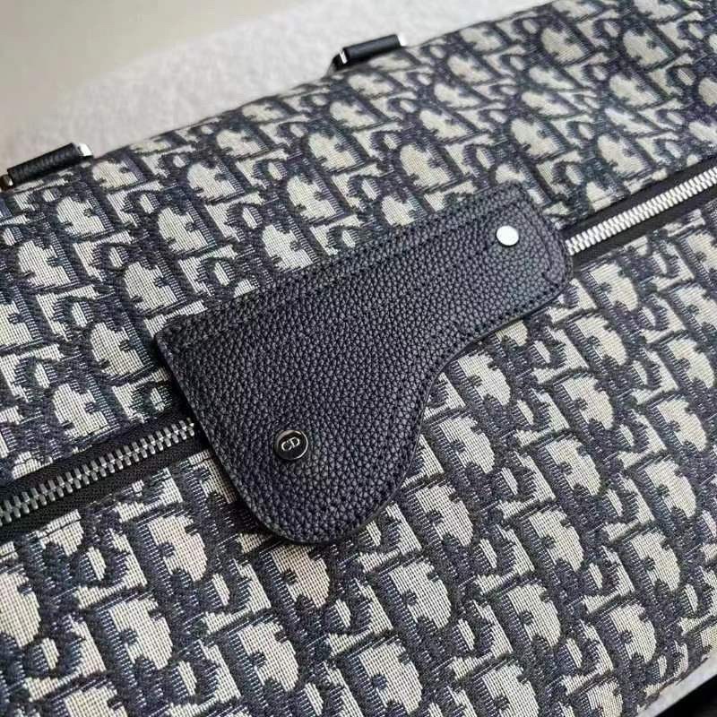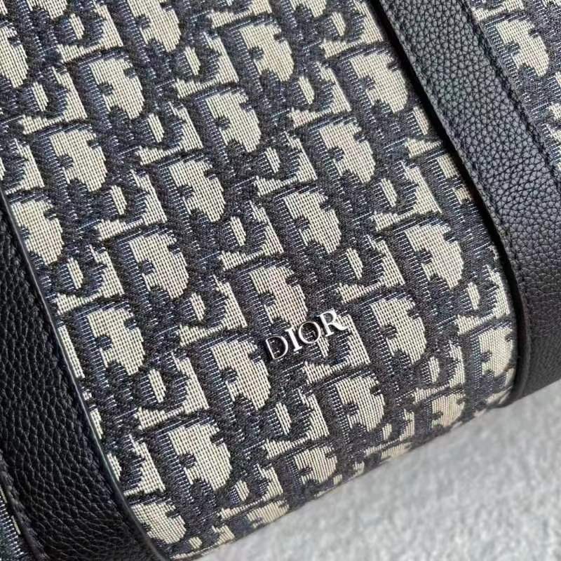 New this season, the Dior Lingot 50 Duffel bag is distinguished by a functional and elegant design. The beige and black Dior Oblique jacquard is enhanced by black grained calfskin details and the 'DIOR' signature on the front. A zipped compartment with a Saddle flap will hold all the daily essentials. The folding top handles and adjustable, removable shoulder strap with an aluminum buckle allows the bag to be carried by hand, worn over the shoulder or crossbody.