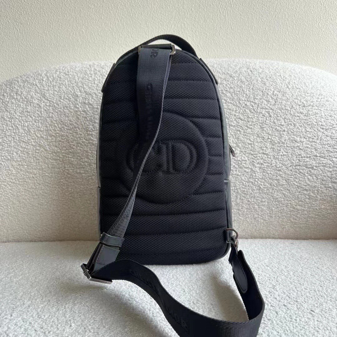 The backpack has a practical silhouette, inspired by the Rider backpack's design. Crafted in black CD Diamond canvas, it is embellished with a 'DIOR' signature on the front zipped pocket. The spacious main compartment is designed to hold all the small essentials and can also accommodate a tablet. The handle and adjustable 'CHRISTIAN DIOR' shoulder strap allow it to be carried by hand, worn over the shoulder or crossbody.