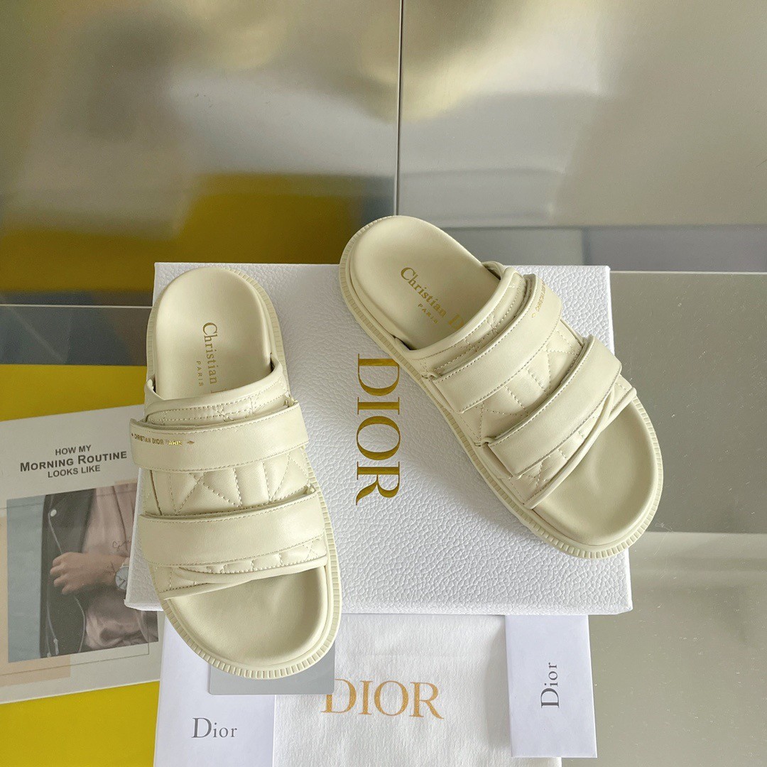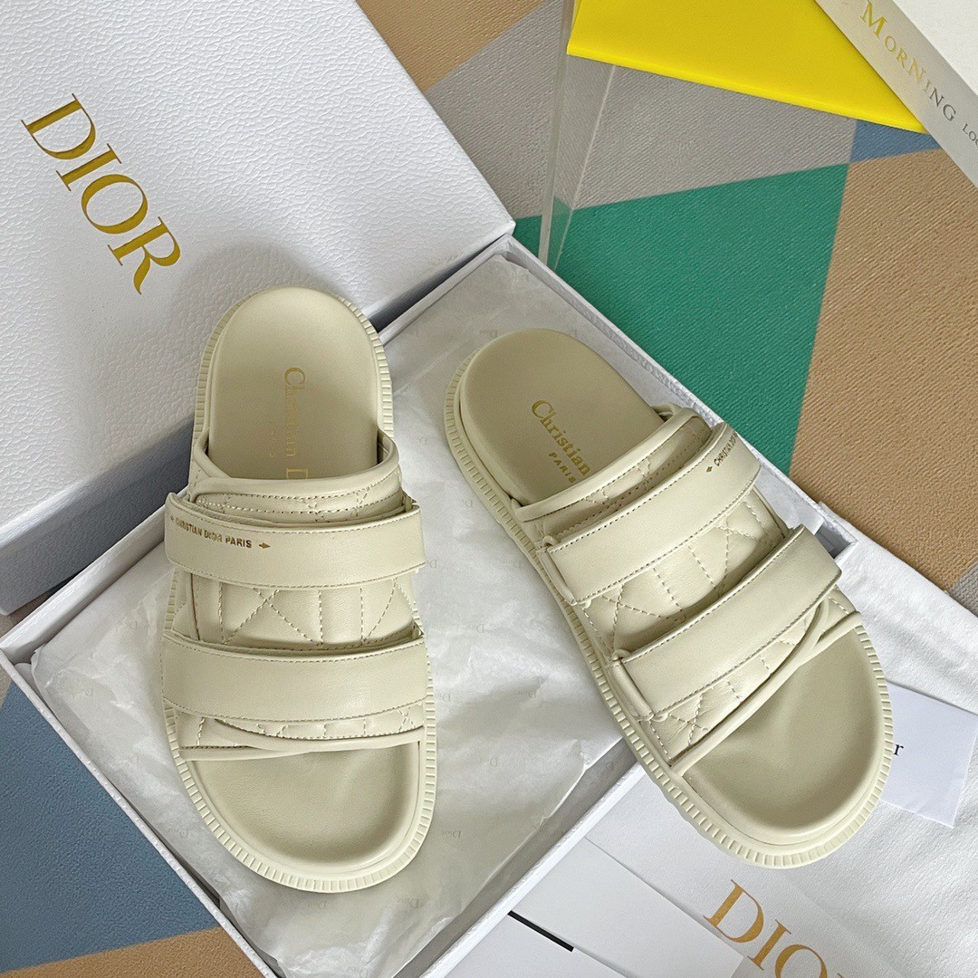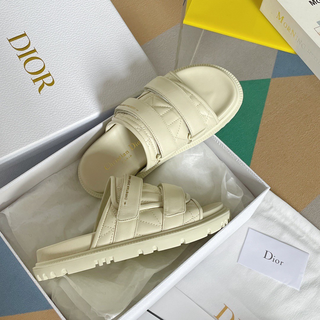 The Dio(r)evolution slide in quilted Cannage calfskin has a modern silhouette. The style features an anatomically shaped sole made with an ultra lightweight and comfortable leather. Adjustable scratch bands confirm a sporty allure and are completed by a gold-tone 'CHRISTIAN DIOR PARIS' signature on the upper band. The sandal will lend a contemporary touch to any look.
