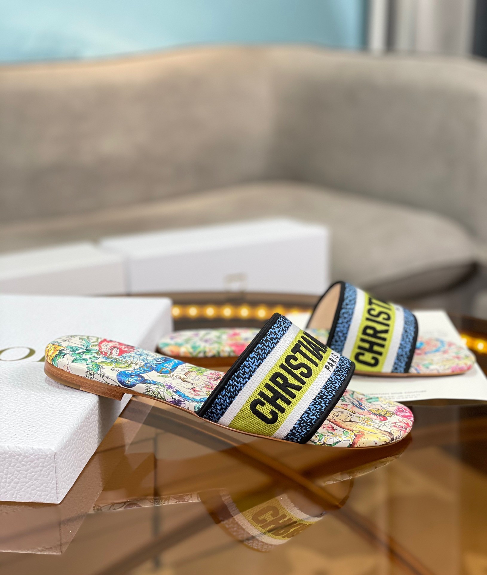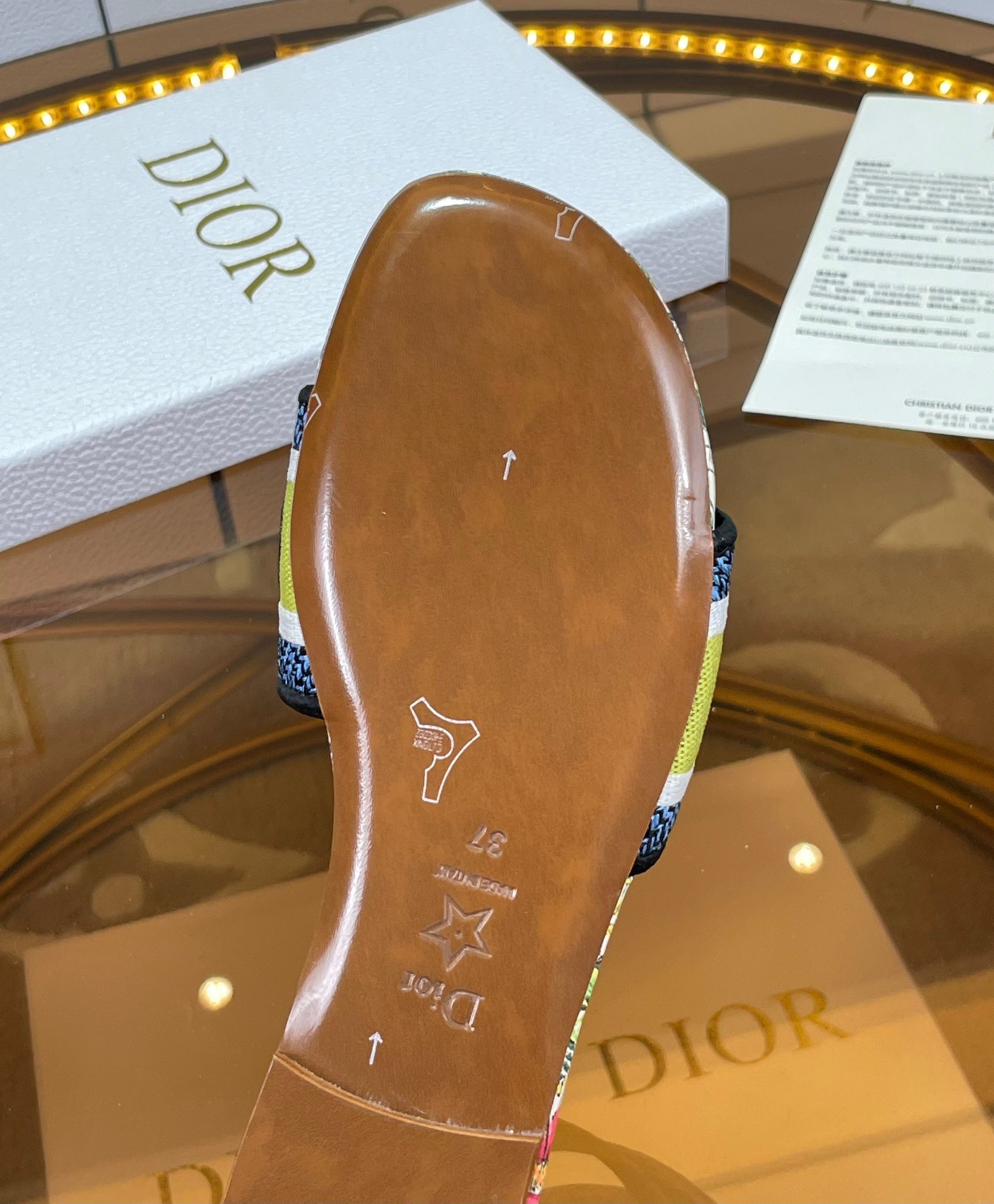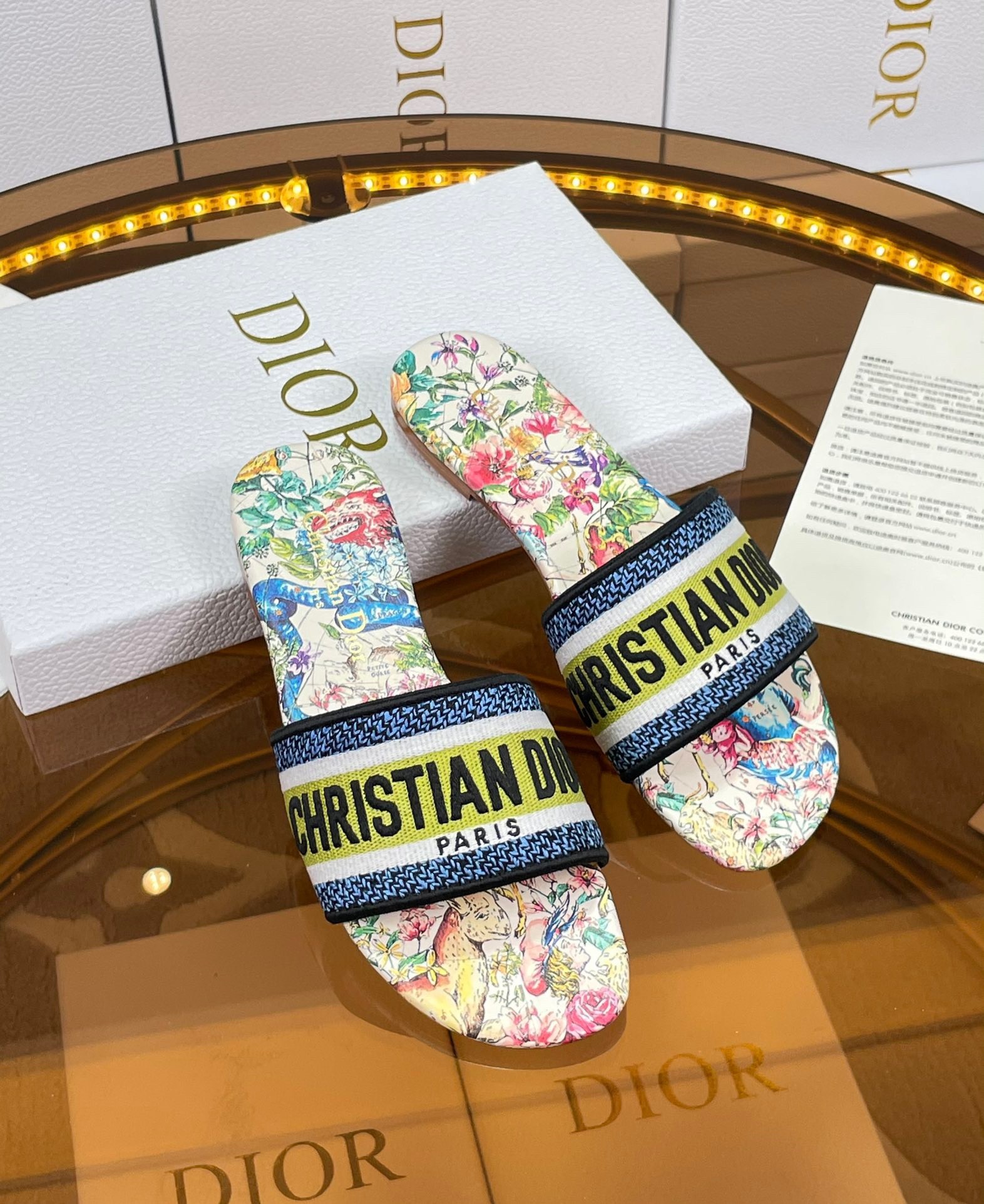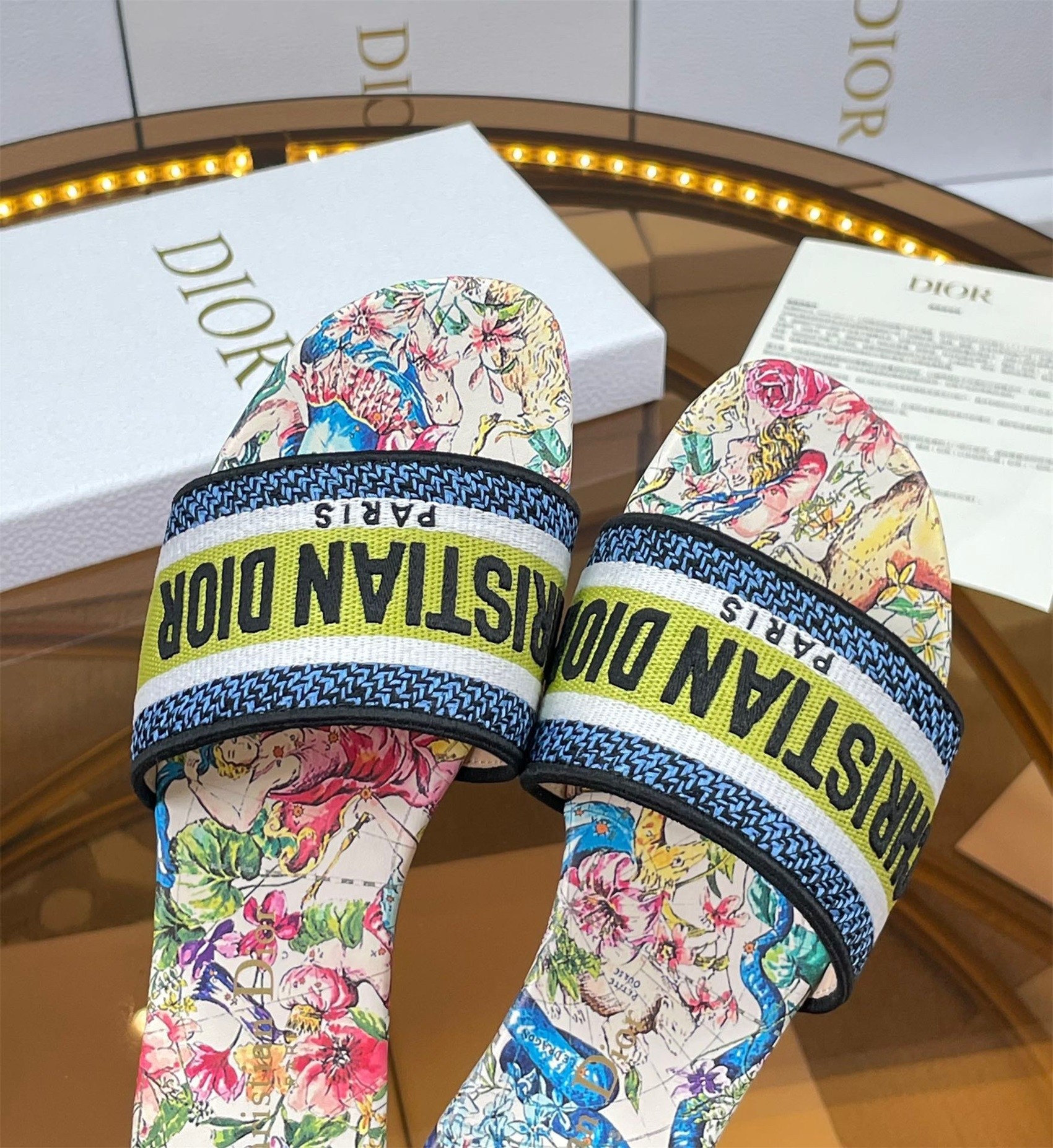 The Dway slide is an emblematic and timeless style featuring Pietro Ruffo's D-Constellation motif, a reminder of Mr. Dior's fascination with astrology. The multicolor upper has an embroidered 'CHRISTIAN DIOR' signature that instantly stands out. Its streamlined silhouette makes it easy to slip on to complete a relaxed look and it can be paired with other D-Constellation creations from the collection.