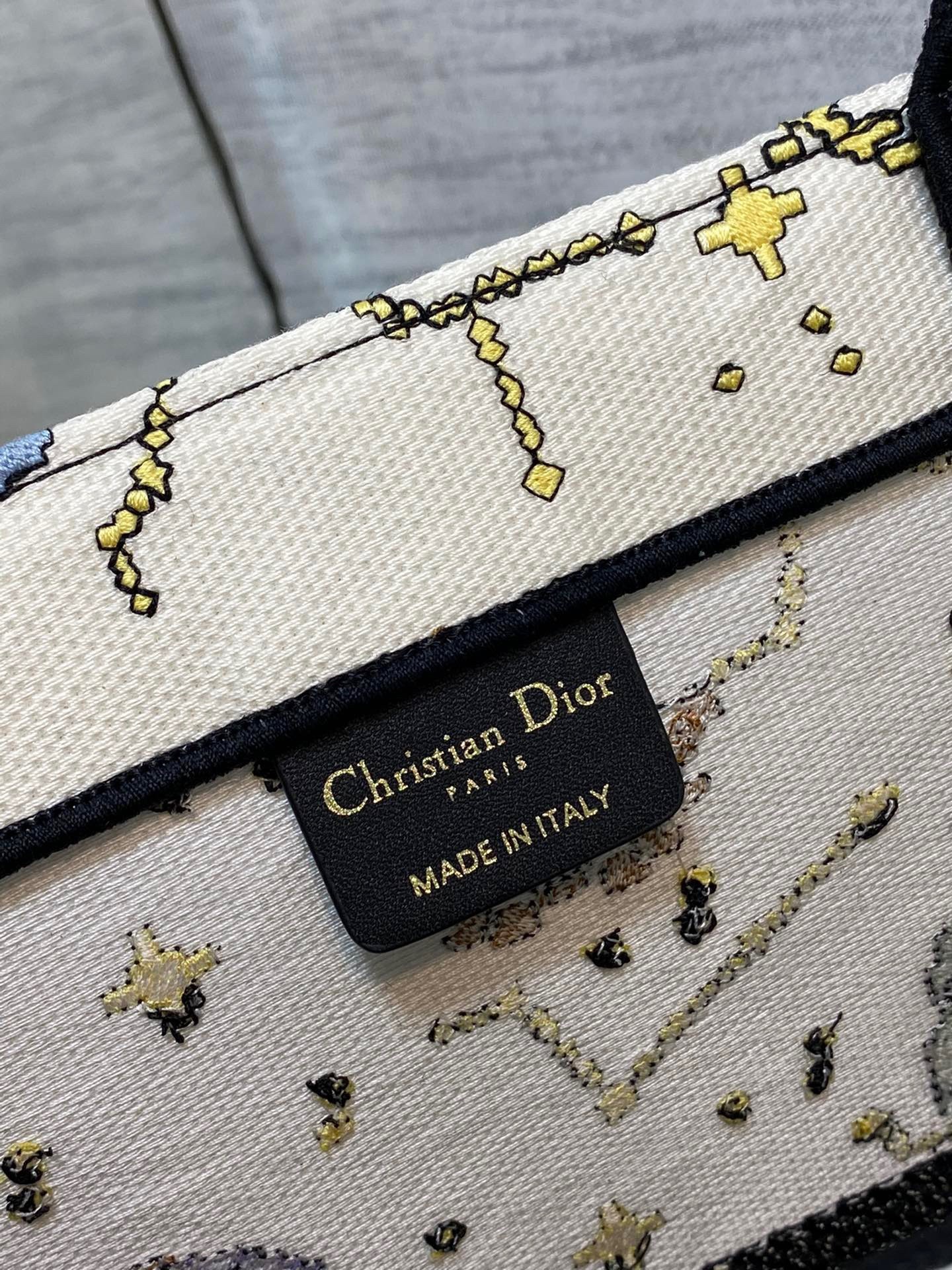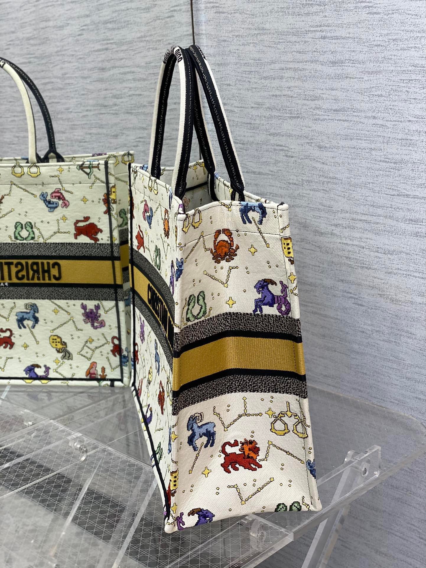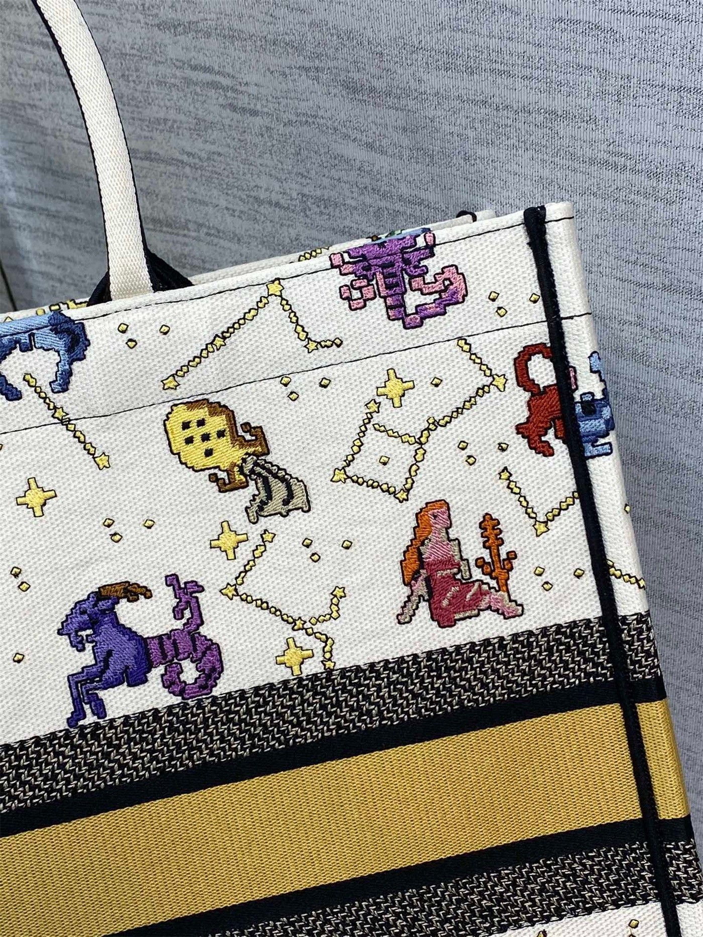 The Dior Book Tote is an original creation introduced by Maria Grazia Chiuri, Dior's Creative Director, and has become a staple of the Dior aesthetic. Designed to hold all the daily essentials, the style is fully embroidered with the multicolor Dior Pixel Zodiac motif, offering a creative and colorful new take on astrological signs. Adorned with the 'CHRISTIAN DIOR PARIS' signature on the front, the large tote exemplifies the House's signature savoir-faire and may be carried by hand or worn over the shoulder.