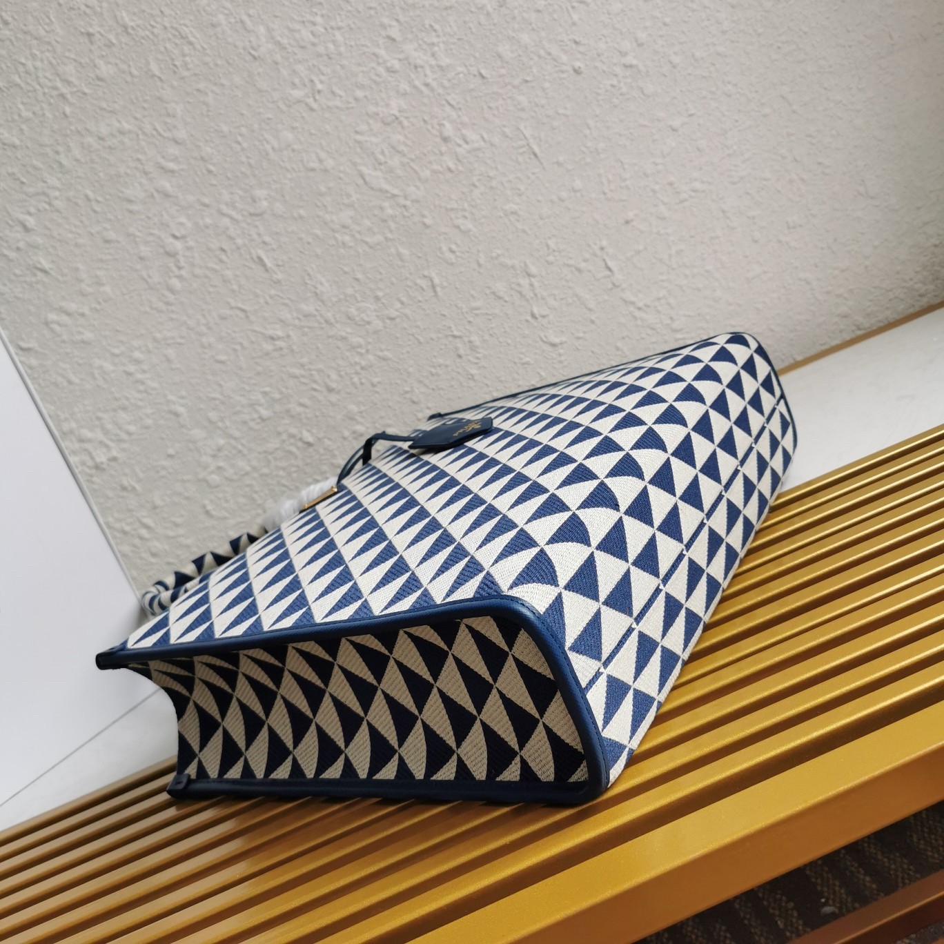Introduced for the first time on trunks designed by Mario Prada, the Prada triangle expresses uniqueness and modernity through its universal, minimalist shape that is reinvented in a different way each season. Here, the geometric design is transformed into a sophisticated yet modernist pattern that plays with contrasting colors and decorates this sleek tote bag. Details in the brand's iconic Saffiano leather embellish the design.