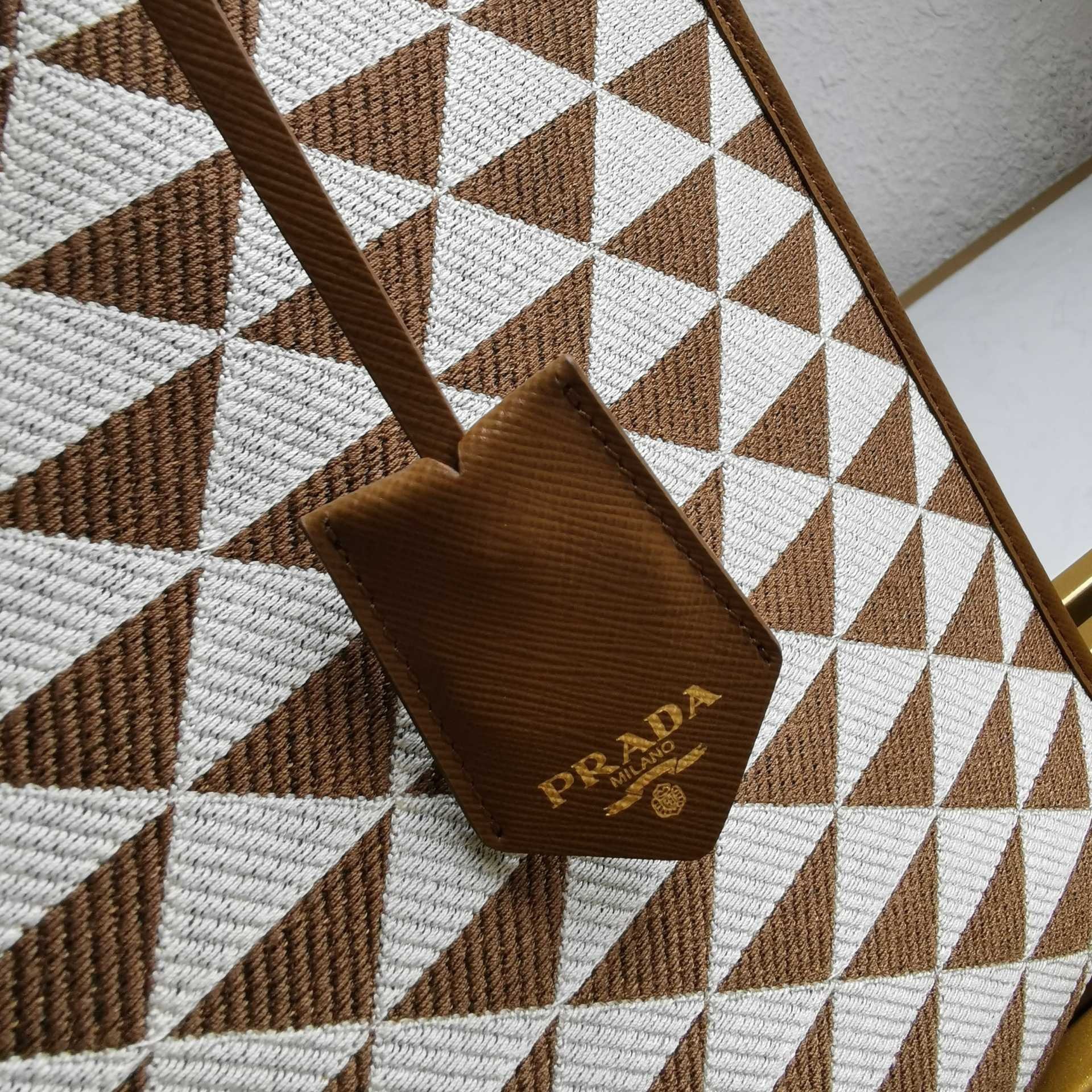 Introduced for the first time on trunks designed by Mario Prada, the Prada triangle expresses uniqueness and modernity through its universal, minimalist shape that is reinvented in a different way each season. Here, the geometric design is transformed into a sophisticated yet modernist pattern that plays with contrasting colors and decorates this sleek tote bag. Details in the brand's iconic Saffiano leather embellish the design.