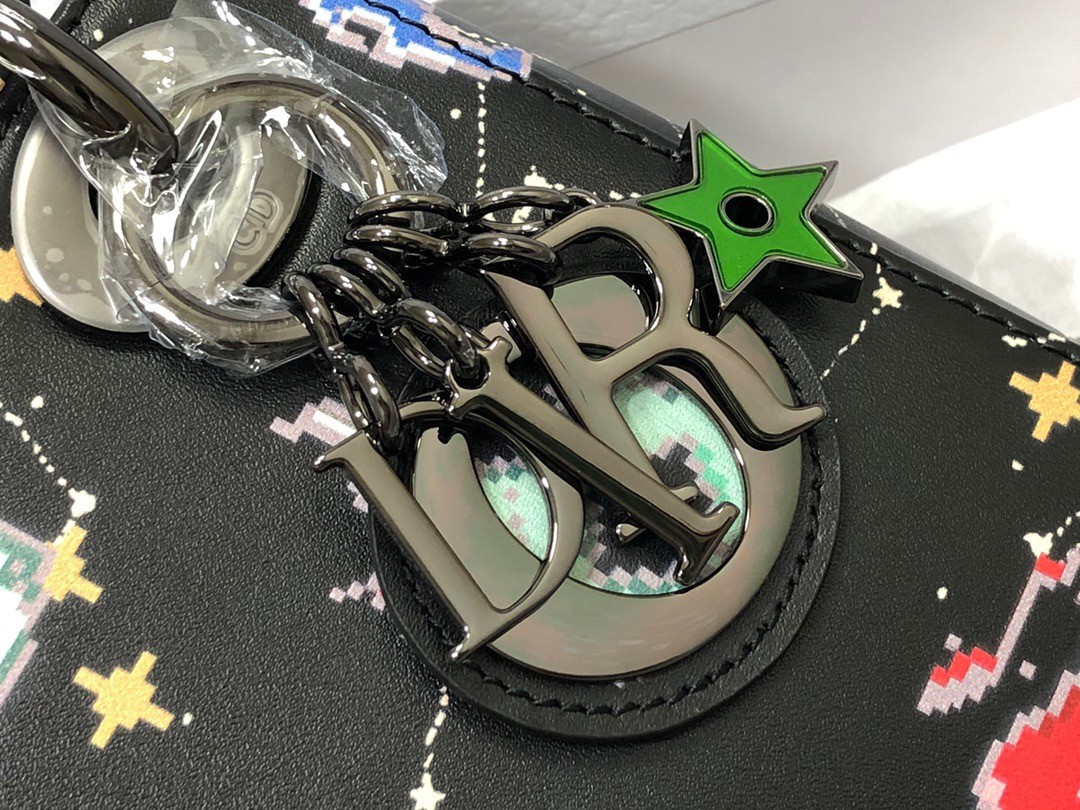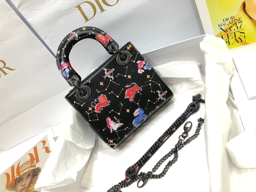 The Lady Dior Bag embodies the House's vision of elegance and beauty. Refined and graceful, the timeless creation is crafted in black calfskin and showcases the Dior Pixel Zodiac motif, an imaginative and colorful tribute to astrological signs. Ruthenium-finish metal 'D.I.O.R.' charms embellish and illuminate the silhouette. Boasting a removable chain shoulder strap, the miniature Lady Dior bag will make an ideal evening companion and may be carried by hand or worn crossbody.