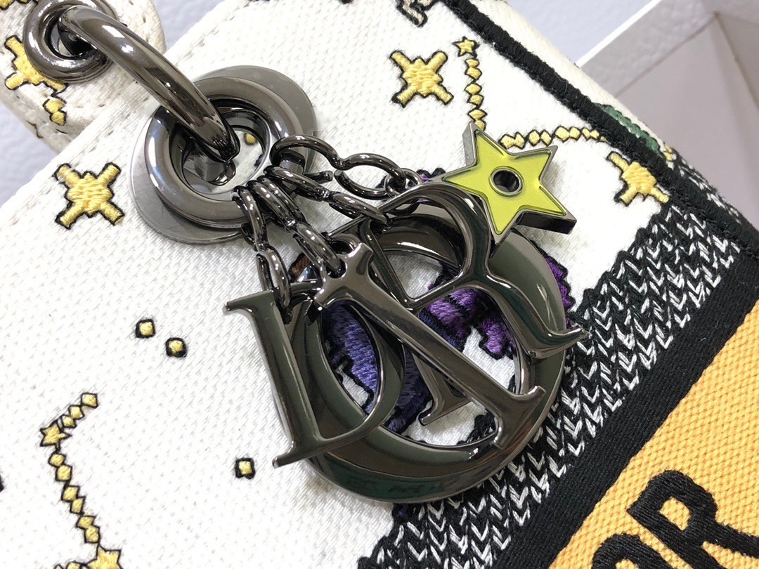 The Lady D-Lite bag combines classic elegance with House modernity. Fully embroidered with the ecru multicolor Dior Pixel Zodiac motif, the style offers an imaginative and colorful new take on astrological signs. A 'CHRISTIAN DIOR PARIS' signature adorns the front, while ruthenium-finish metal 'D.I.O.R.' charms enhance and highlight the silhouette. Featuring a wide, reversible and removable embroidered shoulder strap, the medium Lady D-Lite bag can be carried by hand or worn crossbody.