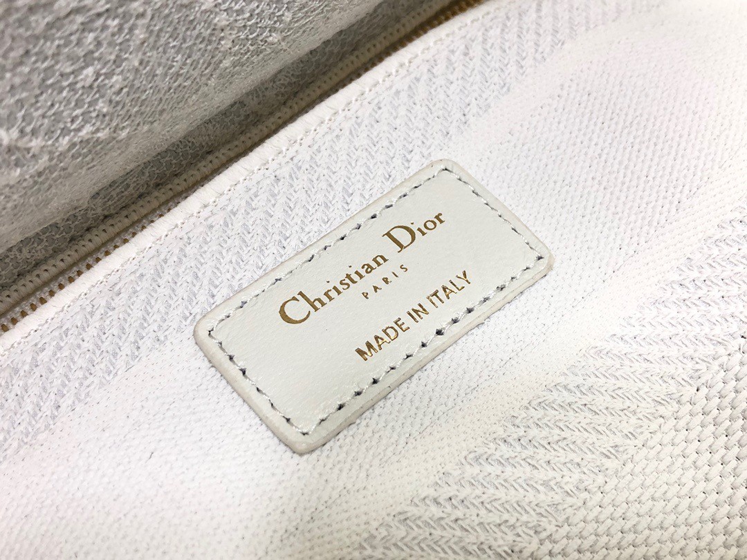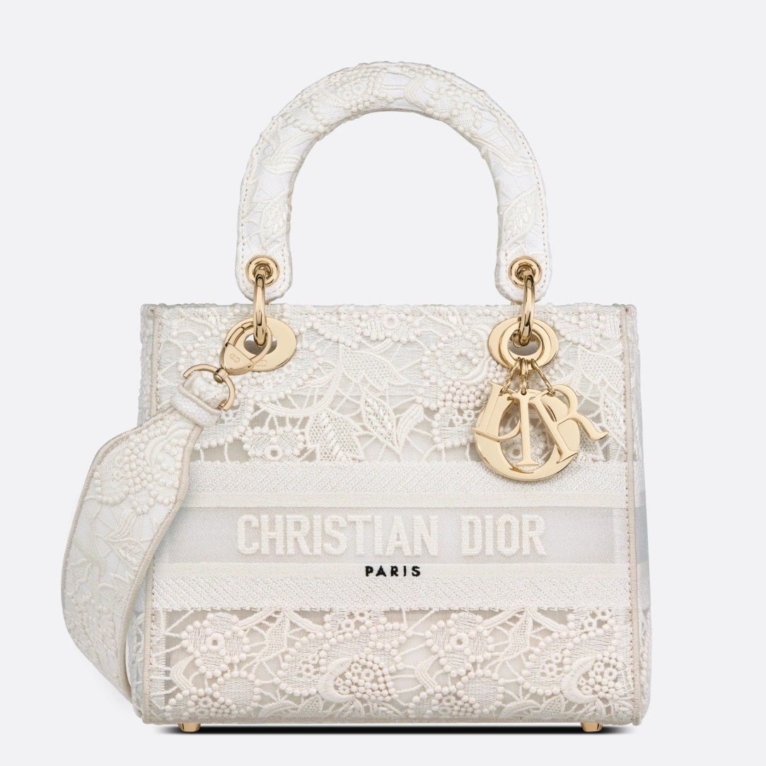 The Lady D-Lite bag combines classic elegance with House modernity. A true demonstration of Dior's savoir-faire, the exceptional style is entirely embroidered with a natural-colored macramé effect, the essence of true elegance. The 'CHRISTIAN DIOR PARIS' signature adorns the front, while 'D.I.O.R.' charms in pale gold-finish metal further enhance the silhouette. Equipped with a wide, reversible and removable embroidered shoulder strap, the medium Lady D-Lite bag can be carried by hand or worn crossbody.