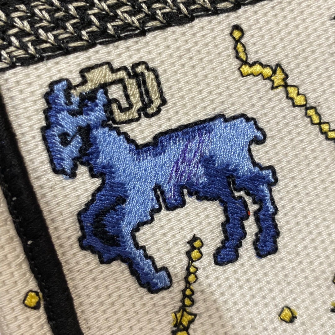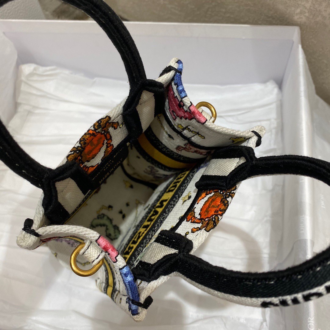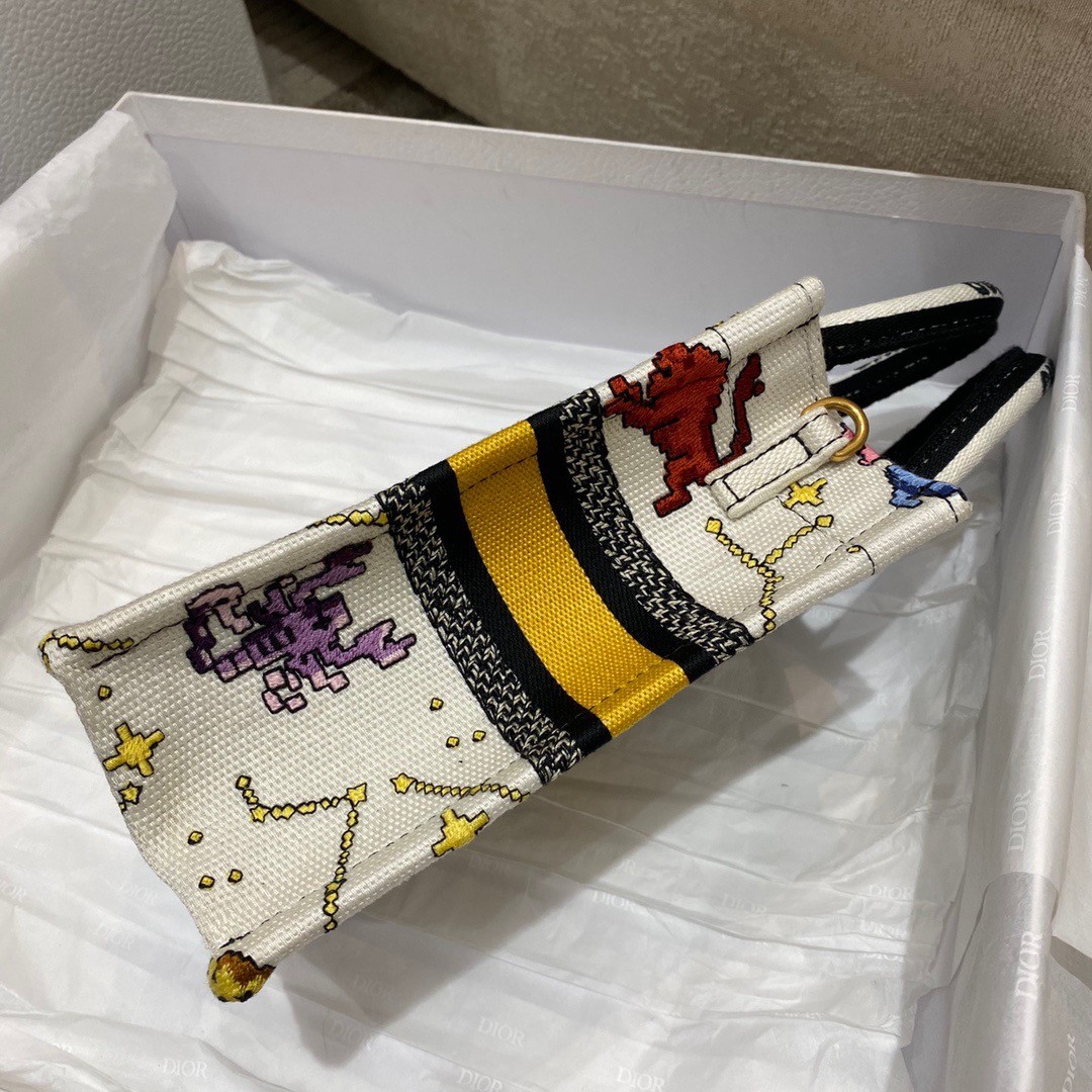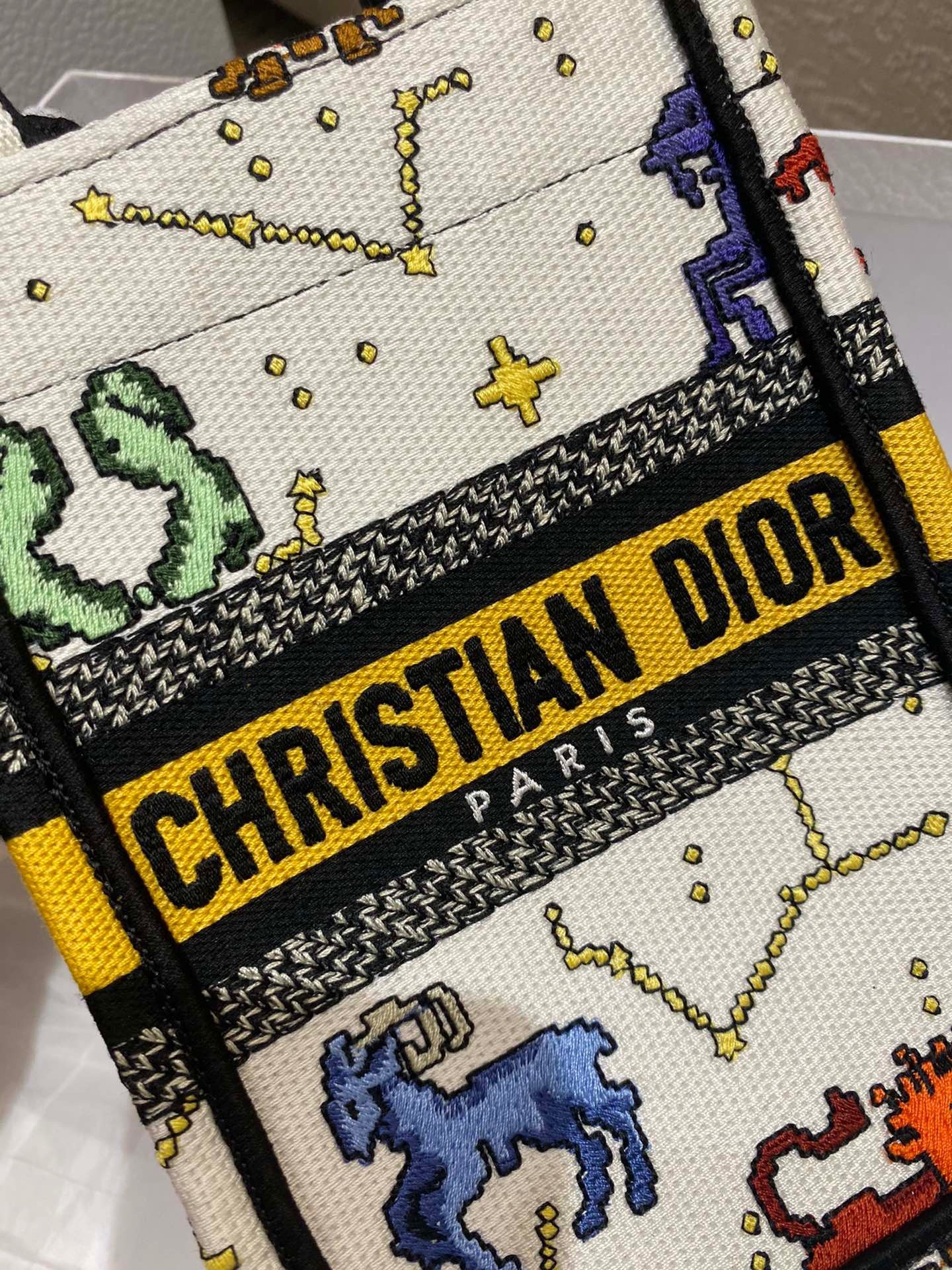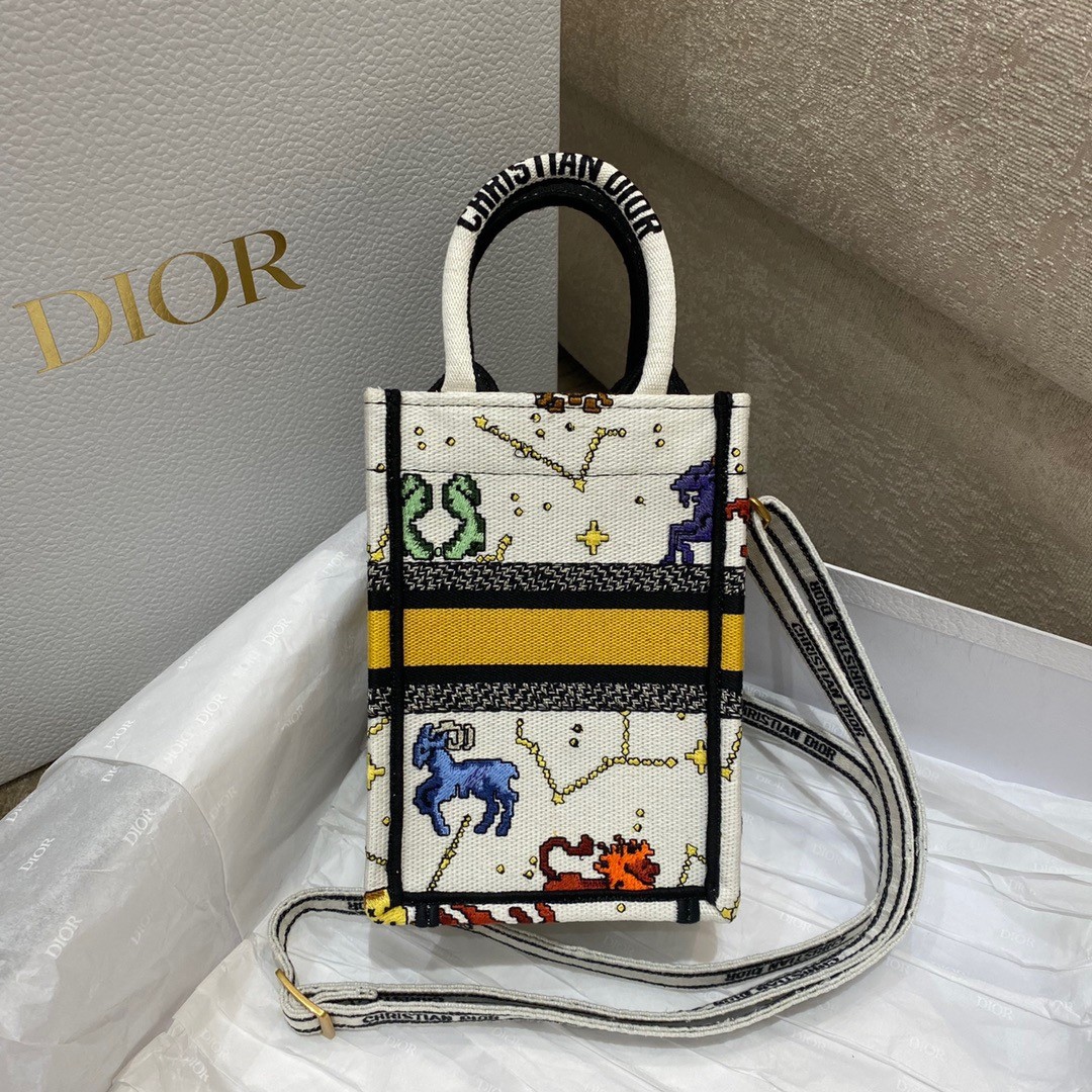 Maria Grazia Chiuri's phone bag enriches the iconic Dior Book Tote line with an ideal example of the House's savoir-faire. The latte style is entirely embroidered with the multicolor Dior Pixel Zodiac motif, offering a new take on astrological signs in a whimsical and colorful universe. Enhanced by the 'CHRISTIAN DIOR PARIS' signature on the front, the miniature bag will accommodate a phone as well as the small daily essentials. Completed by an adjustable and removable embroidered shoulder strap, the modern accessory can be carried by hand, worn over the shoulder or crossbody.