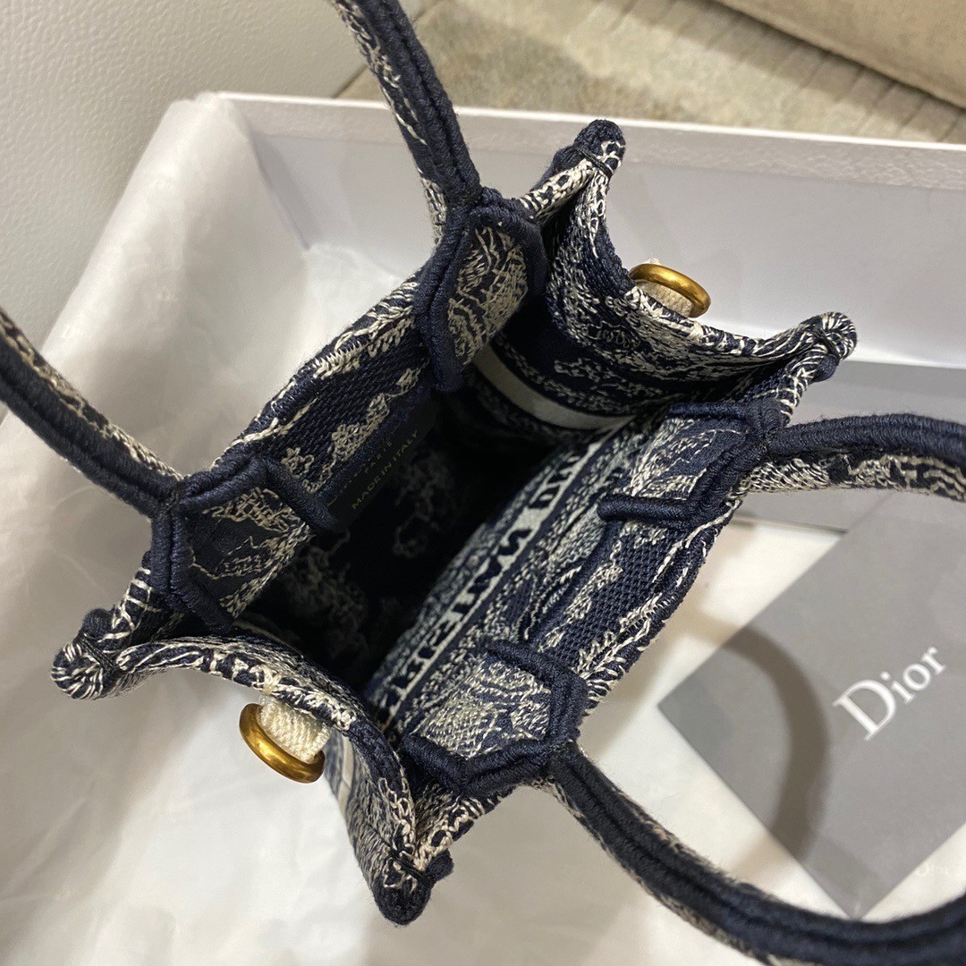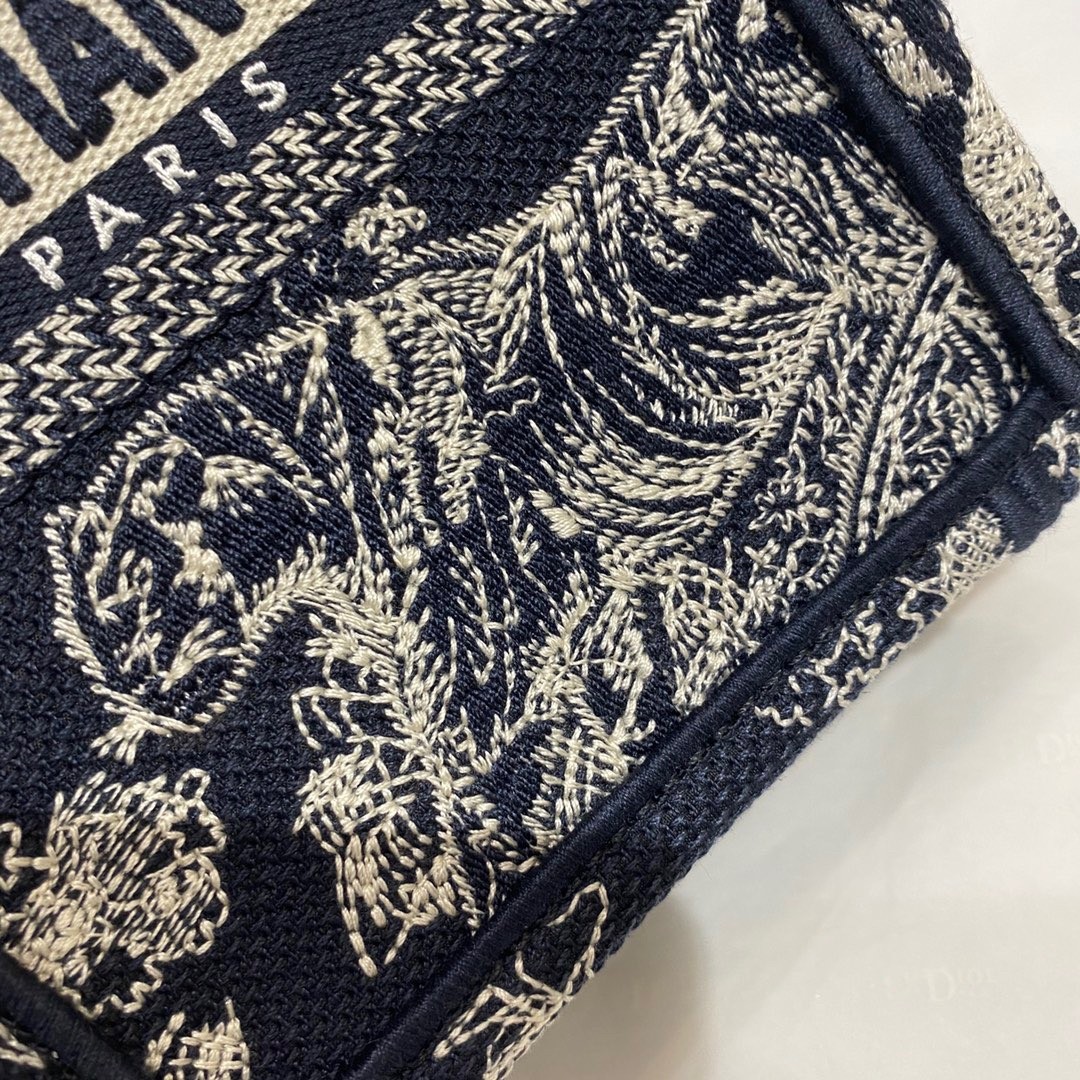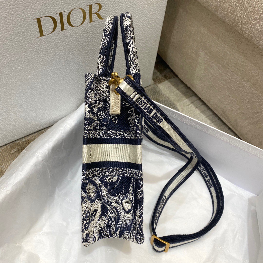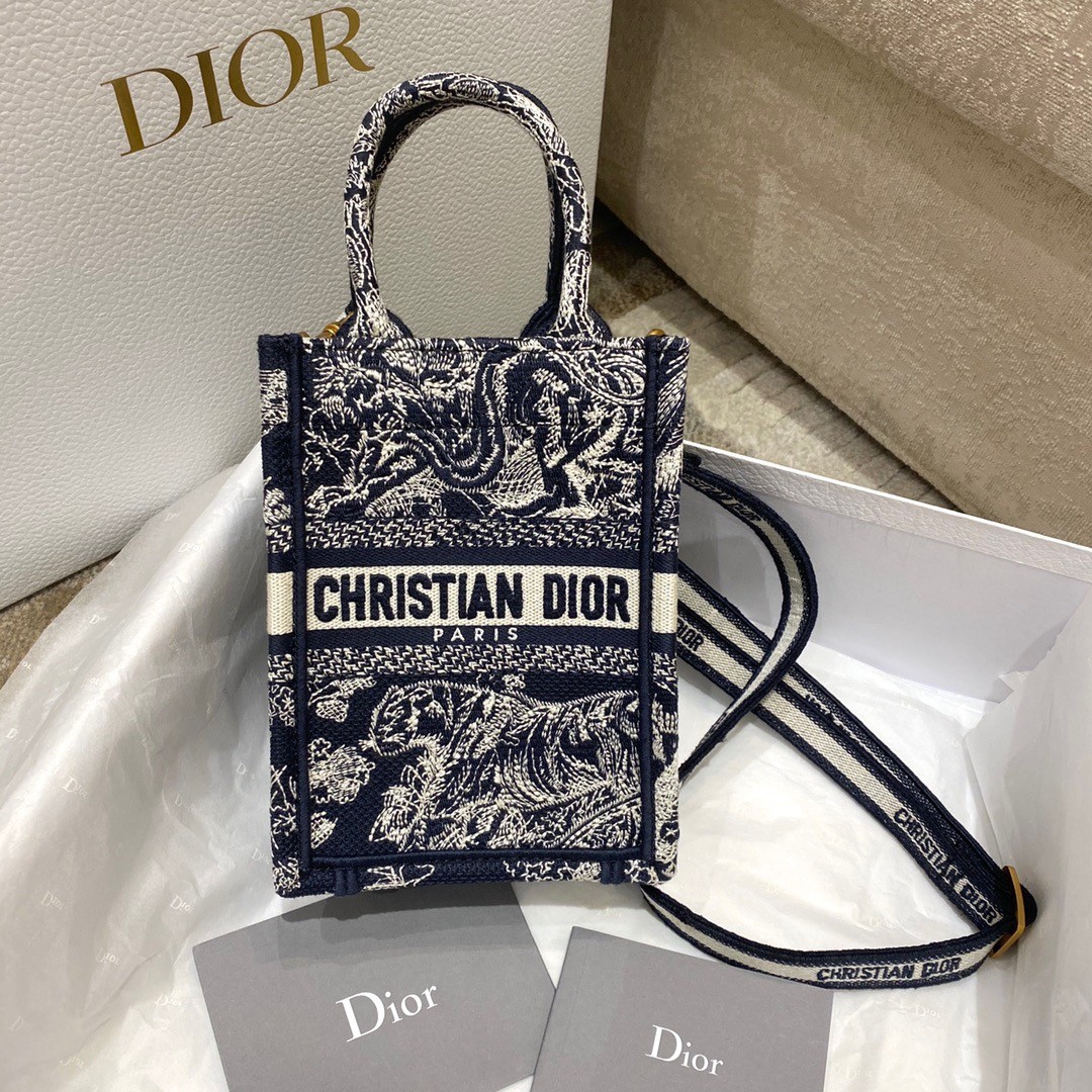 This season, Maria Grazia Chiuri's phone bag is enriching the iconic Dior Book Tote line. A perfect example of the House's savoir-faire, the style is entirely embroidered with the blue Toile de Jouy Reverse motif, a play on the hallmark House pattern using reversed colors. Enhanced by the 'CHRISTIAN DIOR PARIS' signature on the front. The miniature bag will accommodate a phone as well as small daily essentials. Completed by an adjustable and removable embroidered shoulder strap, the modern accessory can be worn in the hand, on the shoulder or crossbody.