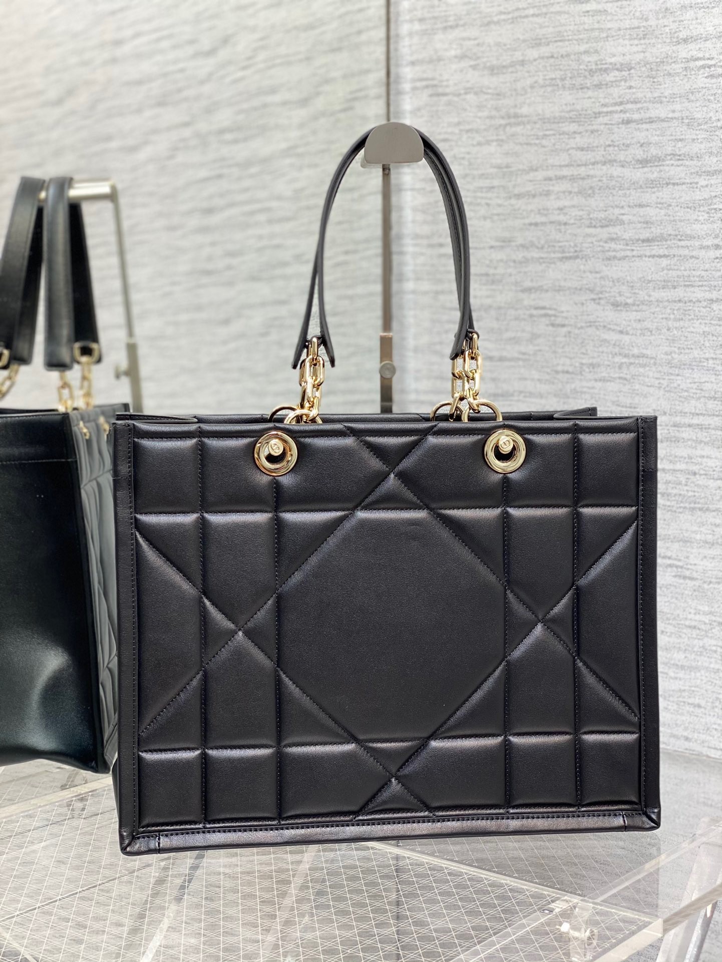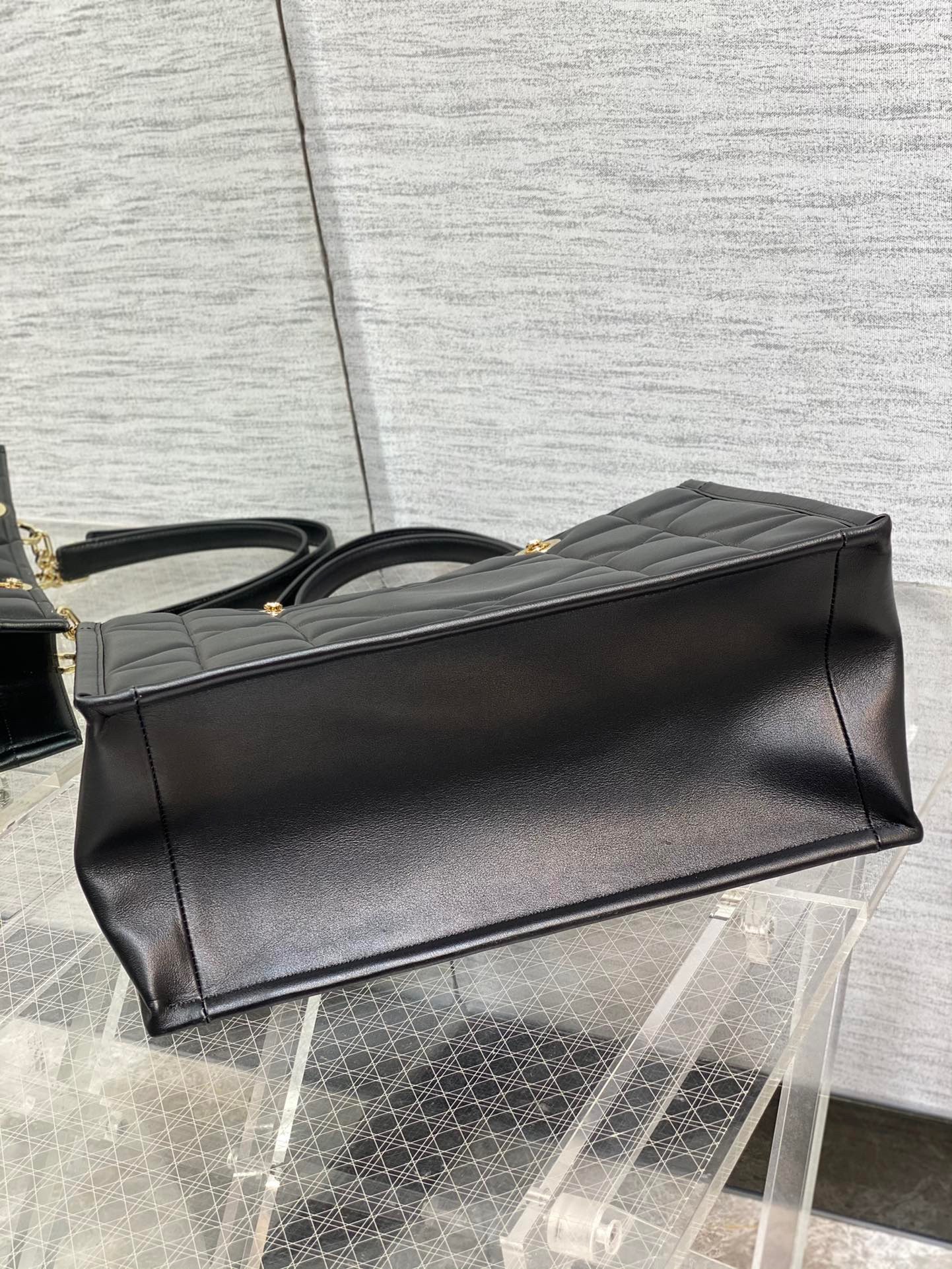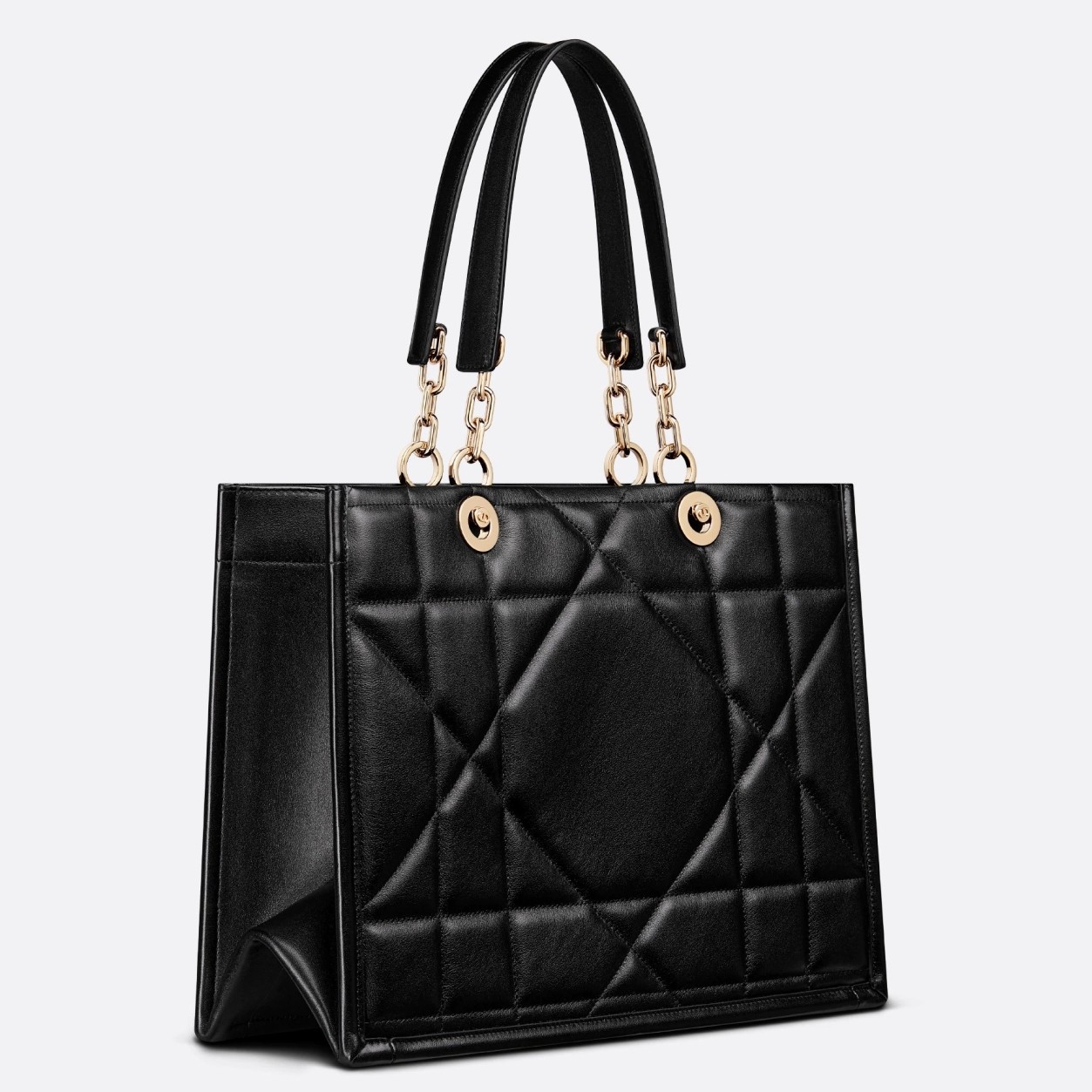 A new House staple debuted at the Fall-Winter 2022-2023 ready-to-wear fashion show, the Dior Essential tote bag presents a functional design with modern elegance. Crafted in satin-finish calfskin, it is adorned with the Archicannage motif, offering a new take on the iconic House topstitching. The spacious interior features four patch pockets and one zipped pocket to accommodate all of the essentials. Featuring leather and pale gold-finish metal chain top handles, the medium tote may be worn over the shoulder or carried by hand as an ideal daily companion.