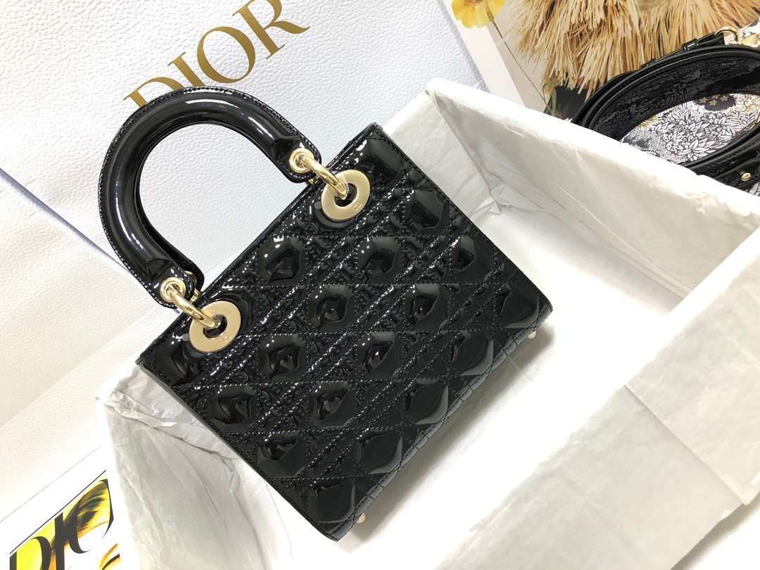 The Lady Dior bag epitomizes Dior's vision of elegance and beauty. Sleek and refined, the timeless style is crafted in patent calfskin with Cannage stitching, creating the instantly recognizable quilted texture. Pale gold-finish metal 'D.I.O.R.' charms further embellish its silhouette. The small Lady Dior bag features a thin, removable leather shoulder strap and can be carried by hand or worn crossbody.