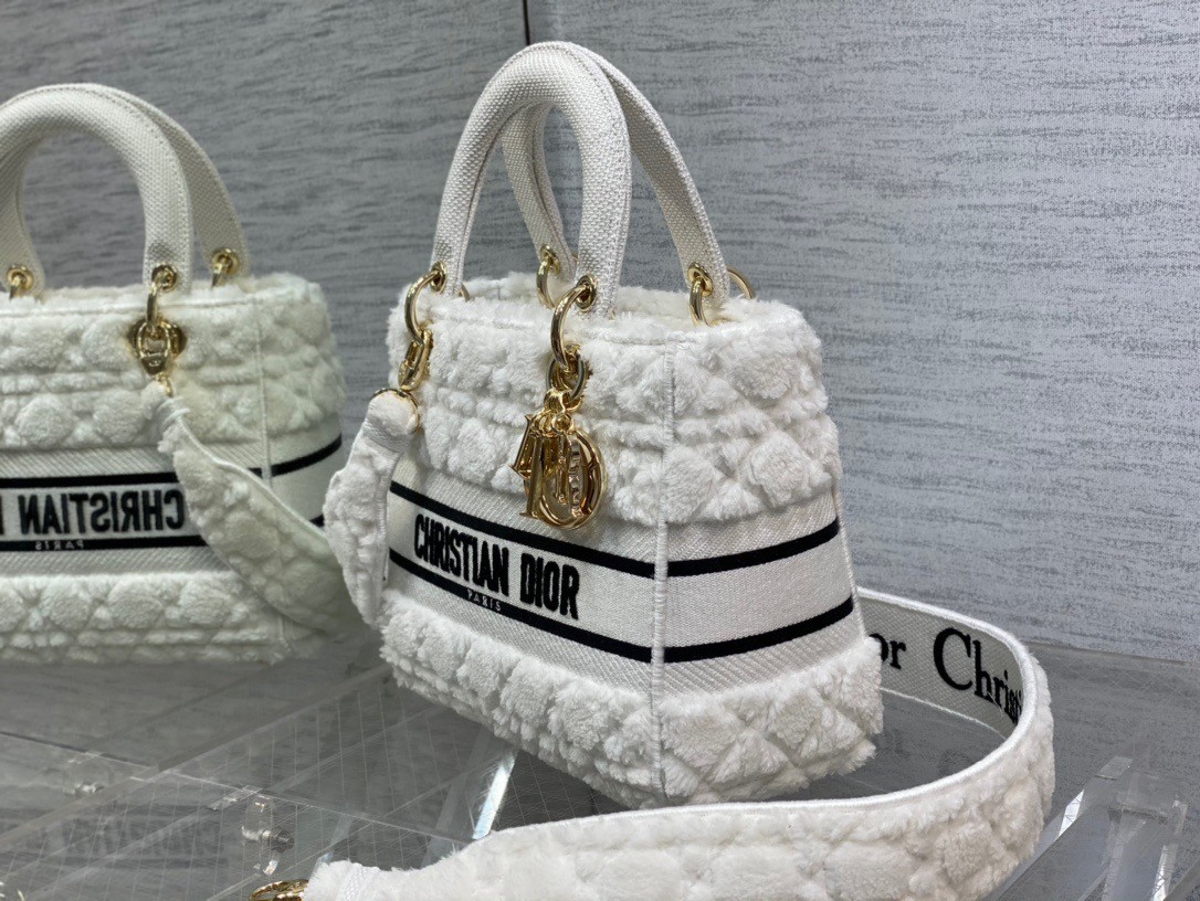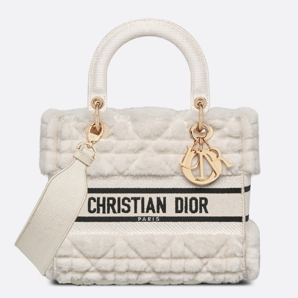 The Lady D-Lite bag combines classic elegance with House modernity. The white shearling style showcases the Cannage motif. A 'CHRISTIAN DIOR PARIS' signature adorns the front, while 'D.I.O.R.' charms in pale gold-finish metal further enhance and highlight the silhouette. Featuring a wide, removable and reversible embroidered shoulder strap, the medium Lady D-Lite bag can be carried by hand or worn crossbody.