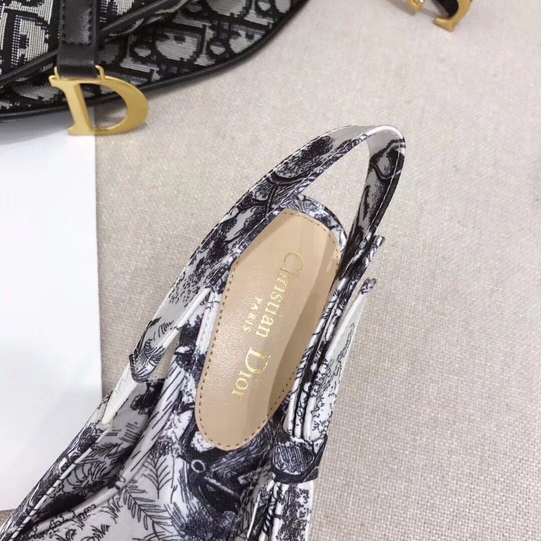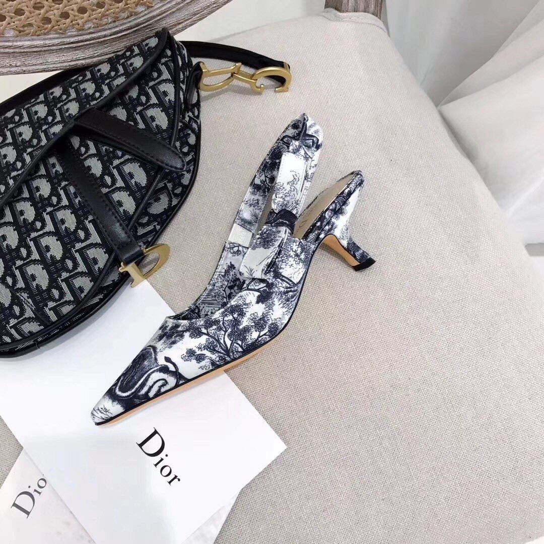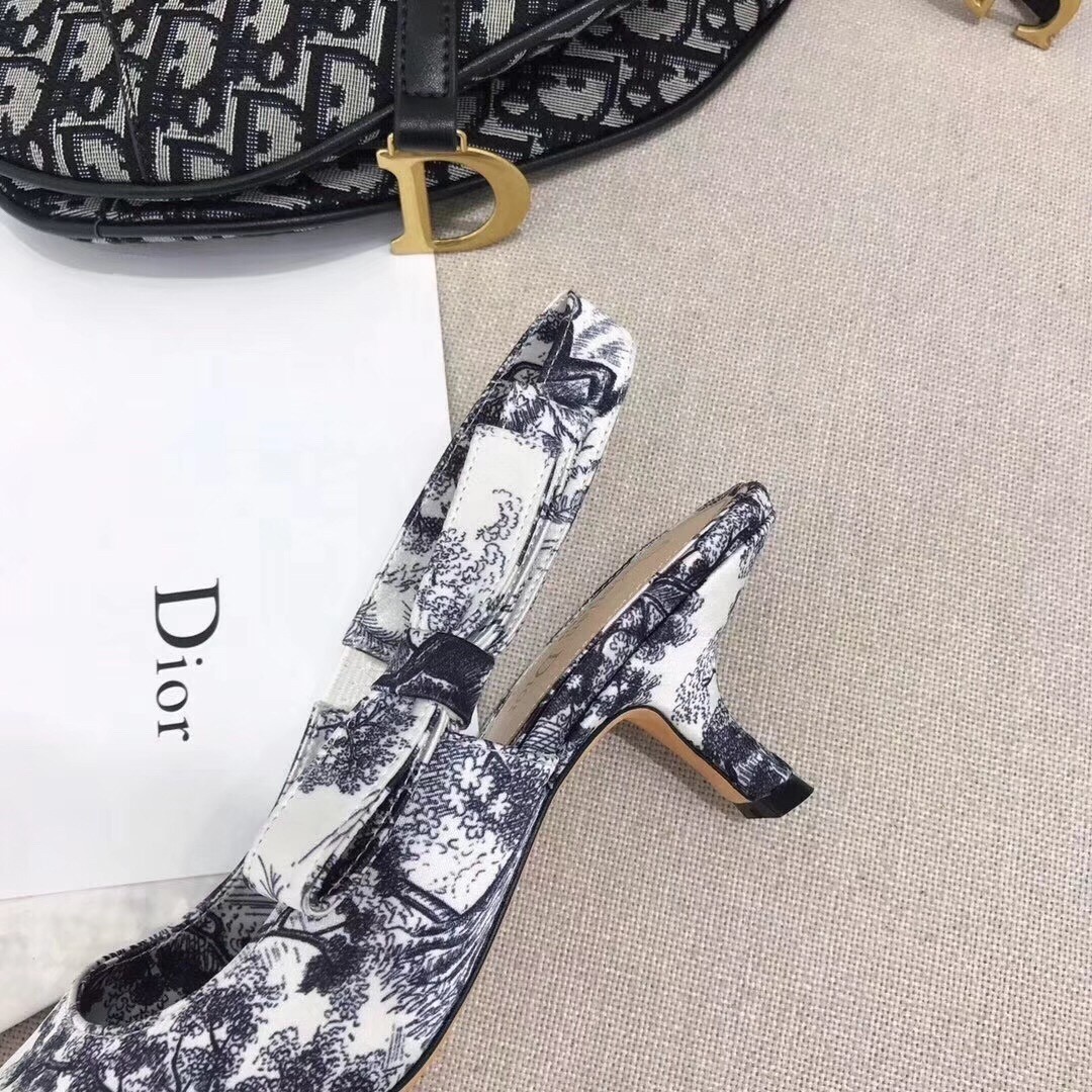 Slingback high-heeled shoe in off-white and black Toile de Jouy printed fabric, 6.5 cm comma heel. These pumps feature leather sole with star accessory, one of Christian Dior's favourite symbols.