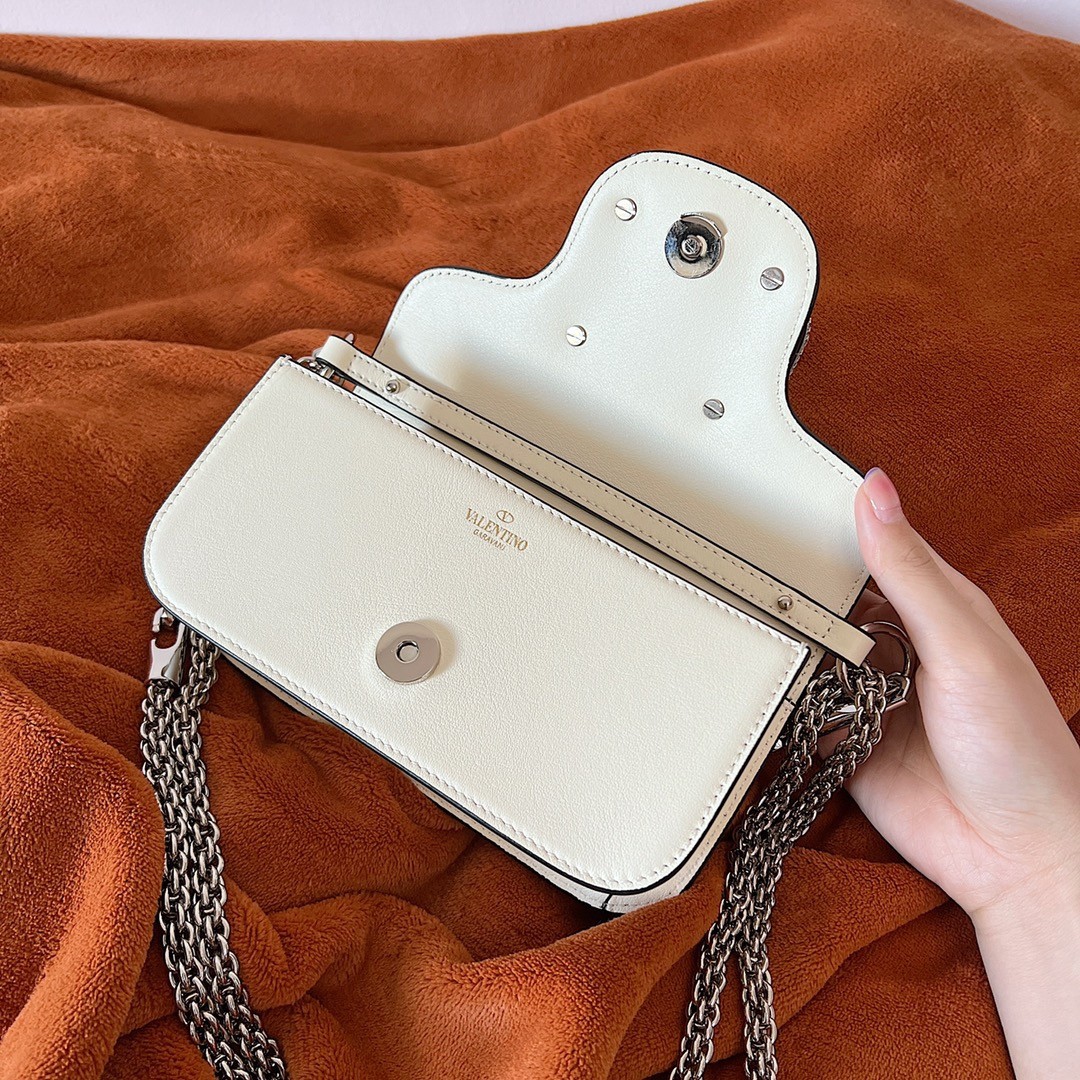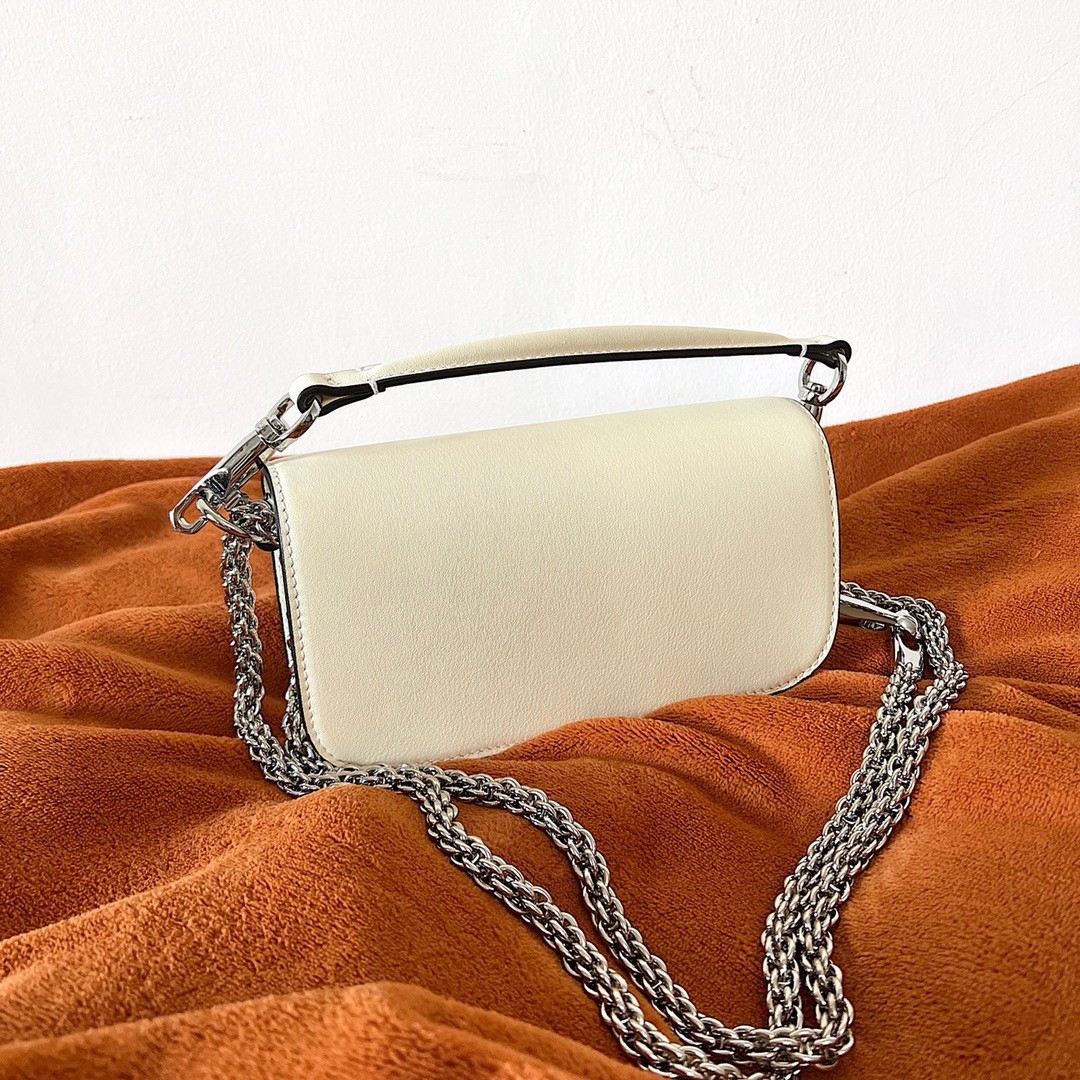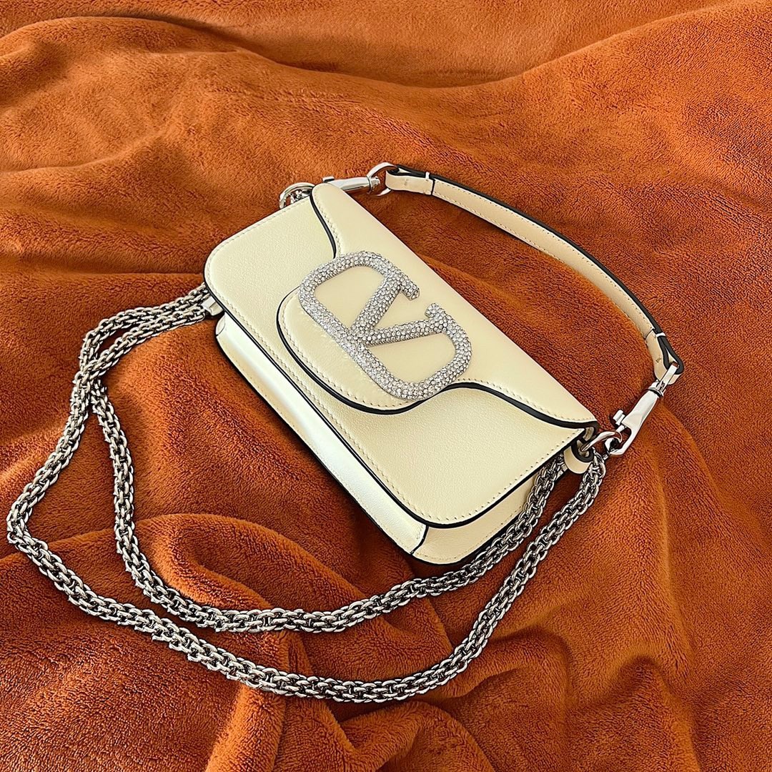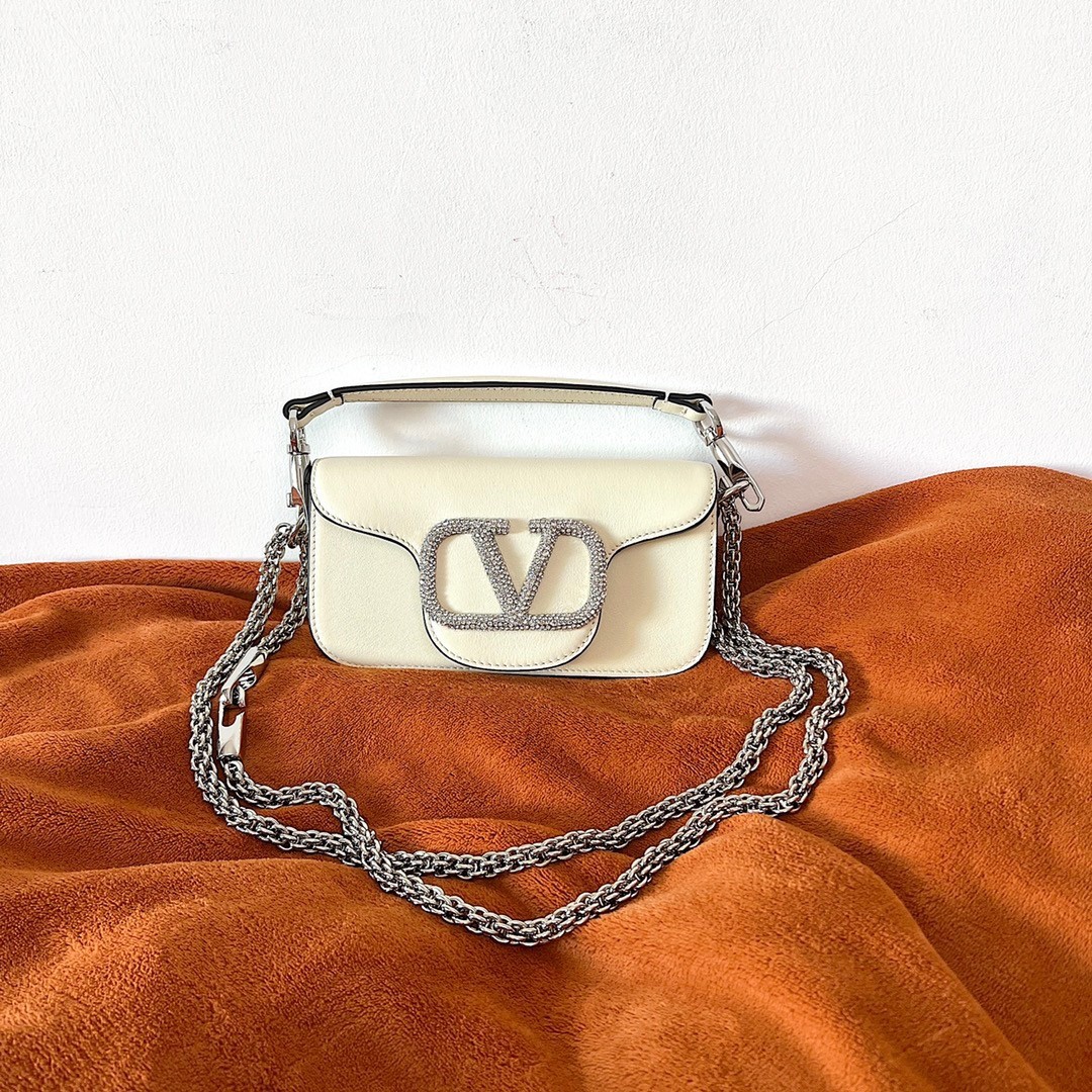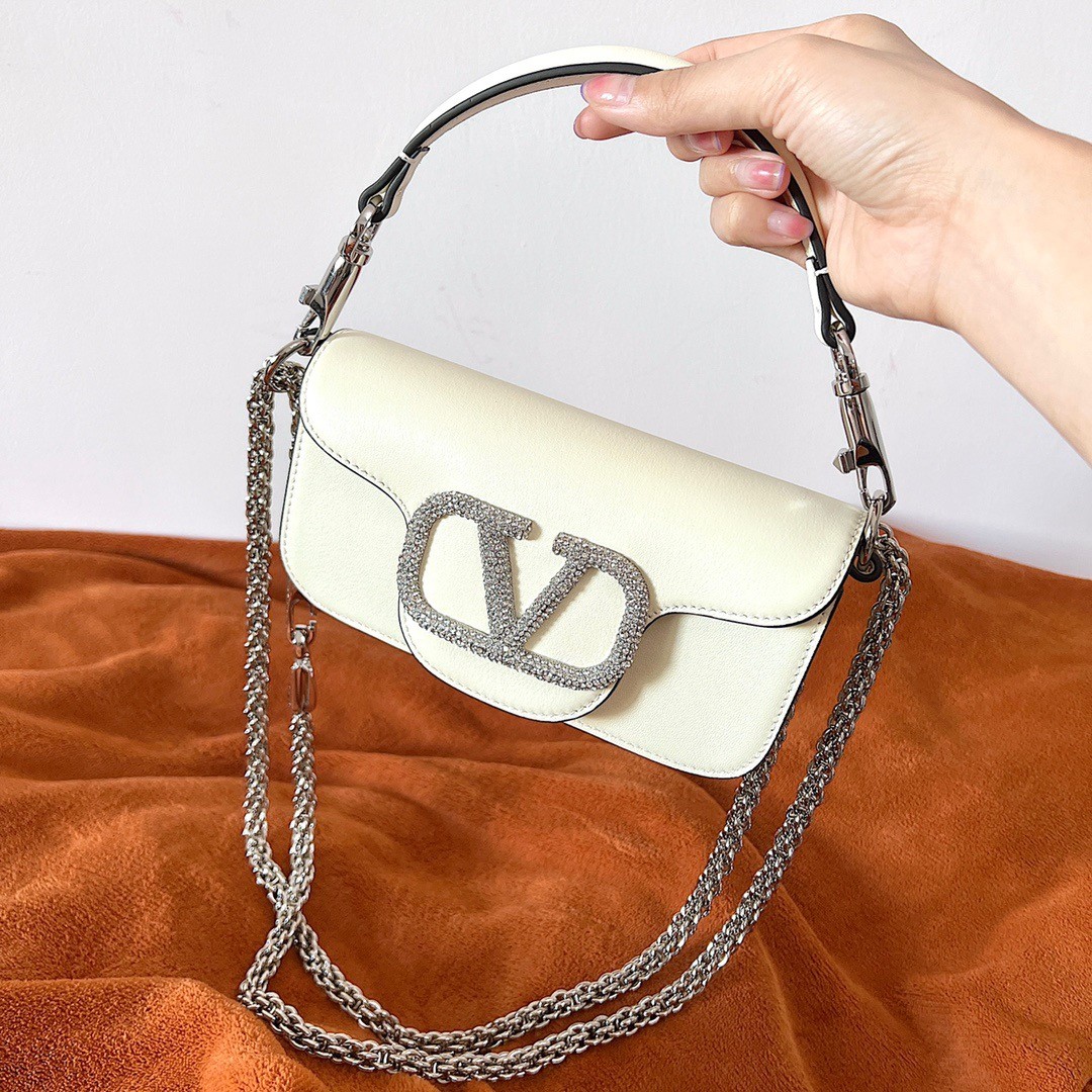 Valentino presents the new Valentino Garavani Locò bag, an expression of the metropolitan and festive atmosphere that animates the Maison. The elongated and compact design, with a 90s allure, combines in the accessory an essential functionality with a contemporary feel. Made from smooth calfskin, this Small design features VLogo Signature element adorned with Swarovski® crystals.