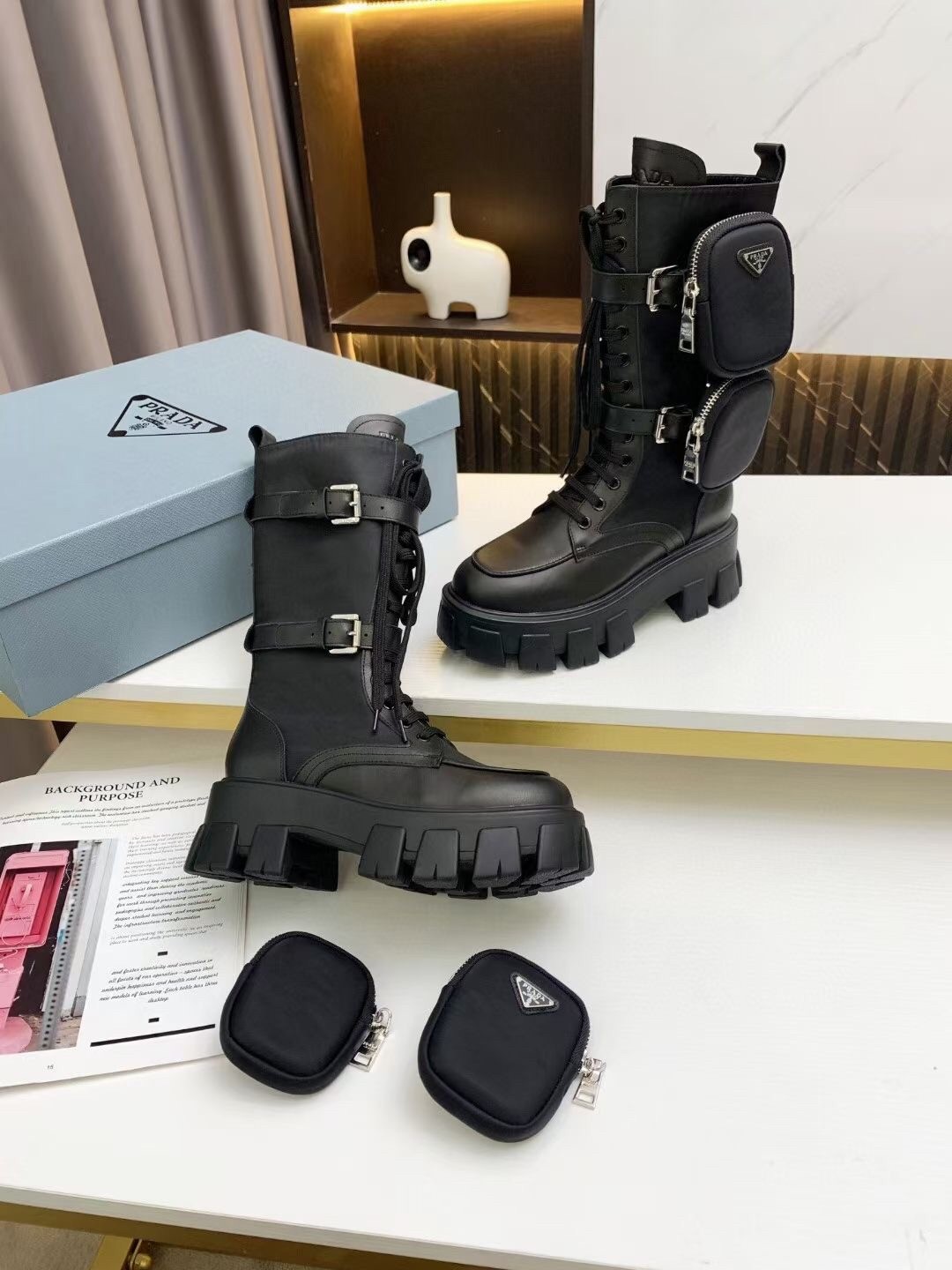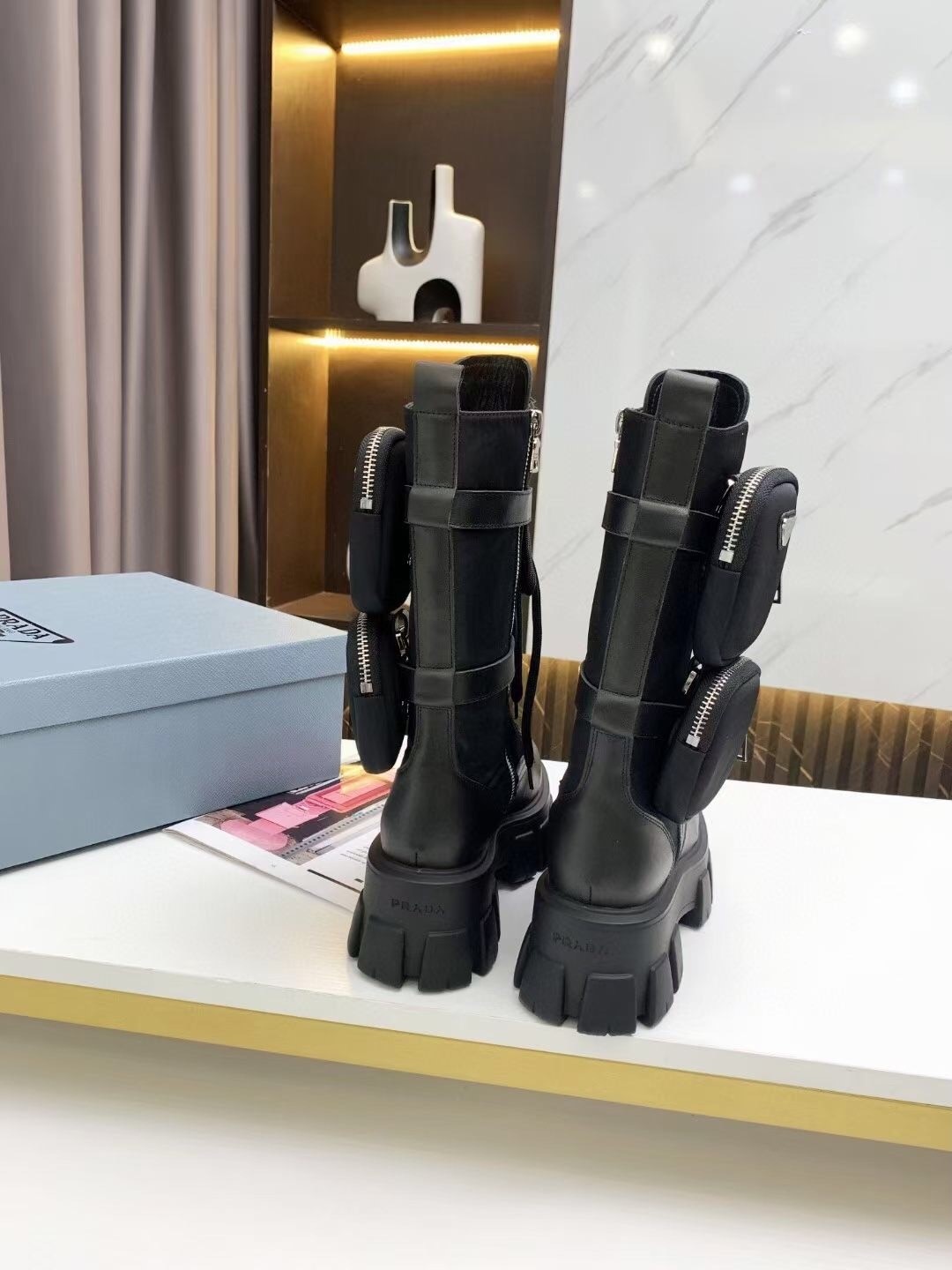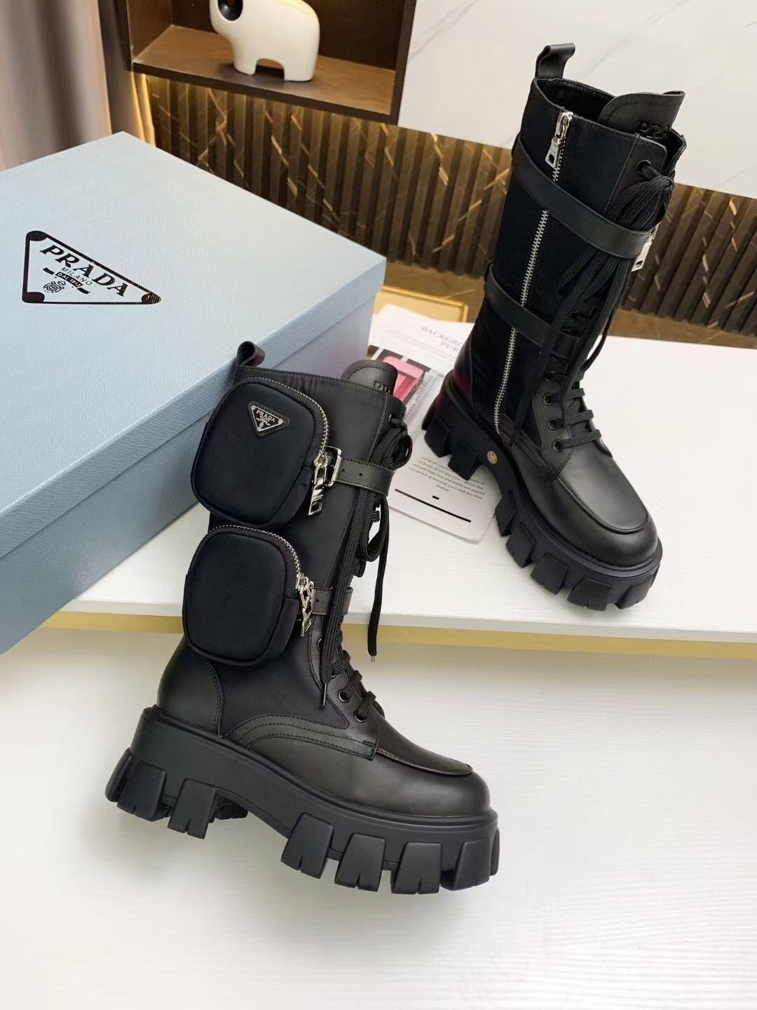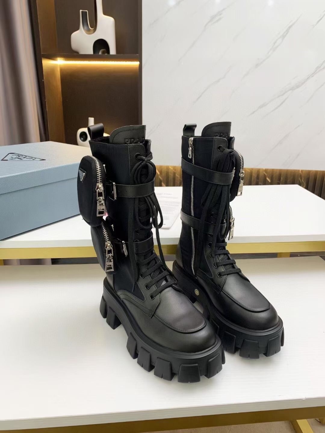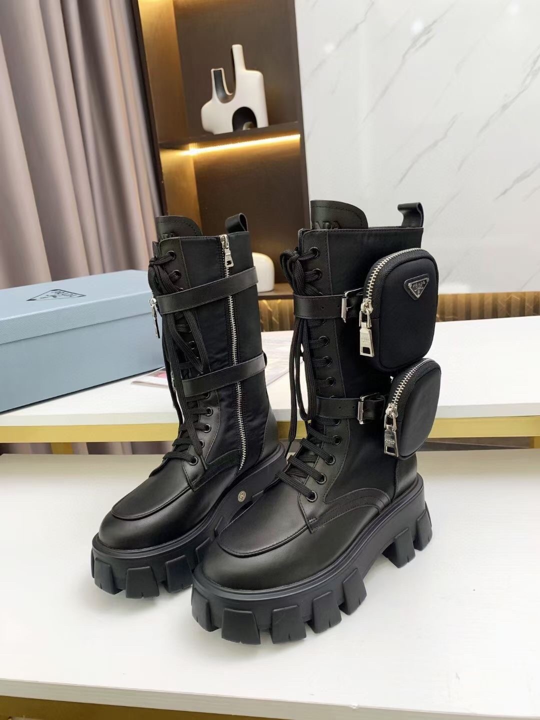 The emblematic imagery linked to the uniform that distinguishes Prada collections inspires the design of the Monolith line through diametrically opposed concepts that come together in a harmonious dialogue. The maxi rubber sole with a unique, timeless, monolithic aesthetic enhances the style of the upper that reinterprets biker boots with a combination of leather and nylon.