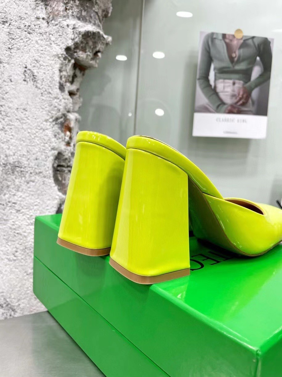 The Italian fashion house Bottega Veneta perfectly combines craftsmanship and heritage with a modern attitude. The Tower High Heel Mules are crafted from glossy patent leather in a supergloss finish, featuring a square toe, flared block heel and debossed logo at footbed.