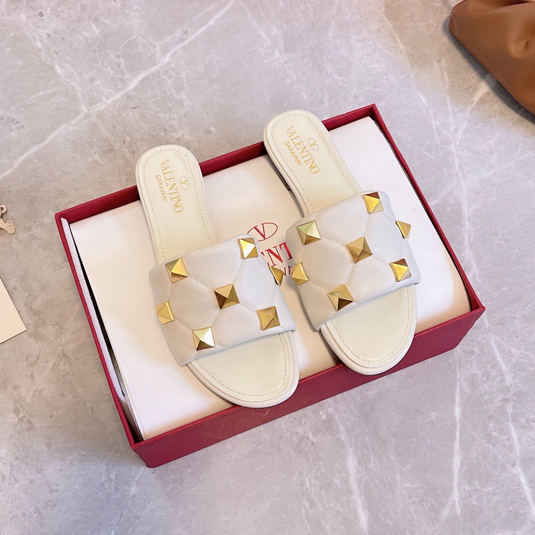 Valentino Roman Stud Flat Slides In White Quilted Nappa