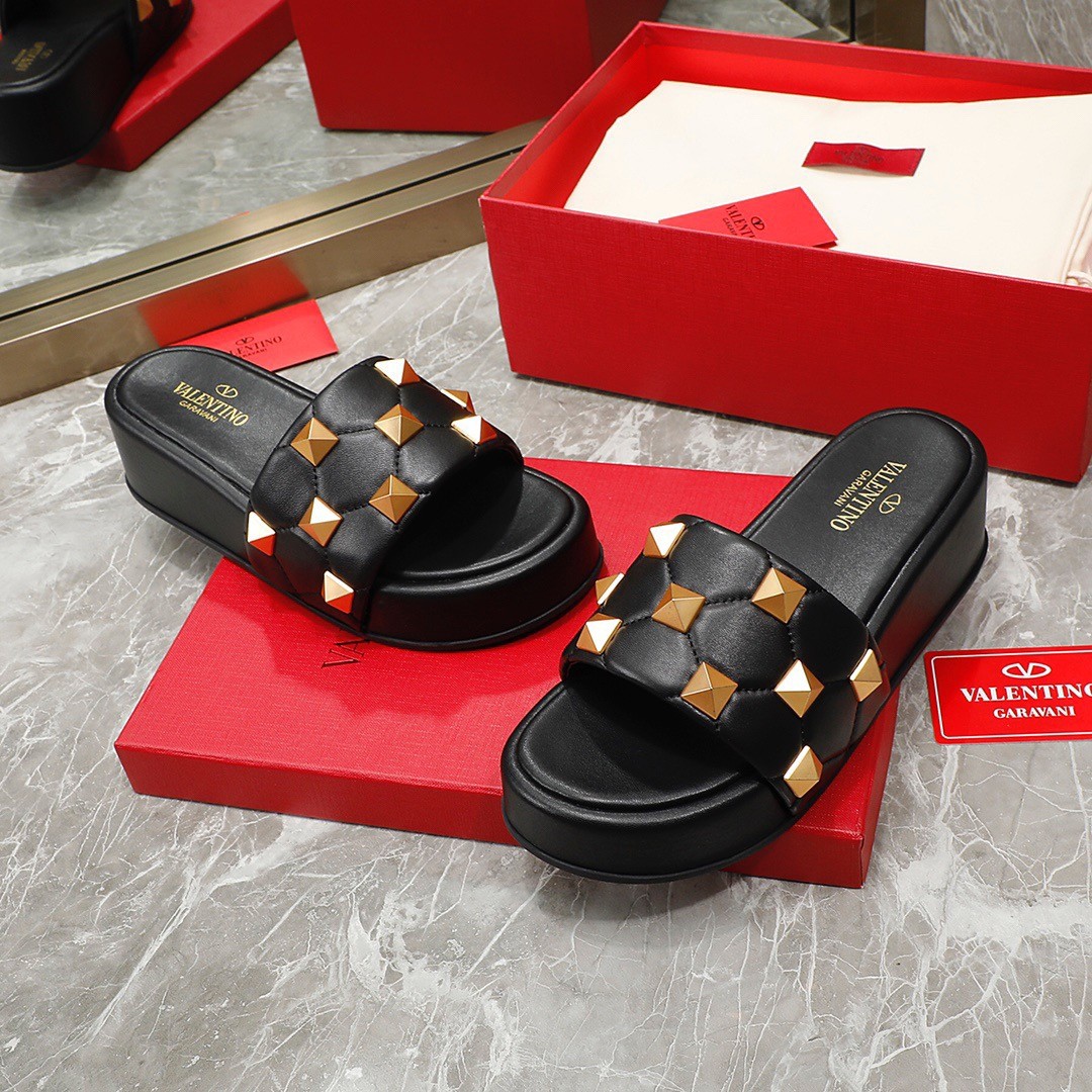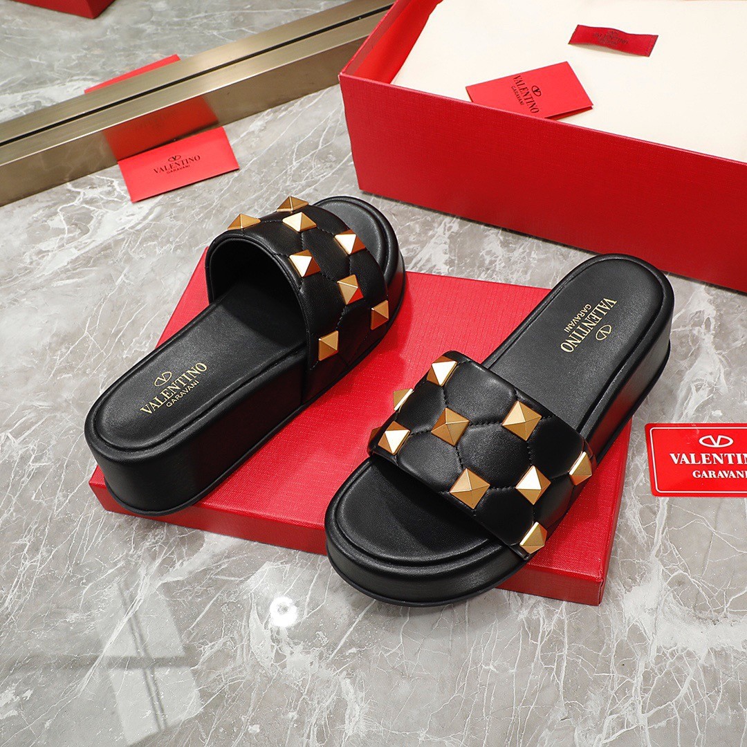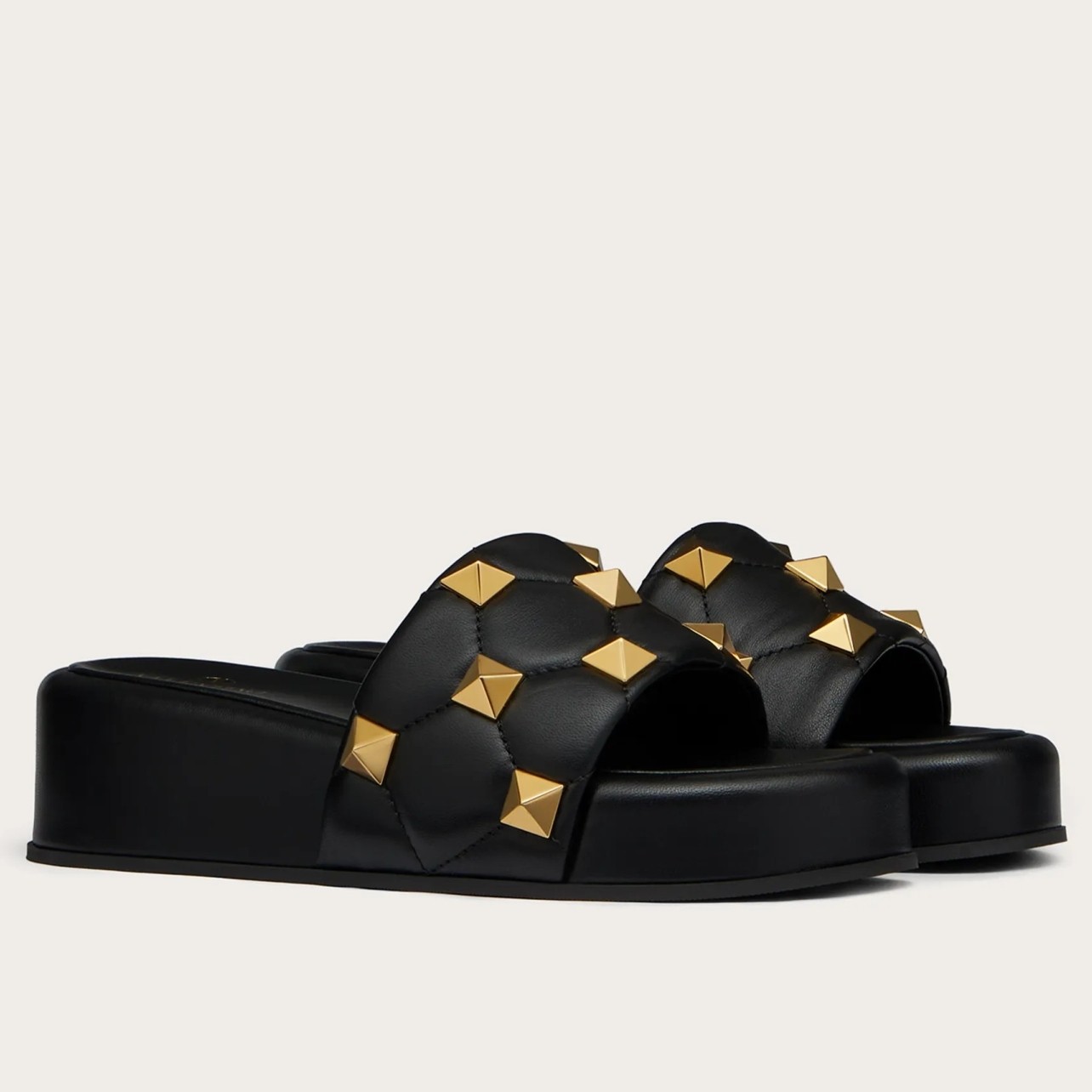 Valentino Roman Stud Flatform Slides In Black Nappa Leather