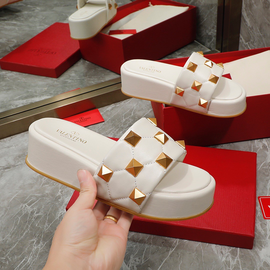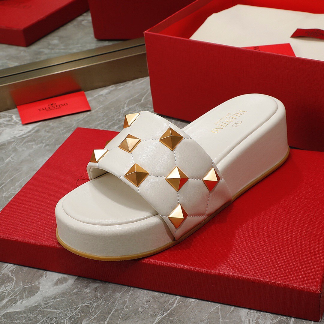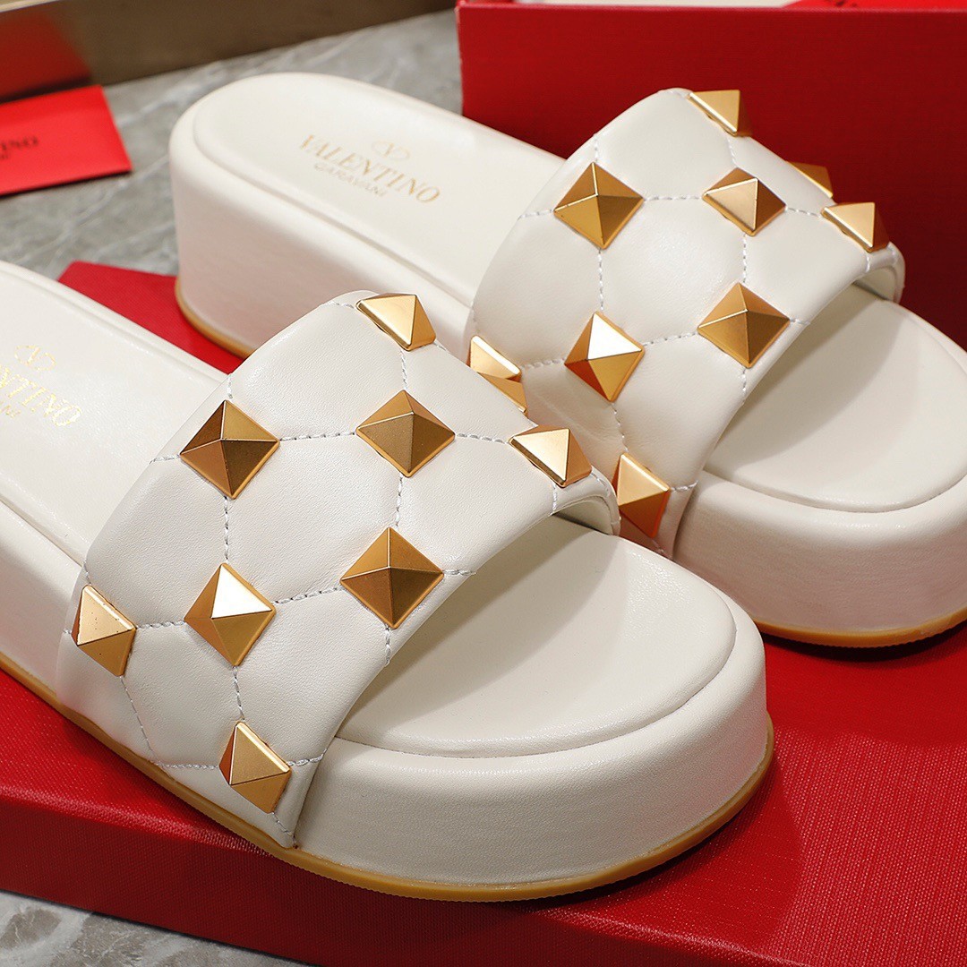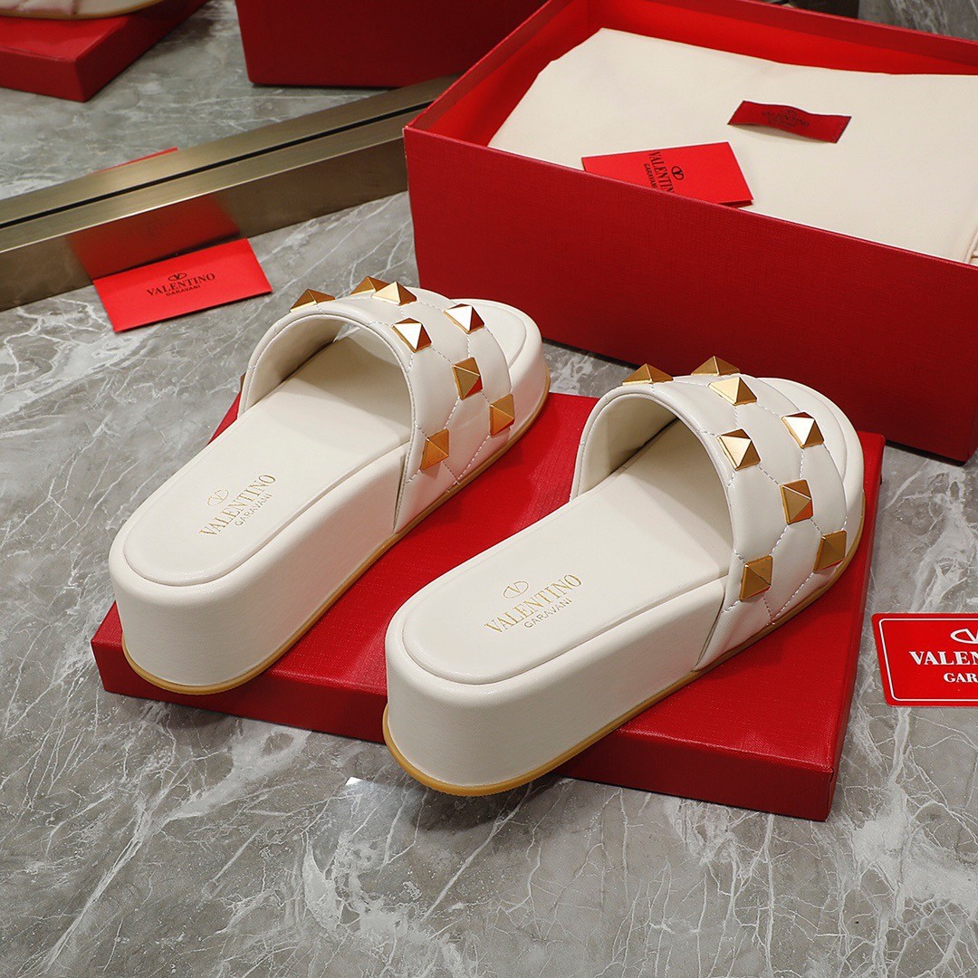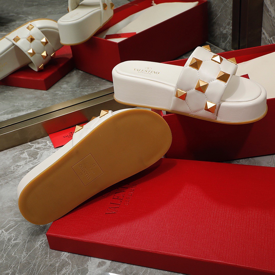 Valentino Roman Stud Flatform Slides In White Nappa Leather