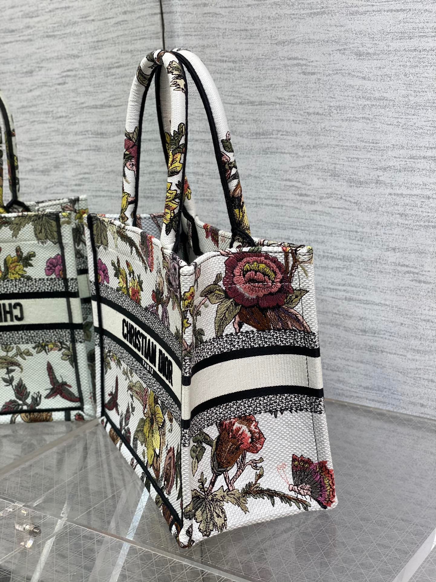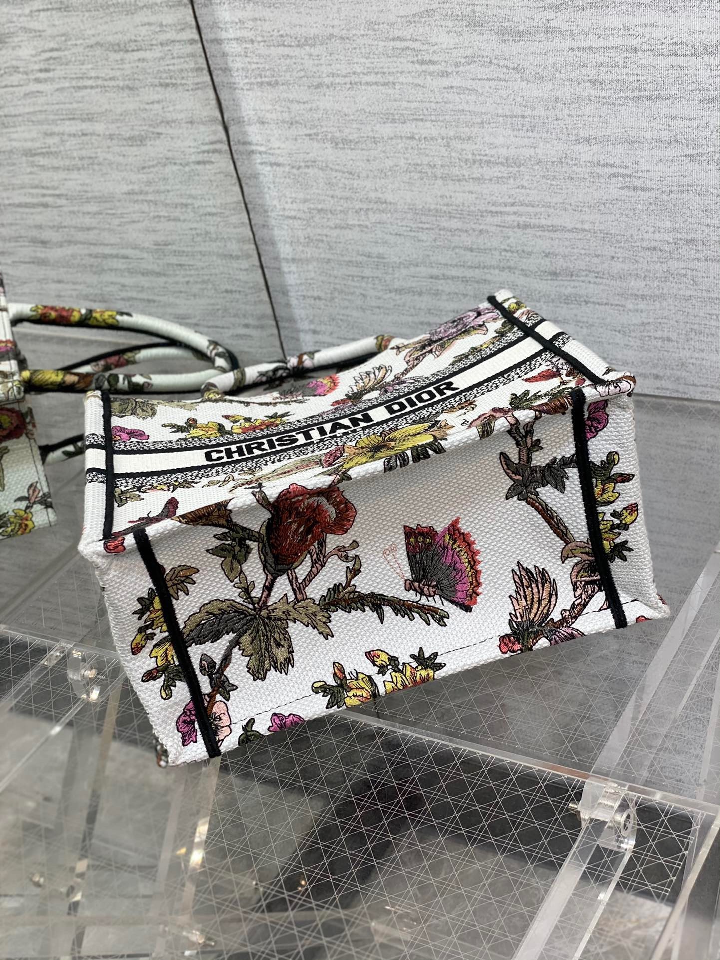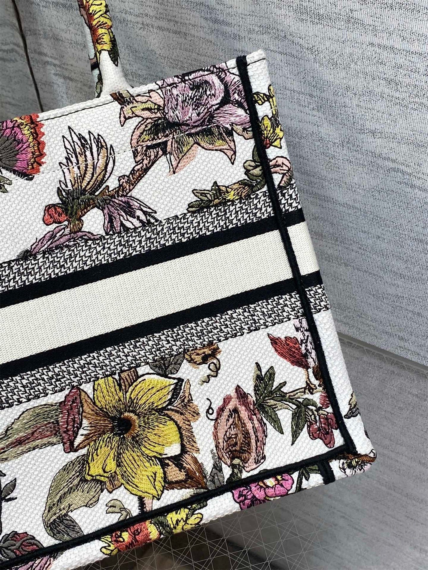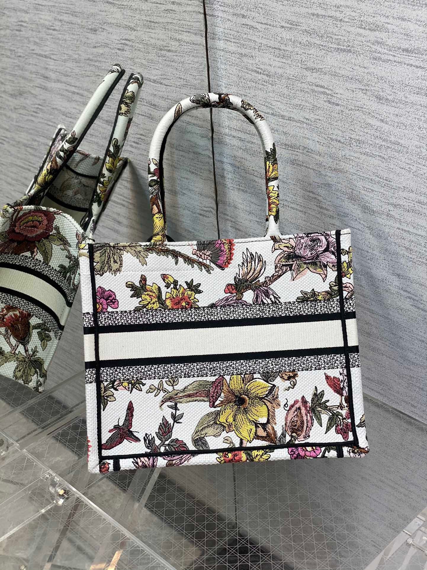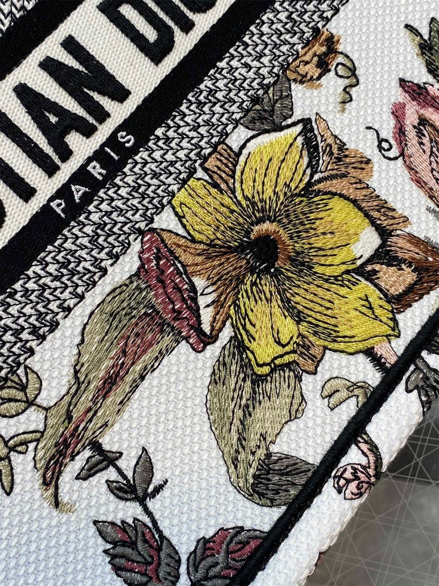 The Dior Book Tote is an original creation introduced by Maria Grazia Chiuri, Dior's Creative Director, and has become a staple of the Dior aesthetic. Designed to hold all the daily essentials, it is fully embroidered with the white multicolor Dior Jardin Botanique motif and presents a romantic floral pattern inspired by the Granville gardens so dear to Mr. Dior. Adorned with the 'CHRISTIAN DIOR PARIS' signature on the front, the small tote exemplifies the House's signature savoir-faire and may be carried by hand or worn over the shoulder.