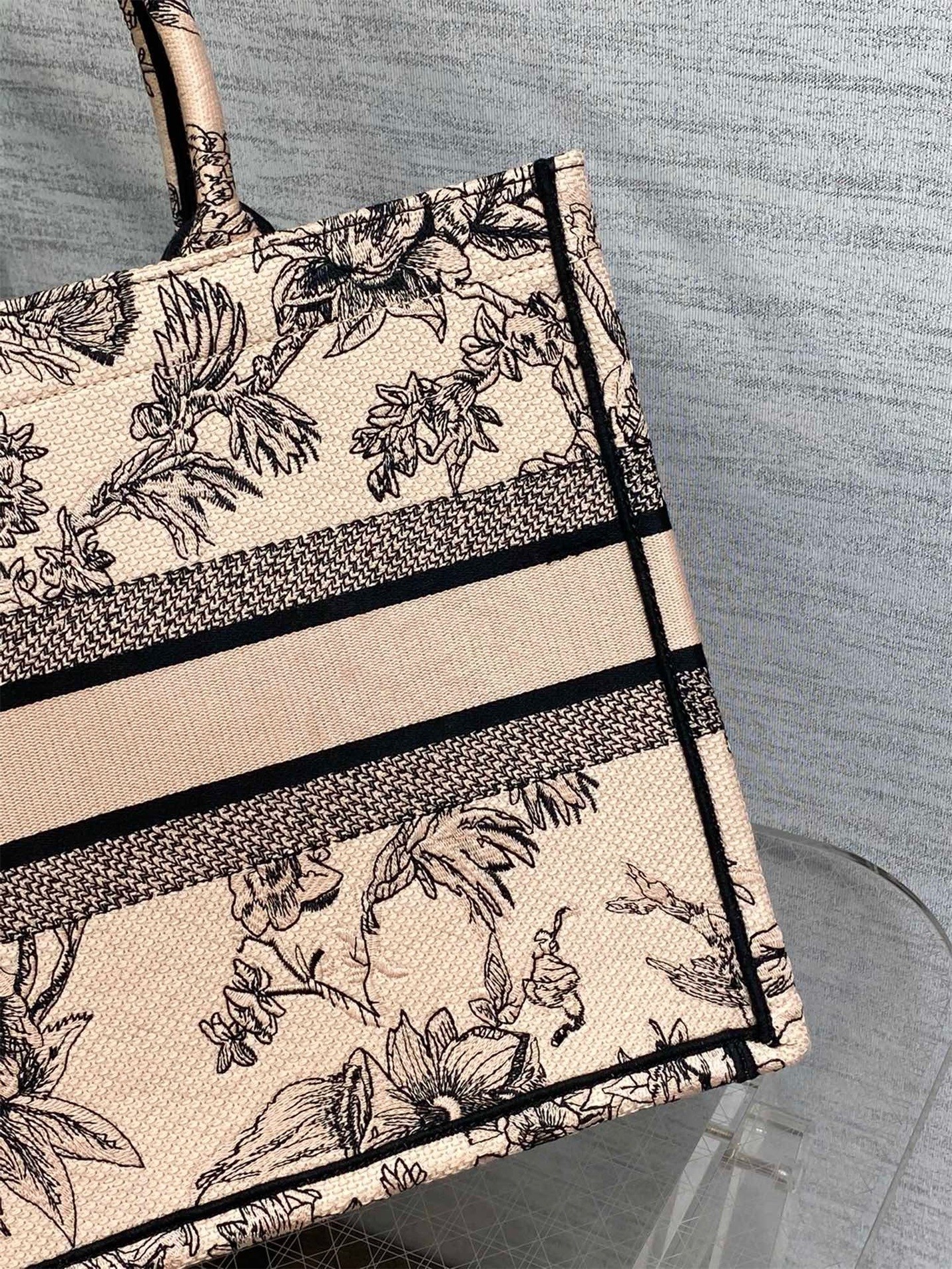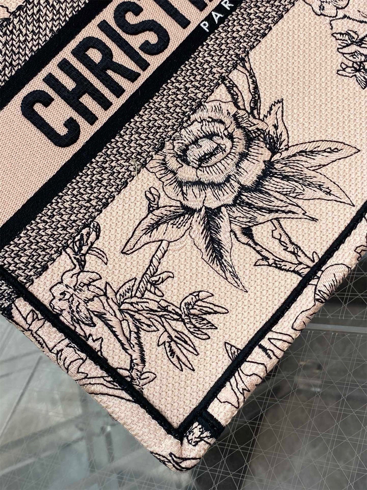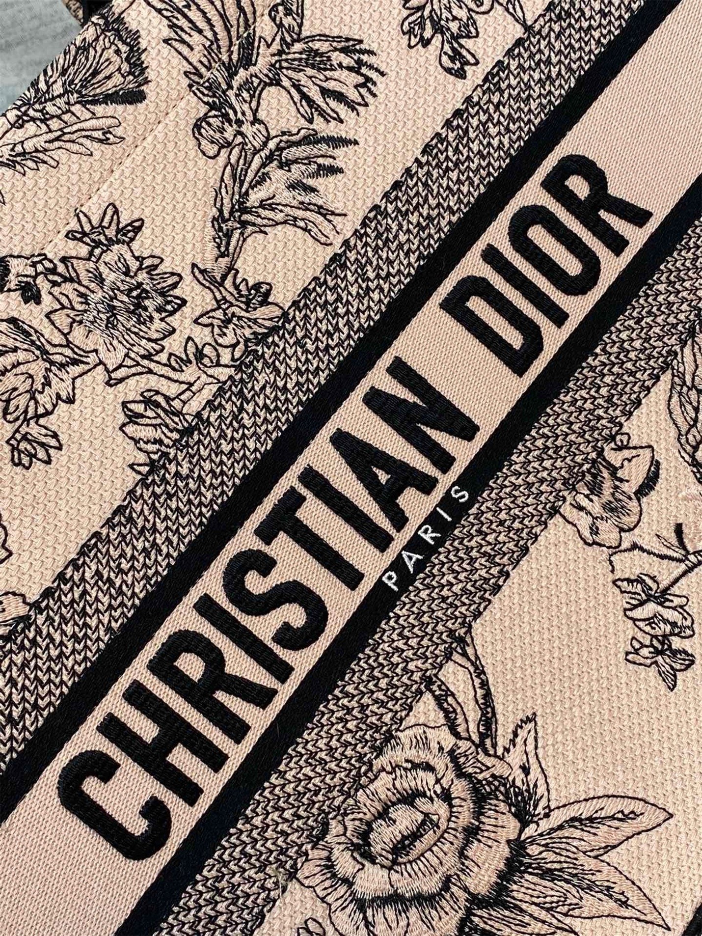 The Dior Book Tote is an original creation introduced by Maria Grazia Chiuri, Dior's Creative Director, and has become a staple of the Dior aesthetic. Designed to hold all the daily essentials, it is fully embroidered with the powder pink Dior Jardin Botanique motif and presents a romantic floral pattern inspired by Mr. Dior's beloved Granville gardens. Adorned with the 'CHRISTIAN DIOR PARIS' signature on the front, the medium tote exemplifies the House's signature savoir-faire and may be carried by hand or worn over the shoulder.