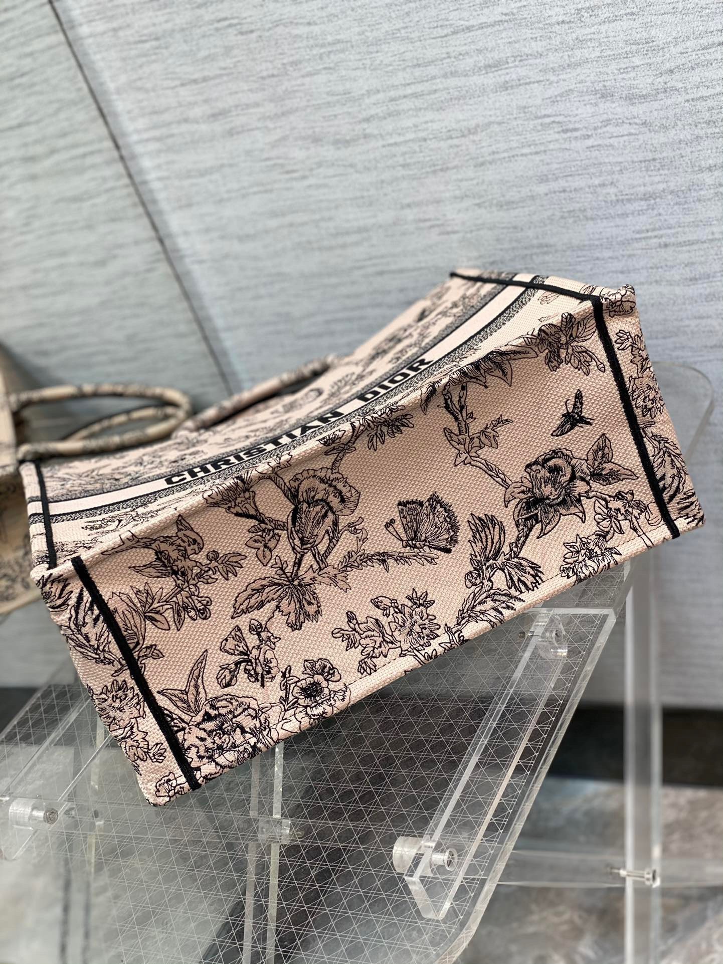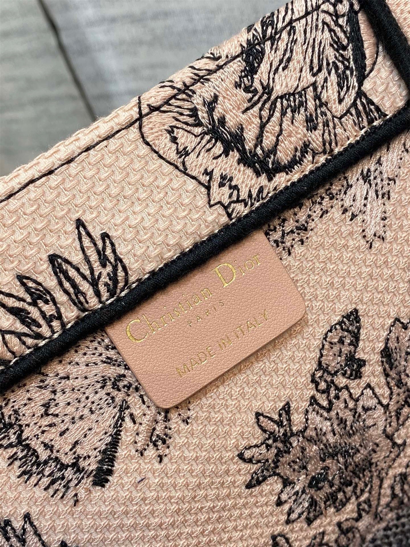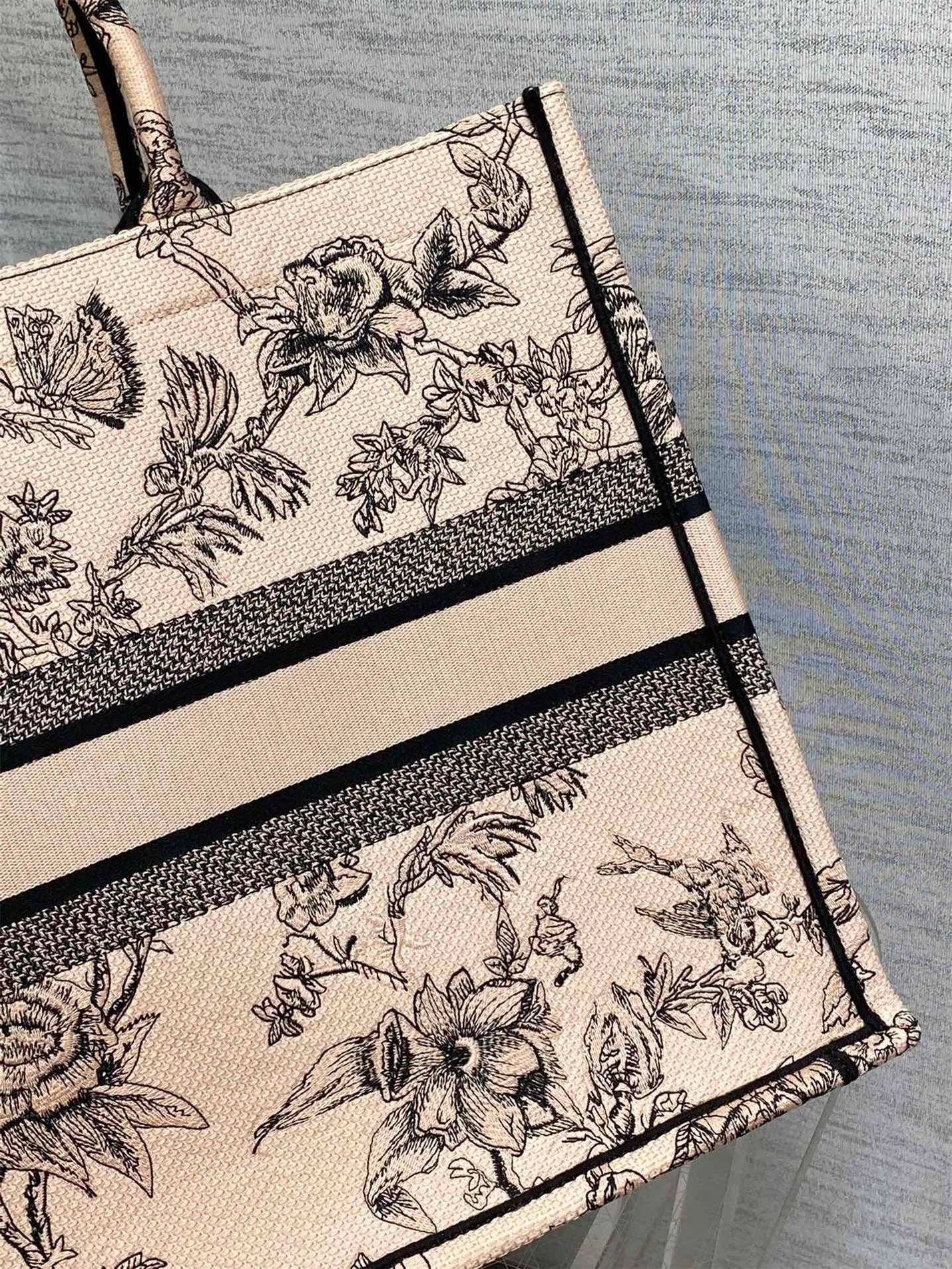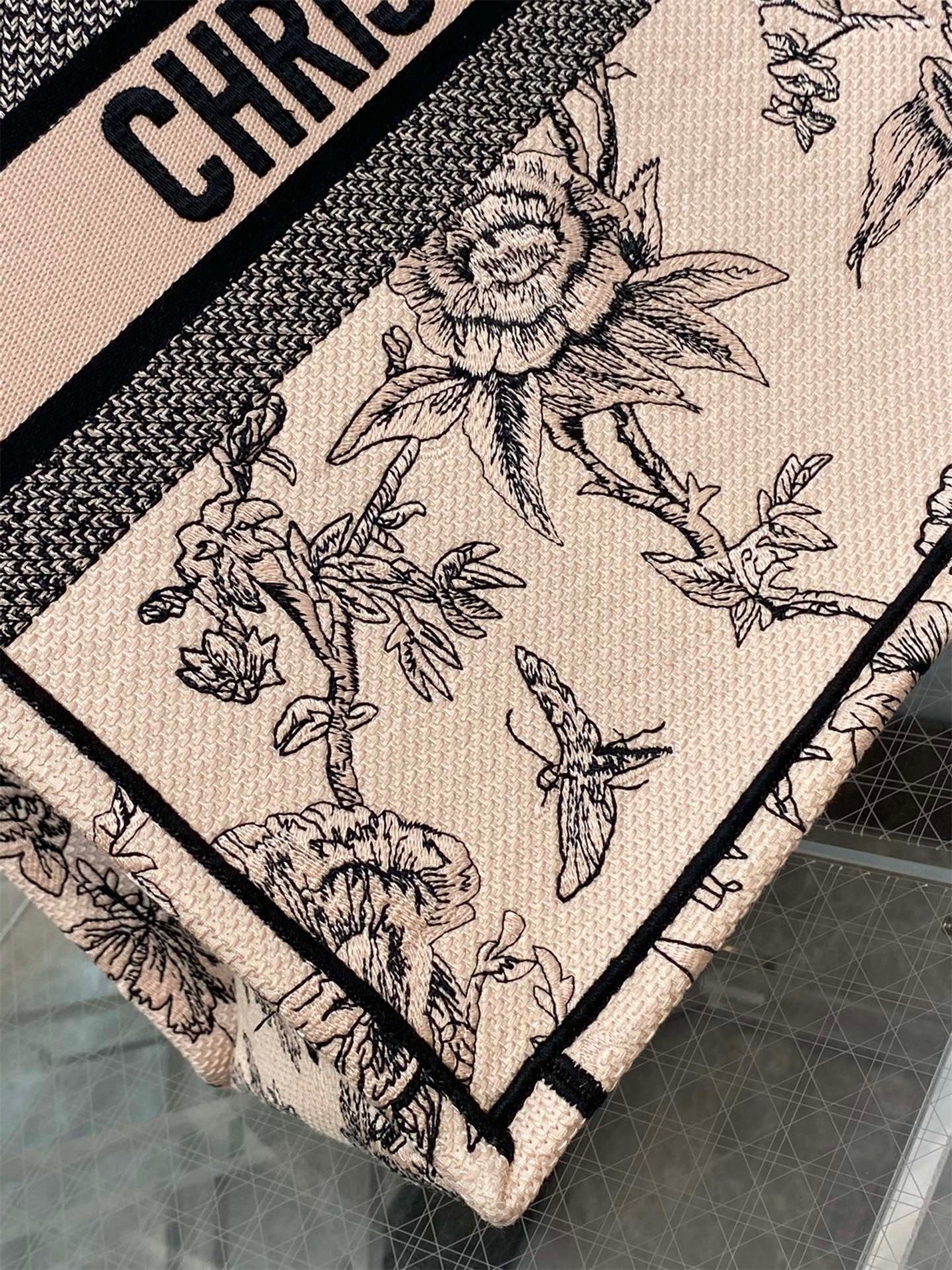 The Dior Book Tote is an original creation introduced by Maria Grazia Chiuri, Dior's Creative Director, and has become a staple of the Dior aesthetic. Designed to hold all the daily essentials, it is fully embroidered with the powder pink Dior Jardin Botanique motif and presents a romantic floral pattern inspired by Mr. Dior's beloved Granville gardens. Adorned with the 'CHRISTIAN DIOR PARIS' signature on the front, the large tote exemplifies the House's signature savoir-faire and may be carried by hand or worn over the shoulder.