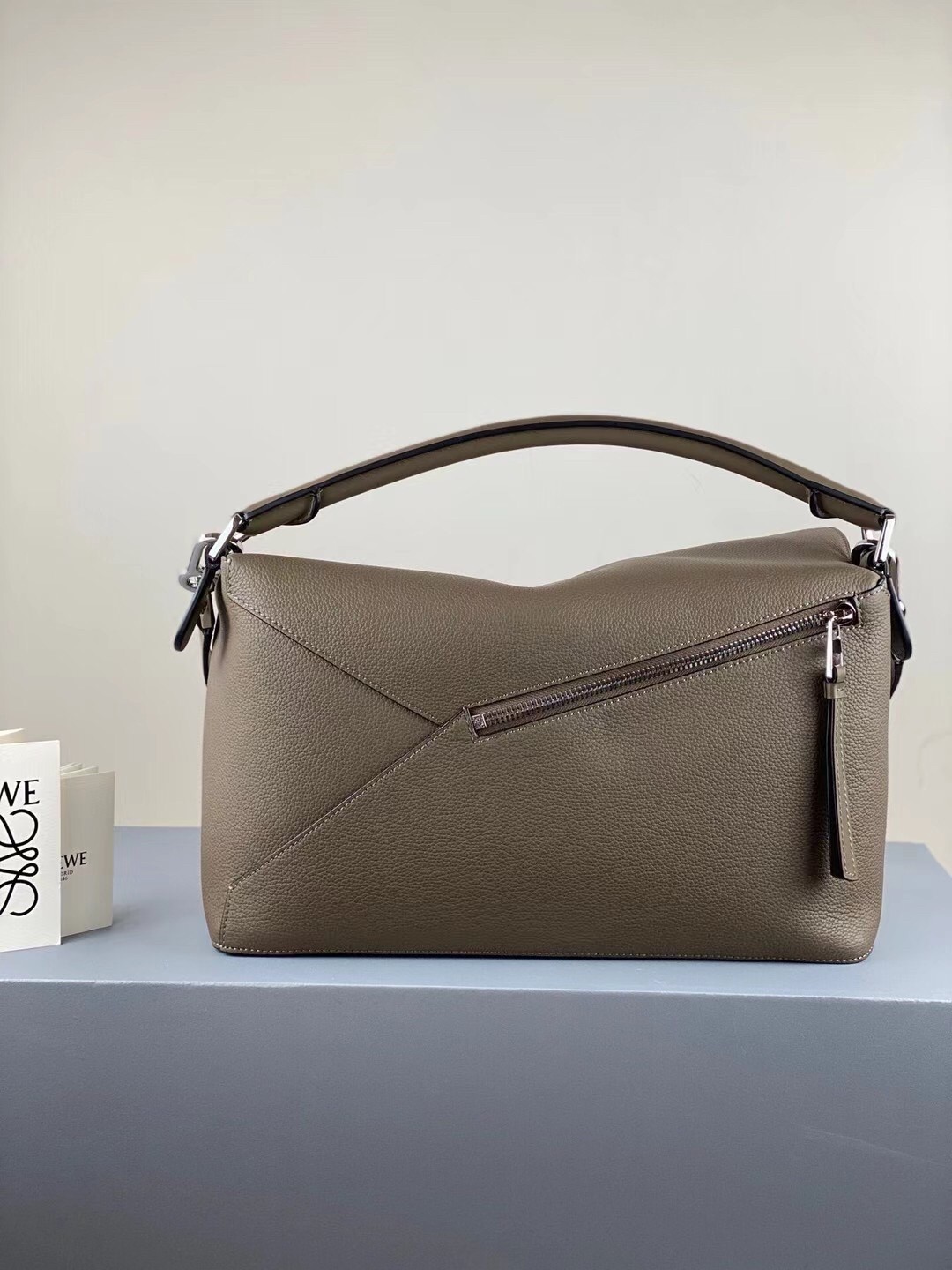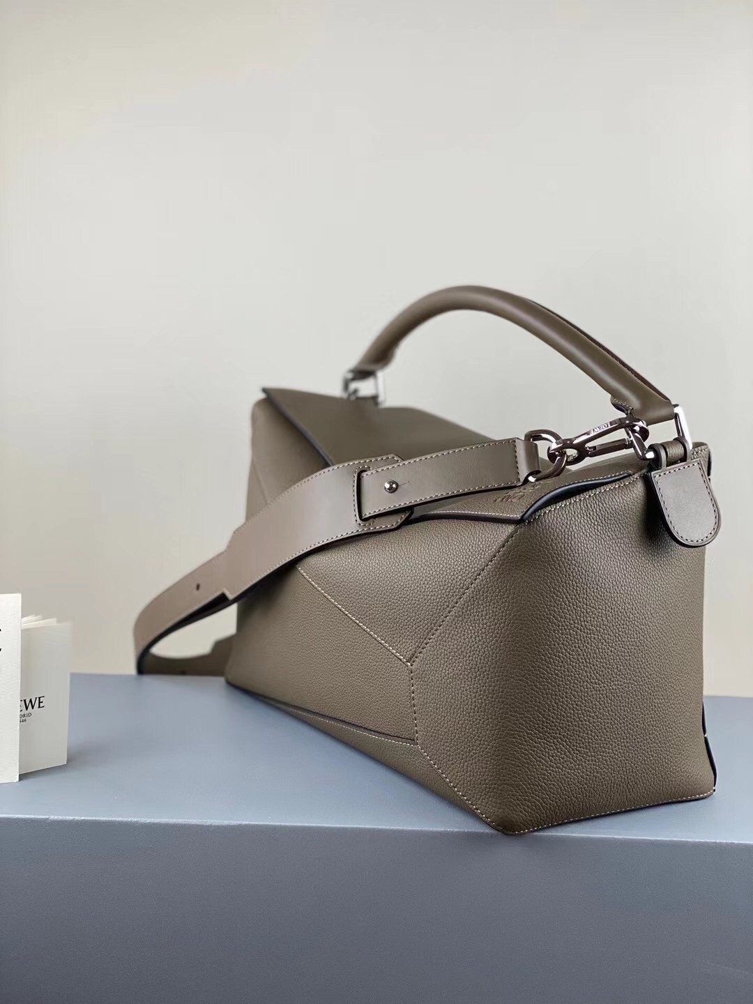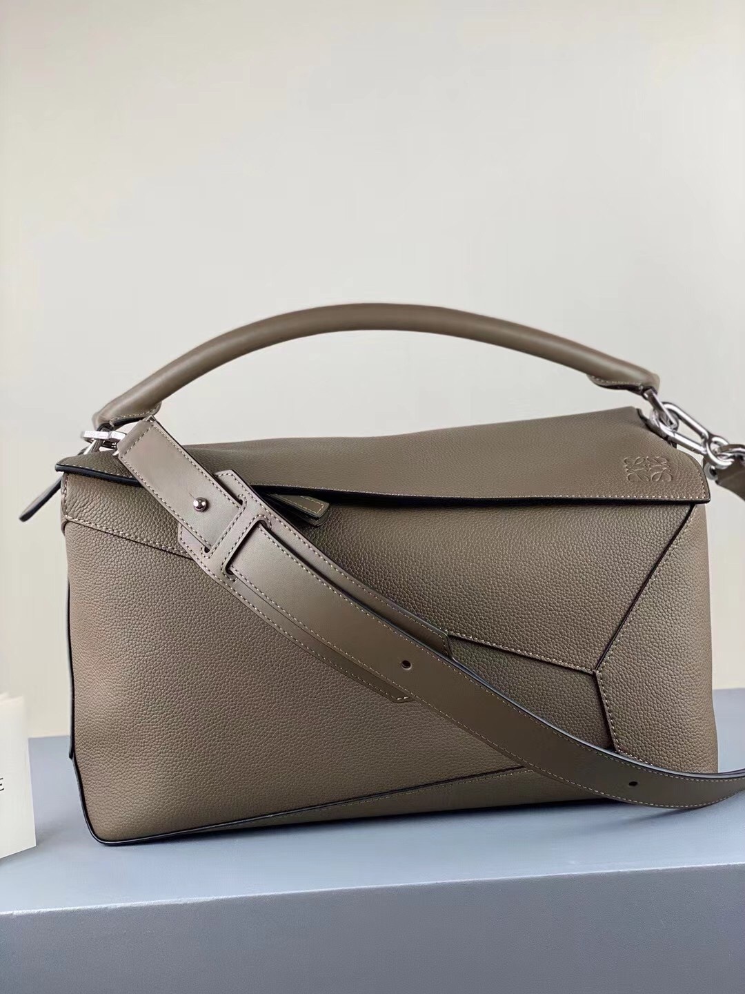 Practical in its impeccable geometric construction, LOEWE's Large Puzzle bag is boosted with precision-cut panels to echo a cuboid shape. Rendered in a construction that carries folded or collapsed, this carryall can also be held alternatively by the single handle, or with the shoulder strap.