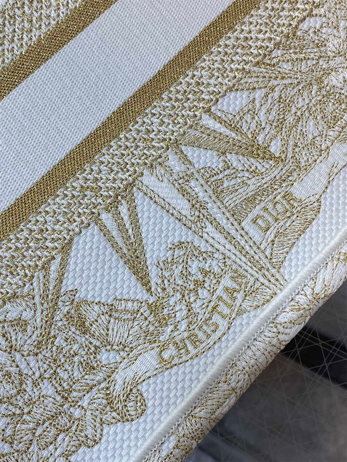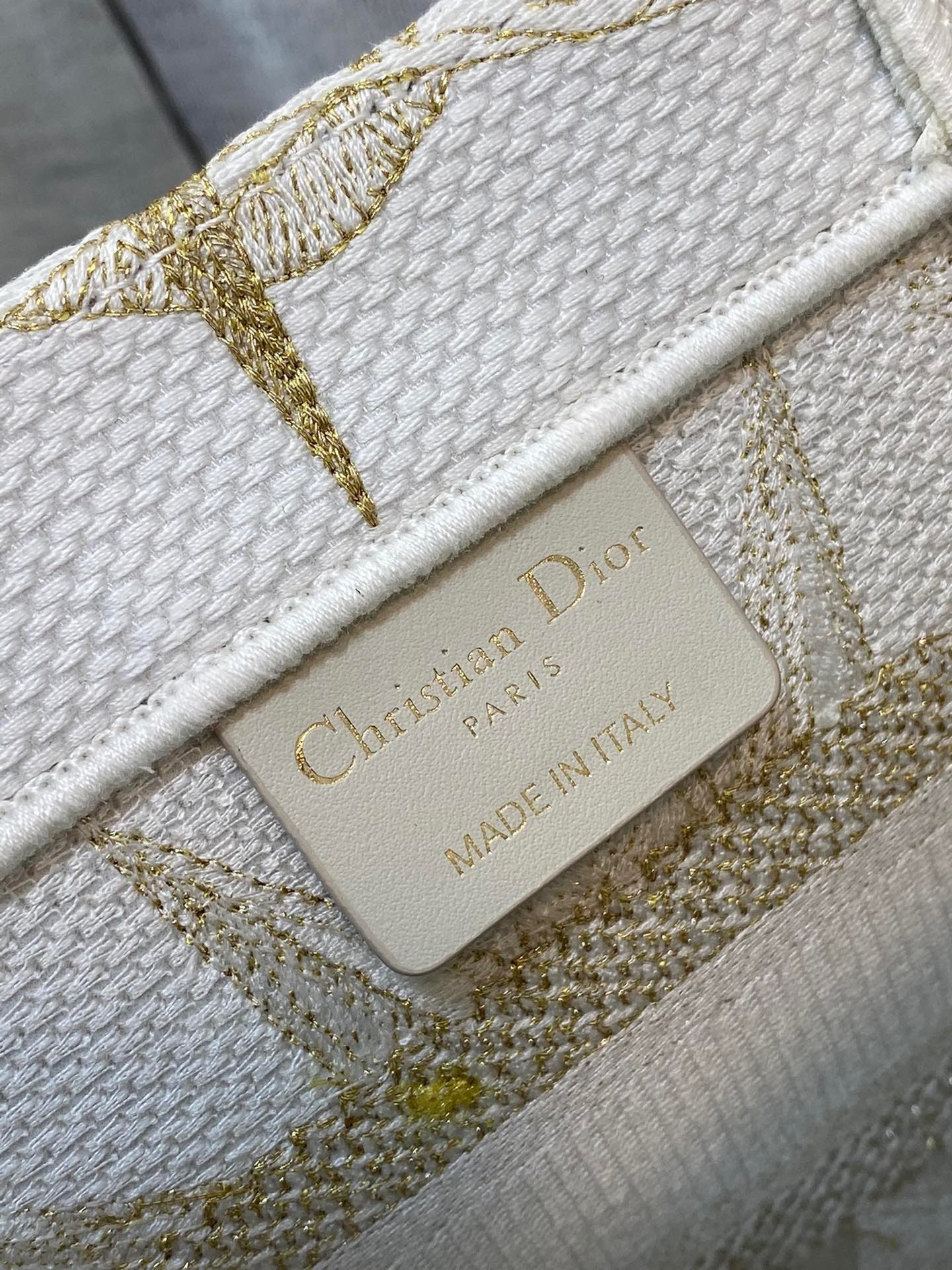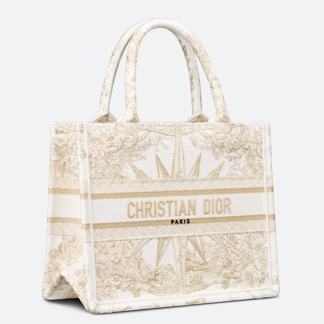 The Dior Book Tote is an original creation introduced by Dior's Creative Director, Maria Grazia Chiuri, and has become a staple of the Dior aesthetic. Designed to hold all the daily essentials, it is fully embroidered with the Rêve d'Infini motif by artist Pietro Ruffo embellished with gold-tone metallic thread, offering a dreamlike new take on Christian Dior's favorite star symbol and essential House code. Adorned with a 'CHRISTIAN DIOR PARIS' signature on the front, the small tote exemplifies the House's signature savoir-faire and may be carried by hand or worn over the shoulder.