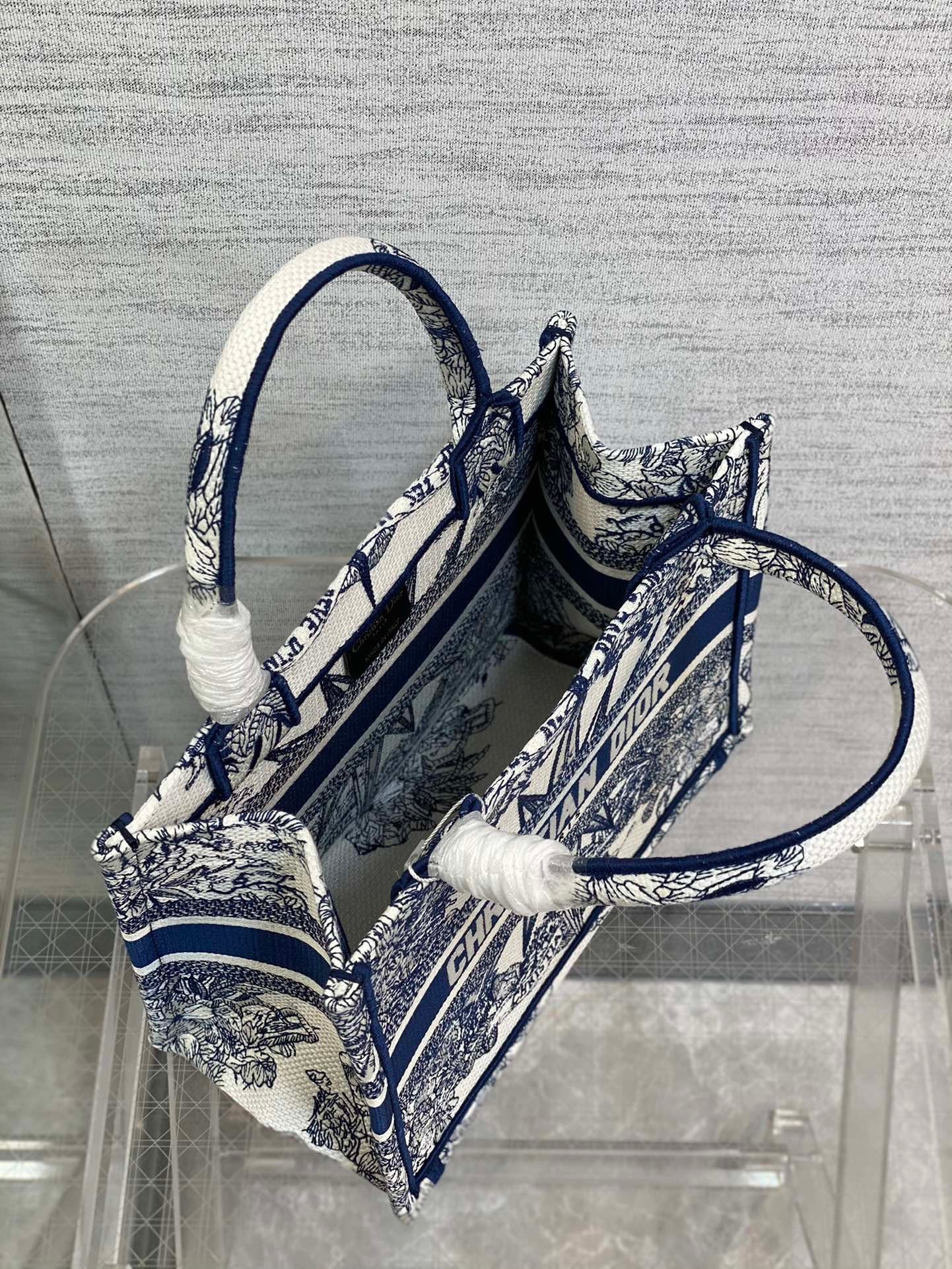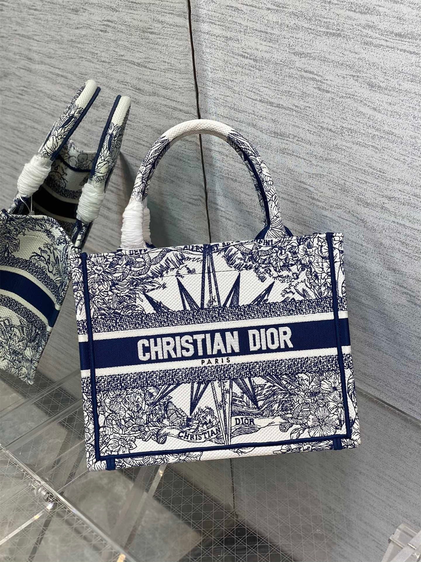 The Dior Book Tote is an original creation introduced by Dior's Creative Director, Maria Grazia Chiuri, and has become a staple of the Dior aesthetic. Designed to hold all the daily essentials, it is fully embroidered with the white and blue Rêve d'Infini motif by artist Pietro Ruff, offering a dreamlike new take on Christian Dior's favorite star symbol and essential House code. Adorned with a 'CHRISTIAN DIOR PARIS' signature on the front, the small tote exemplifies the House's signature savoir-faire and may be carried by hand or worn over the shoulder.