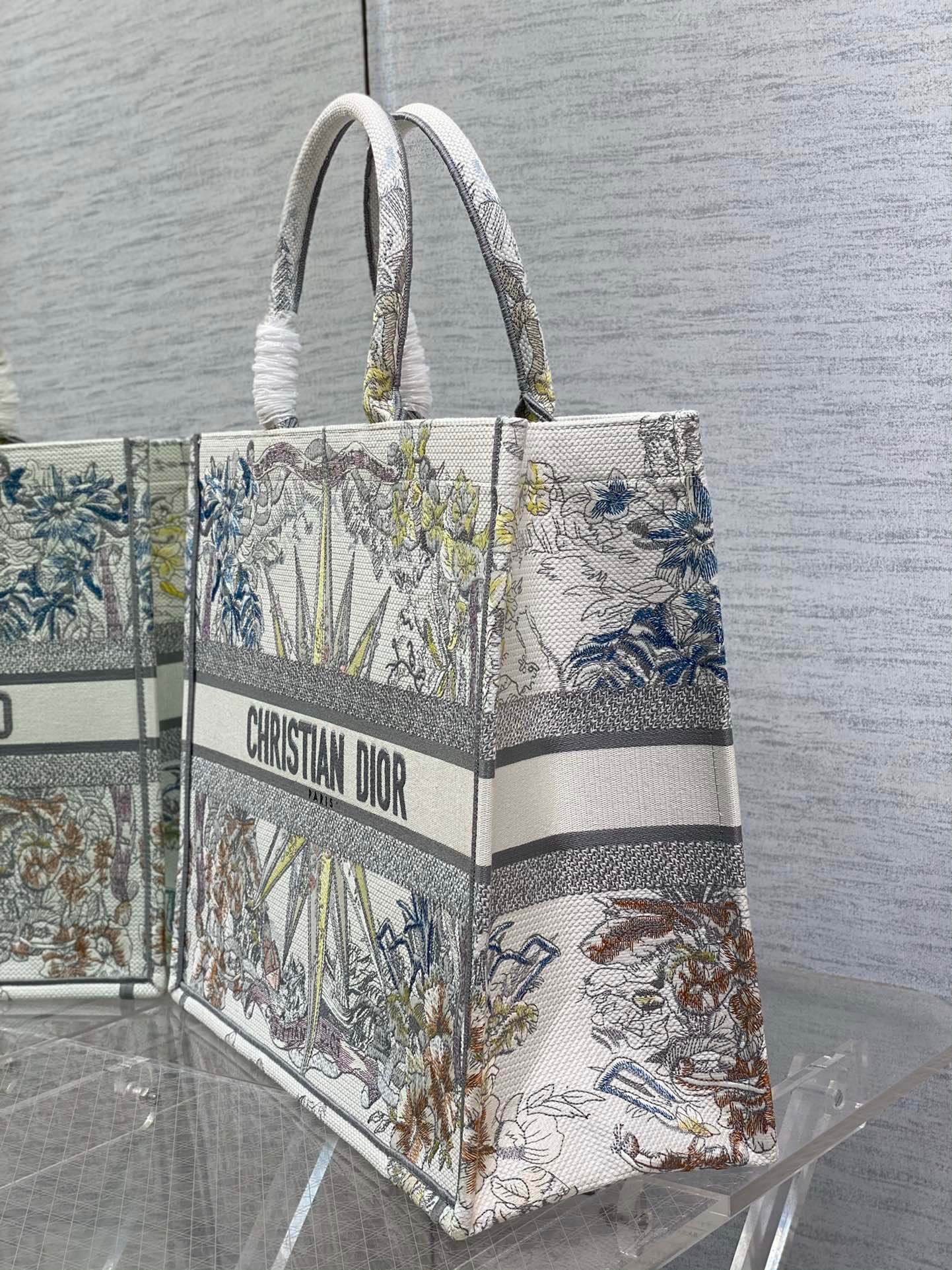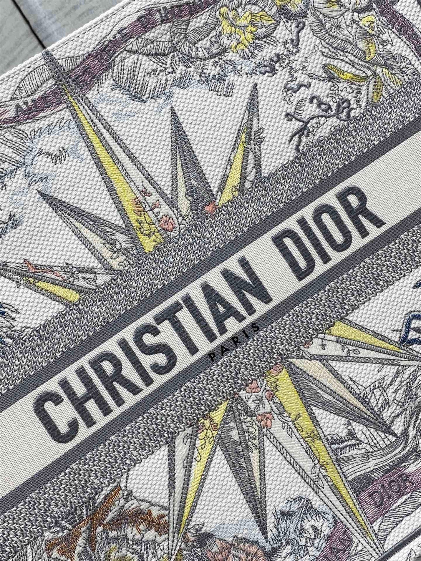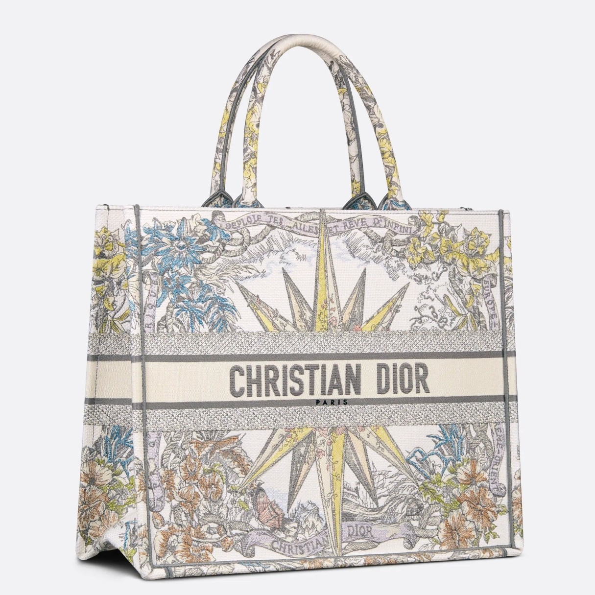 The Dior Book Tote is an original creation introduced by Dior's Creative Director, Maria Grazia Chiuri, and has become a staple of the Dior aesthetic. Designed to hold all the daily essentials, it is fully embroidered with the Rêve d'Infini motif by artist Pietro Ruffo, offering a dreamlike new take on Christian Dior's favorite star symbol and essential House code. Adorned with a 'CHRISTIAN DIOR PARIS' signature on the front, the large tote exemplifies the House's signature savoir-faire and may be carried by hand or worn over the shoulder.
