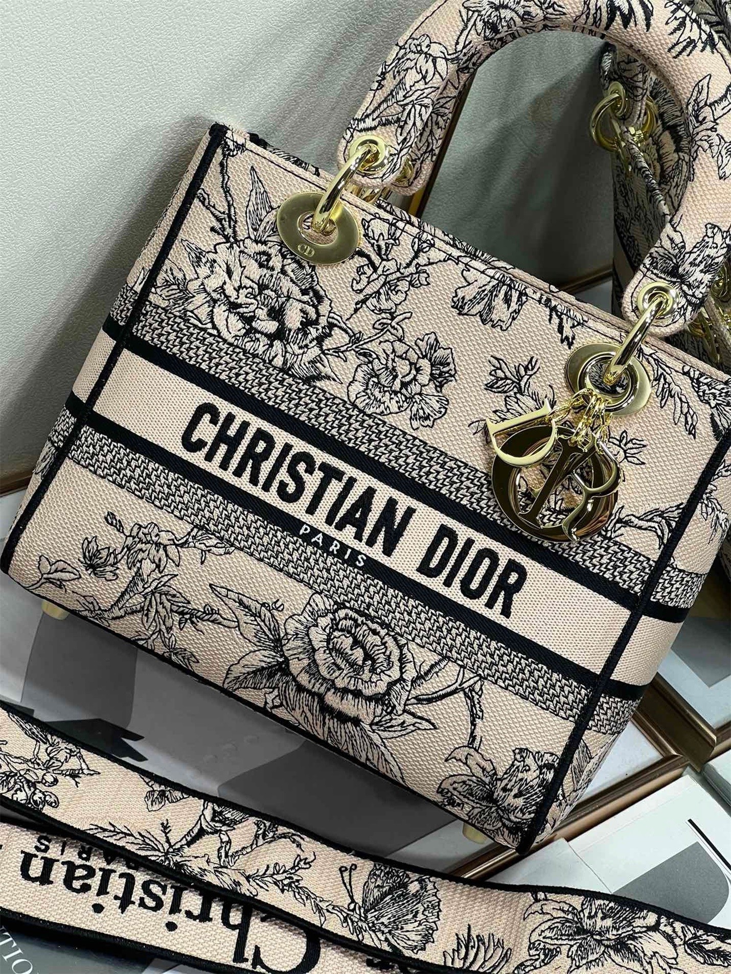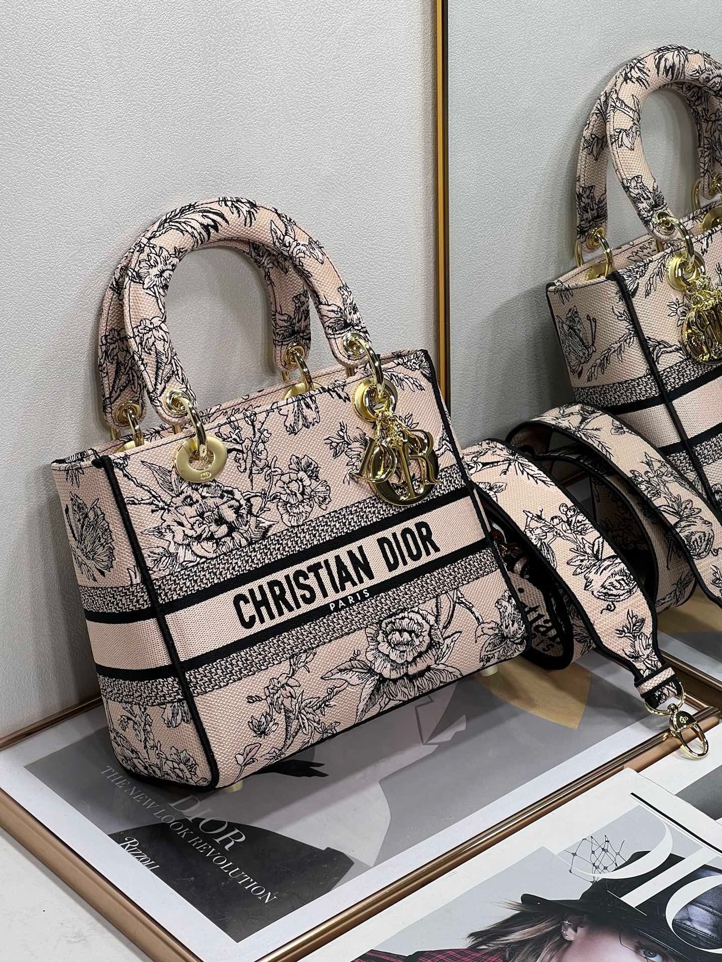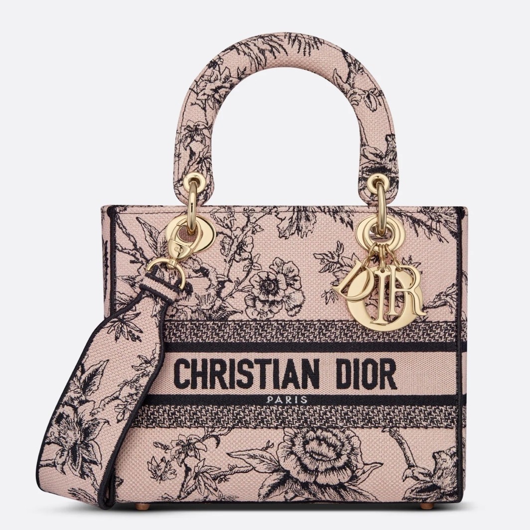 The Lady D-Lite bag combines classic elegance with House modernity. Fully embroidered with the Dior Jardin Botanique motif, it features a romantic floral pattern inspired by Granville gardens so dear to Mr. Dior. The front features a 'CHRISTIAN DIOR PARIS' signature while the 'D.I.O.R.' charms in pale gold-finish metal embellish and illuminate the silhouette. Equipped with a wide, reversible and removable embroidered shoulder strap, the medium Lady D-Lite bag can be carried by hand or worn crossbody.