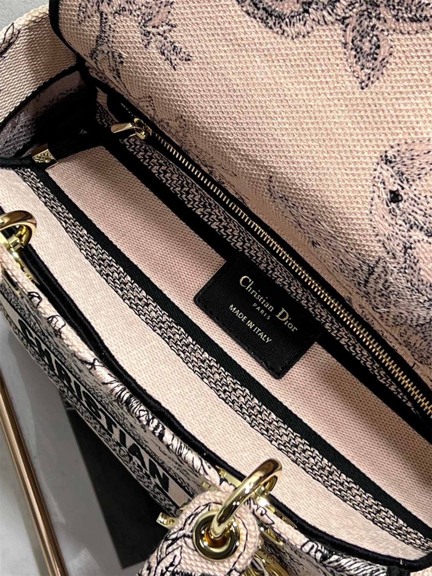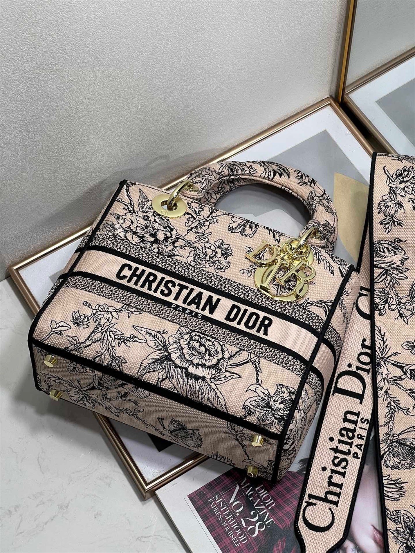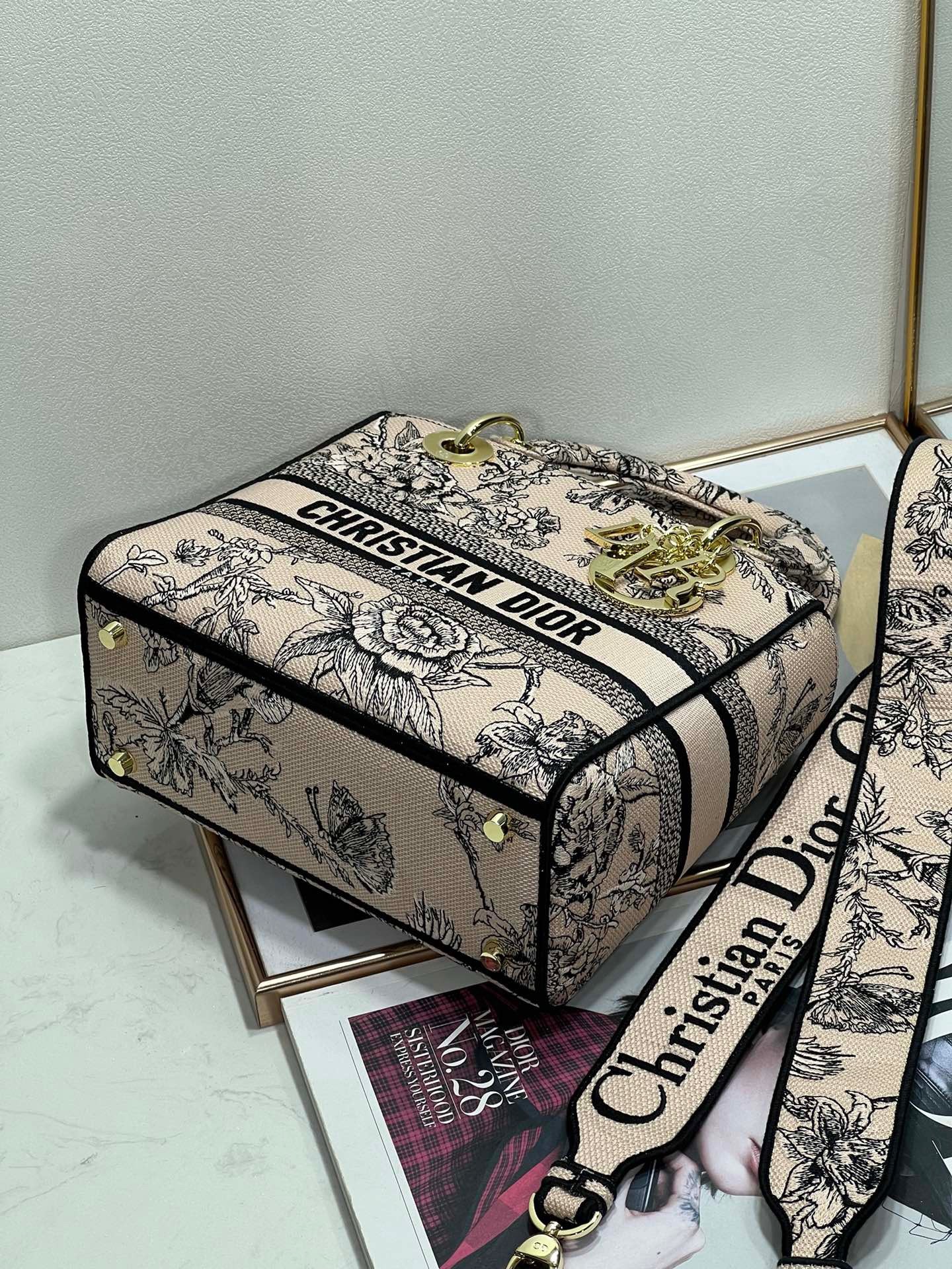 The Lady D-Lite bag combines classic elegance with House modernity. Fully embroidered with the Dior Jardin Botanique motif, it features a romantic floral pattern inspired by Granville gardens so dear to Mr. Dior. The front features a 'CHRISTIAN DIOR PARIS' signature while the 'D.I.O.R.' charms in pale gold-finish metal embellish and illuminate the silhouette. Equipped with a wide, reversible and removable embroidered shoulder strap, the medium Lady D-Lite bag can be carried by hand or worn crossbody.