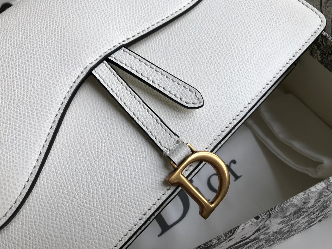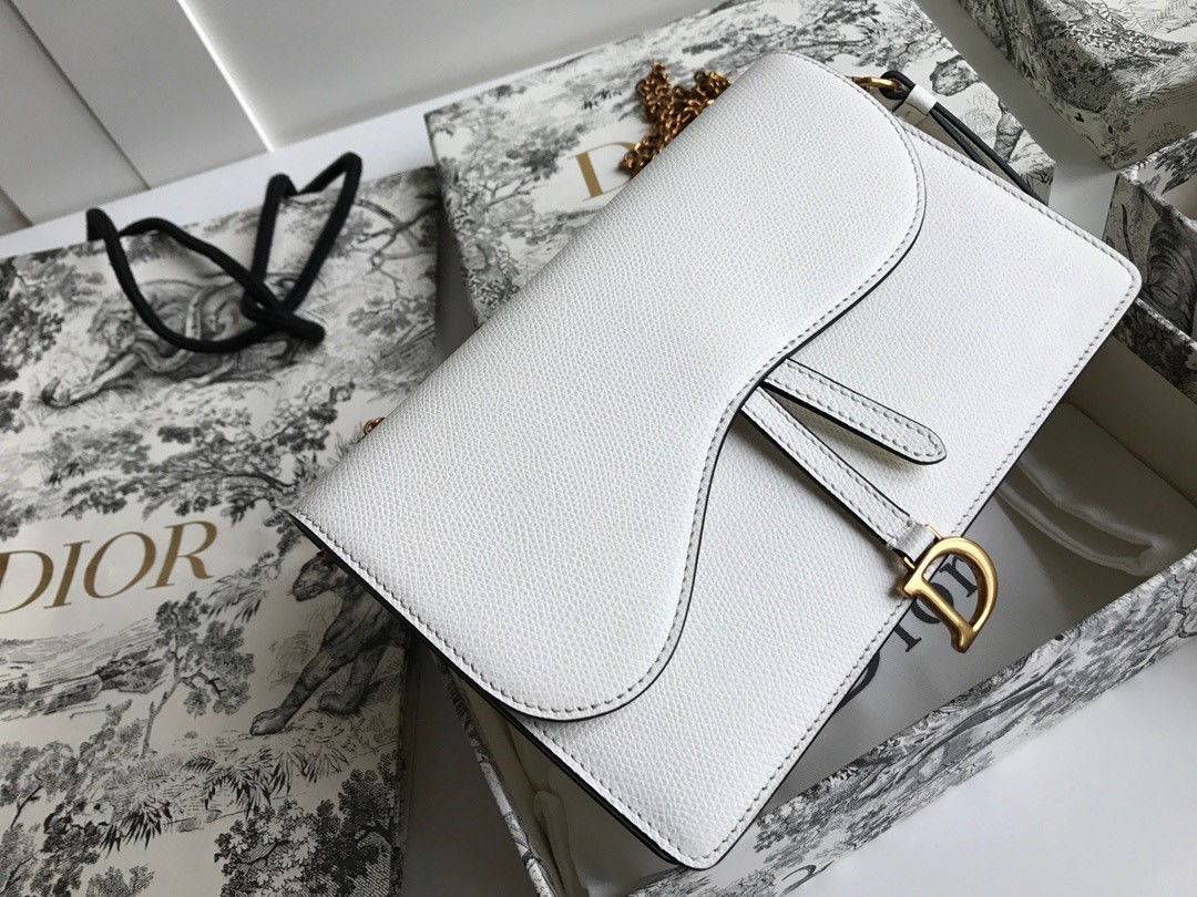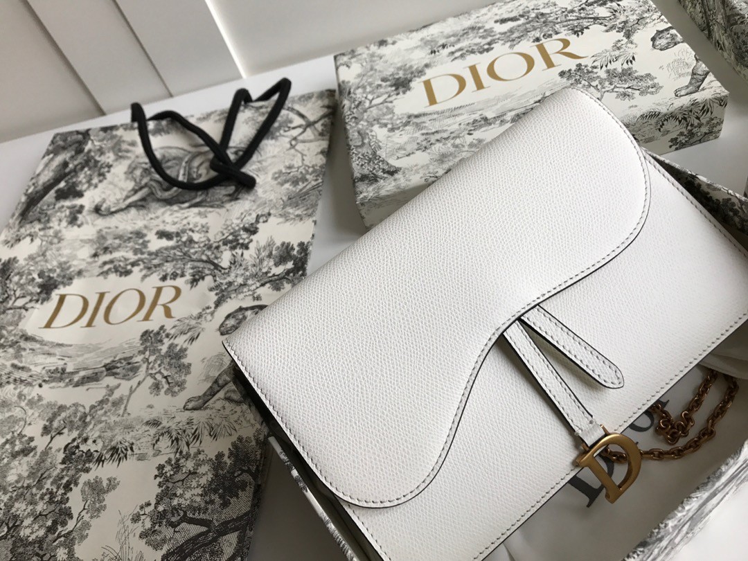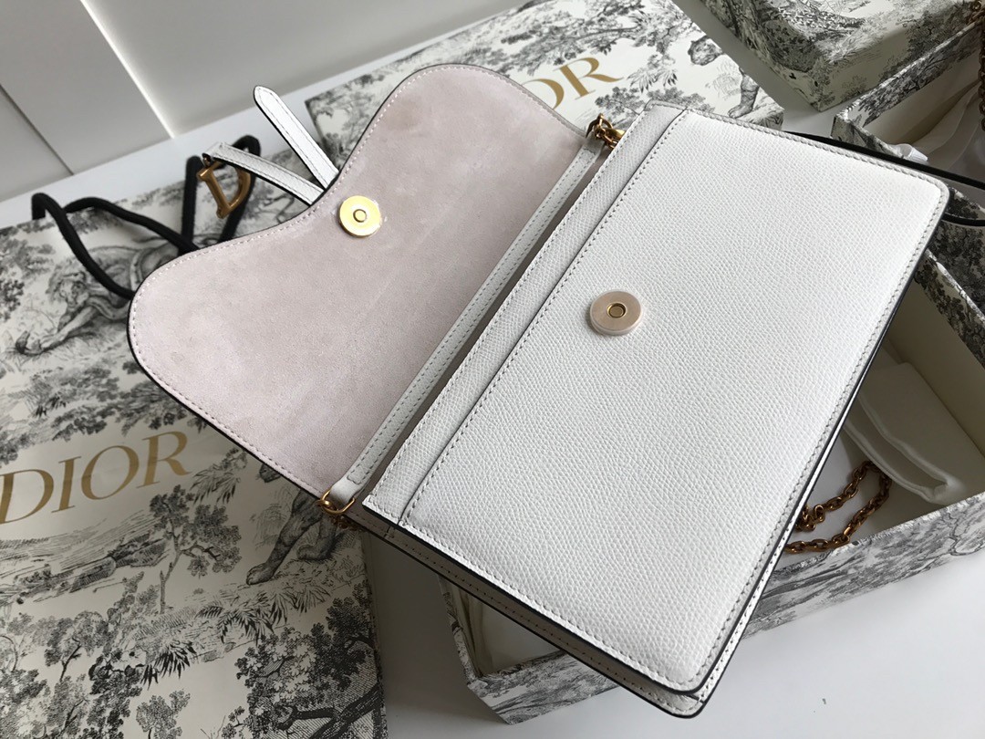 The Saddle pouch presents a modern design crafted in grained calfskin. It pays tribute to the Saddle codes, with its asymmetrical flap and metallic 'D' stirrup magnetic clasp. Featuring a removable chain, the pouch may be carried by hand, worn over the shoulder or crossbody for day or evening attire.